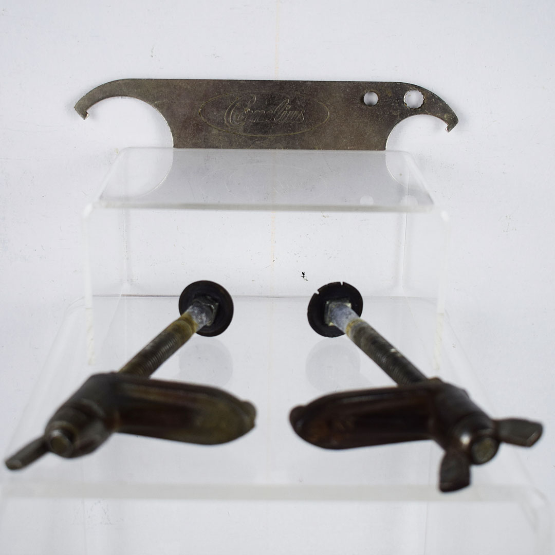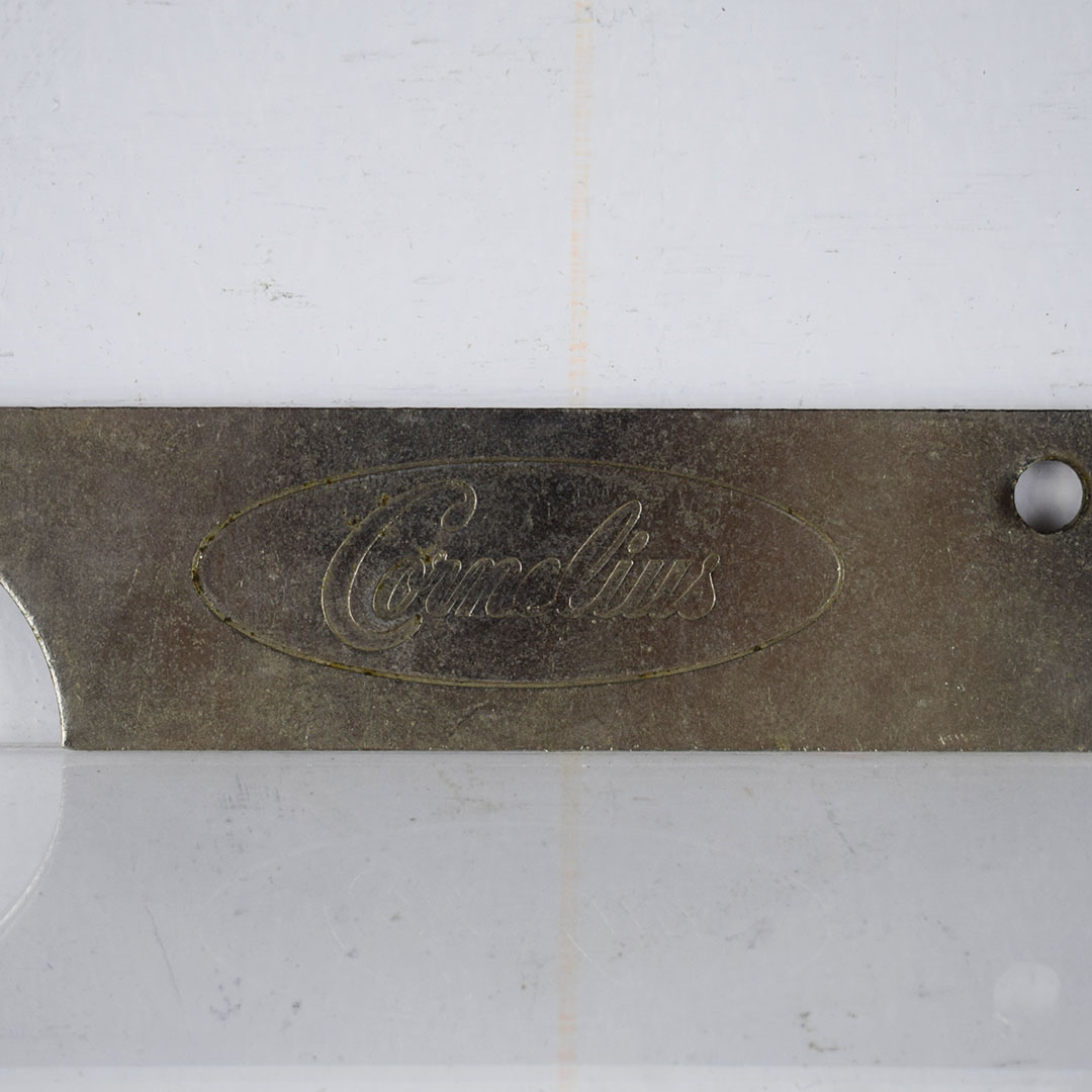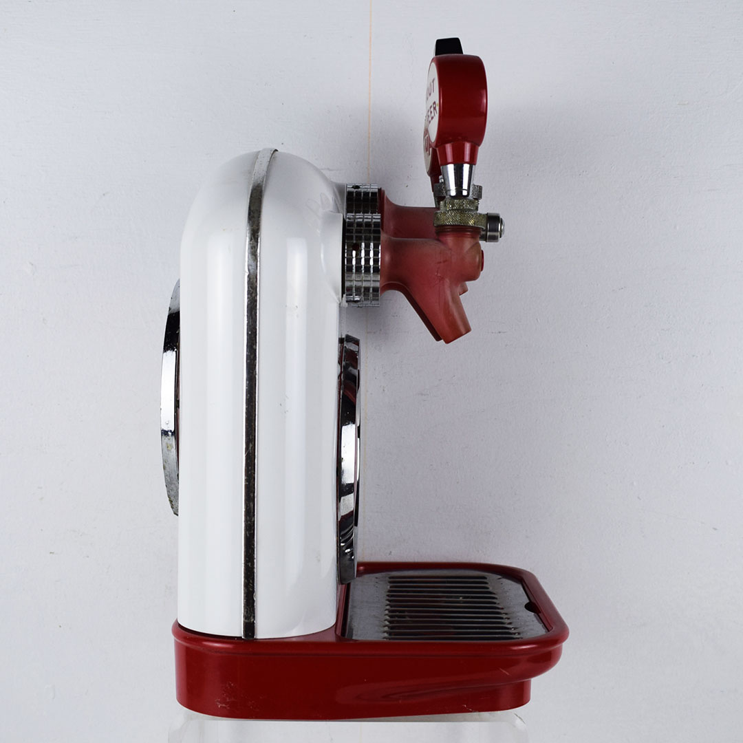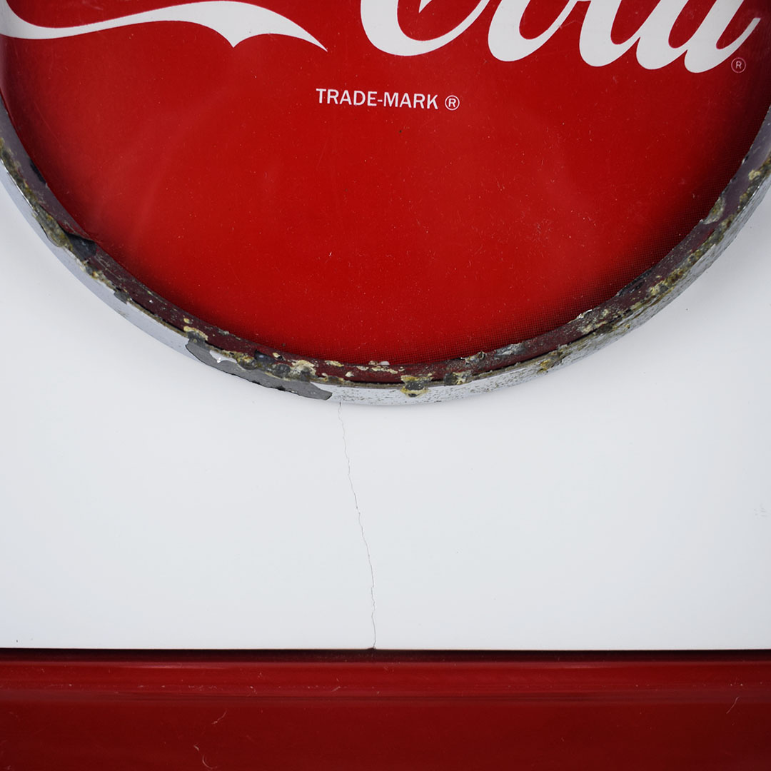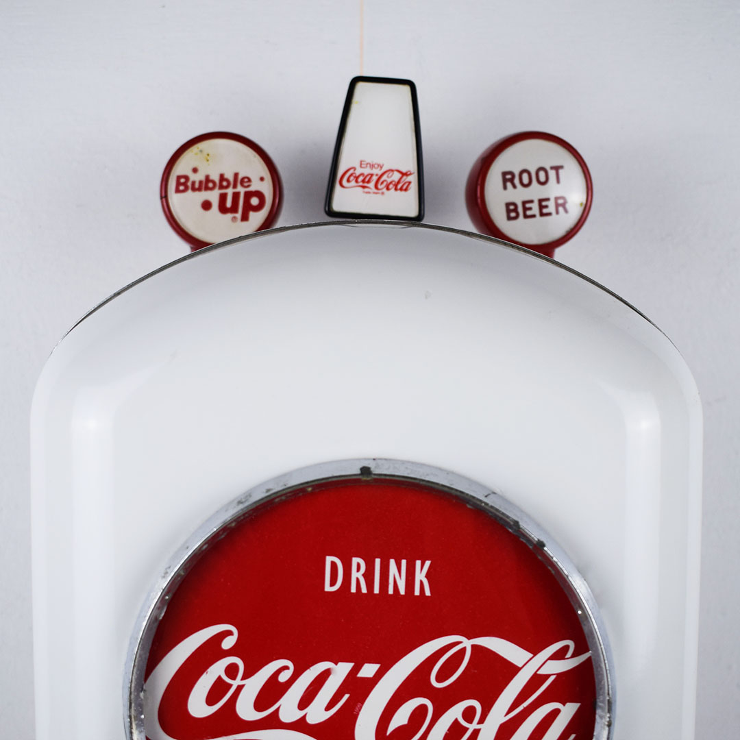 This small Cornelius soda dispenser was dubbed “Tombstone” by its users due to how it appeared when attached to the top of the soda fountain counter in the 1950s. The simple design allowed three different sodas to be dispensed and left plenty of room on the counter for customers to eat. The red Coca-Cola button is on each side, with one side only reading Coca-Cola and the other reading “Drink Coca-Cola Prepared By The Bottler Of Coca-Cola.” Each chrome band has some oxidation, with one side worse. The fountain side of the dispenser has a crack in the housing on the lower right side of the original housing. The three soda dispensers are Root Beer, Coca-Cola, and Bubble Up. All three pull nicely, but the Root Beer one has a crack where it attaches. This dispenser still retains the original metal grate and the original mounting brackets, which are marked “Cornelius.” It’s a super lovely dispenser that is seldom seen complete. 21157-EEP