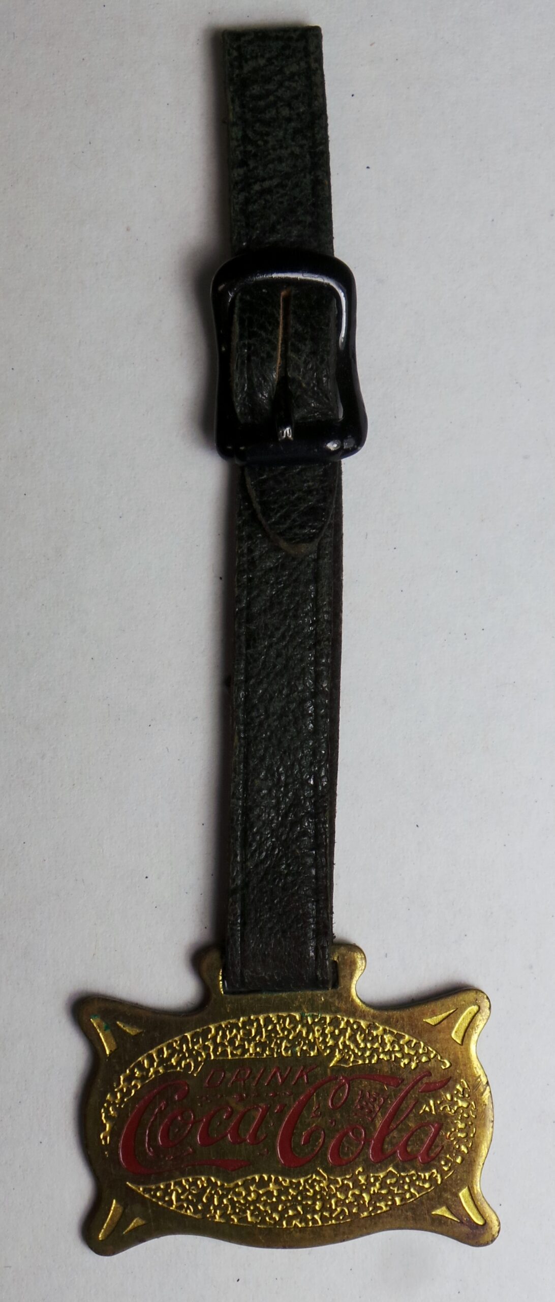 Hard to find in such nice condition, this brass watch fob, with its original leather strap, dates from the 1920s and is inscribed “Drink Coca Cola” in red enamel on the front. The fob measures about 1 1/4 inches tall by 1 5/8 inches wide and is in excellent condition with some small nicks on the edges and several light scratches on the back.This and other Coca Cola pieces are from the Thom Thompson Estate. Mr. Thompson collected for over 50 years and was a Coke Bottler himself. He received a “Special Thanks” in Allan Petretti’s Coca Cola Price Guide as follows: “Thom has always been my number one supporter. Ever since the first edition, he has unselfishly offered his knowledge and collection to help make this book better. Thom and Frances are among the countries top collectors. This book wouldn’t be what it is today without their help.” This is a once in a lifetime opportunity to add a piece with such history to your collection. 16710-QTP