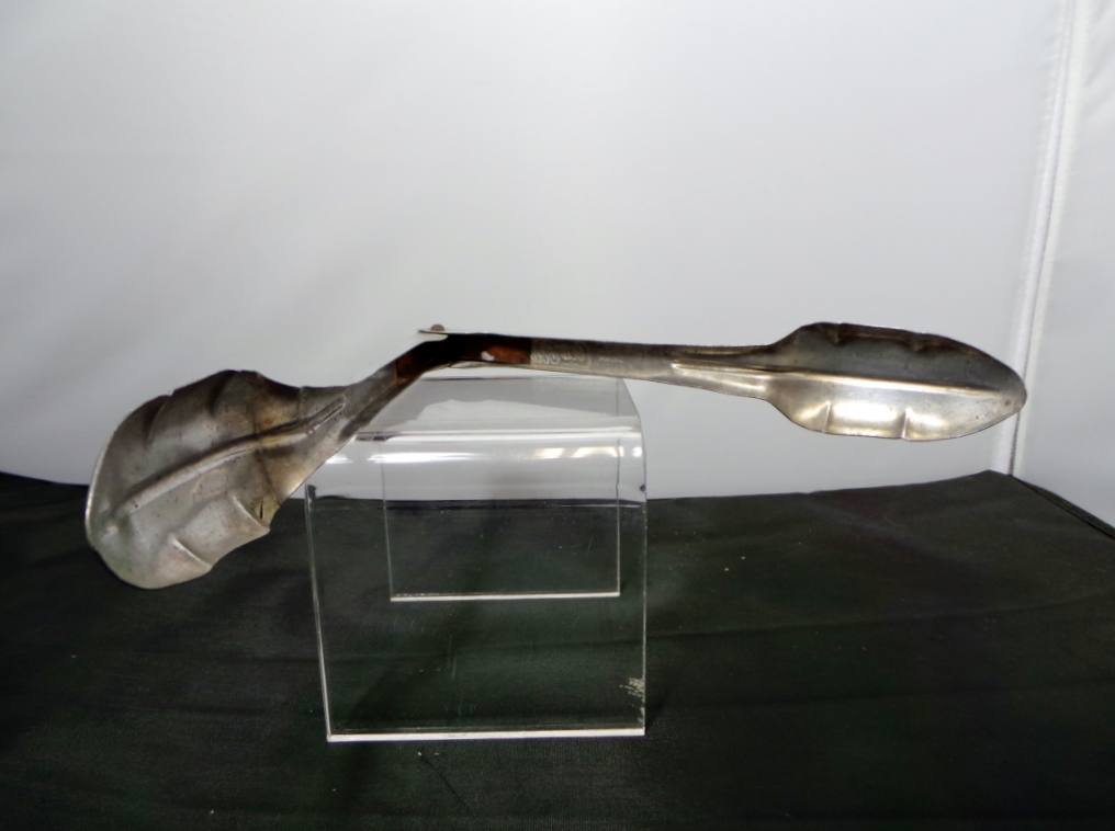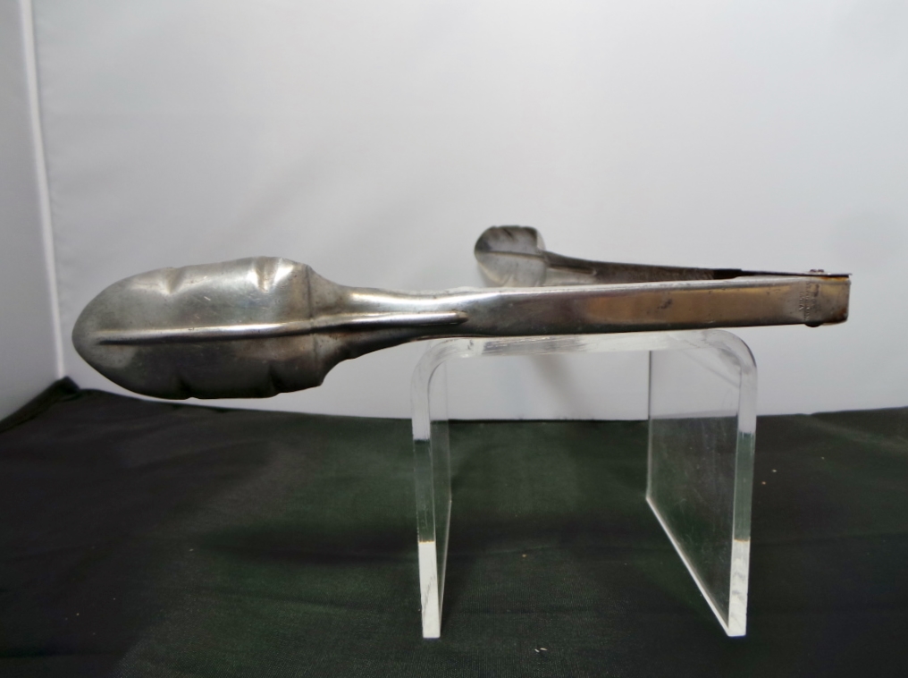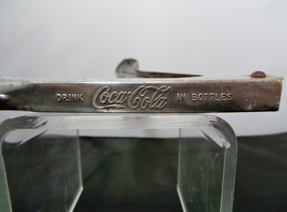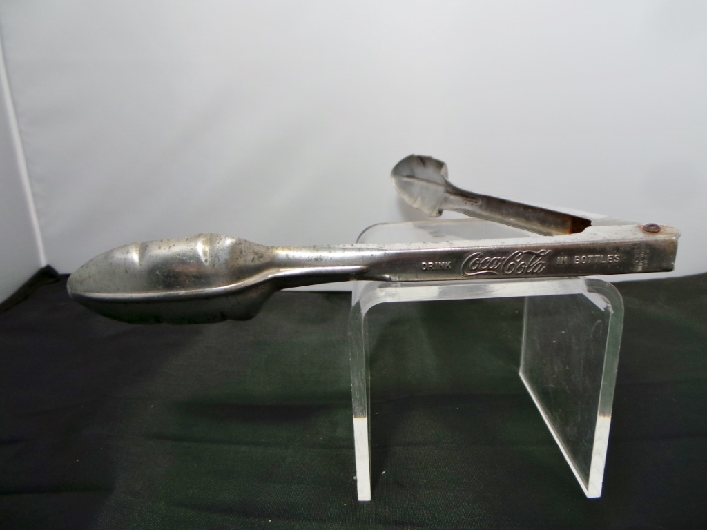 Manufactured by B & B in St. Paul, MN. in the late 1940s, these hard to find aluminum ice cube tongs, embossed “Drink Coca Cola In Bottles” on the handle, would have been used at a soda fountain or diner originally. The tongs measure about 9 1/4 inches long by 1 1/4 inches wide and are in good, well used condition with a crease at the base of one of the bowls plus scratches, wear, and spots of corrosion. 17440-81TP
