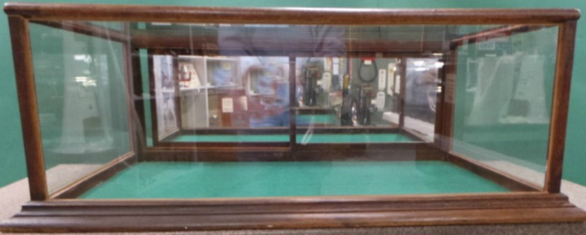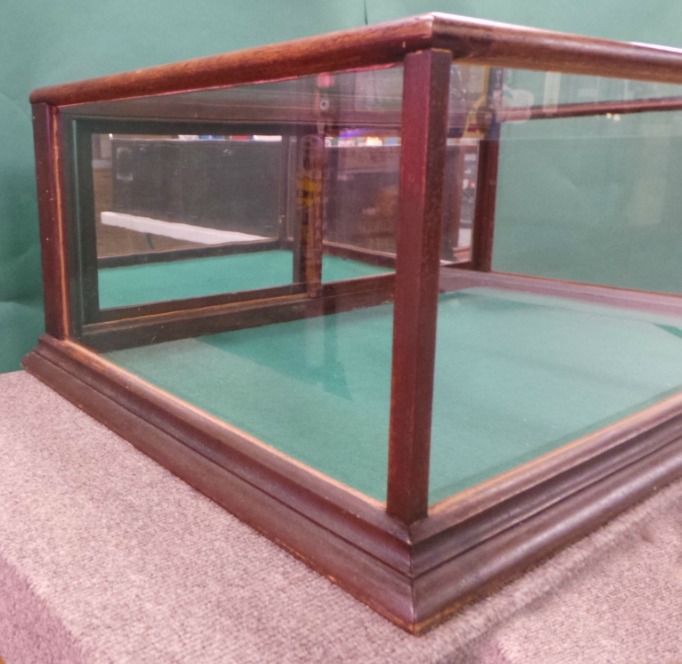 This walnut framed flat top show case measures 13 inches tall by 36 inches wide by 24 inches deep and has two sliding rear doors with mirror fronts. It dates from around the turn of the 20th century and is a great size for a table top display. It is in excellent condition with its original finish, mirrors, and side glasses. The top glass and front glass appear to have been replaced. THIS IS NOT A STANDARD SHIPPABLE ITEM. IT WILL REQUIRE A THIRD PART SHIPPER. Of course, we love customers, so you are more than welcome to pick it up at our location and browse our two stores! 8650-31WTP