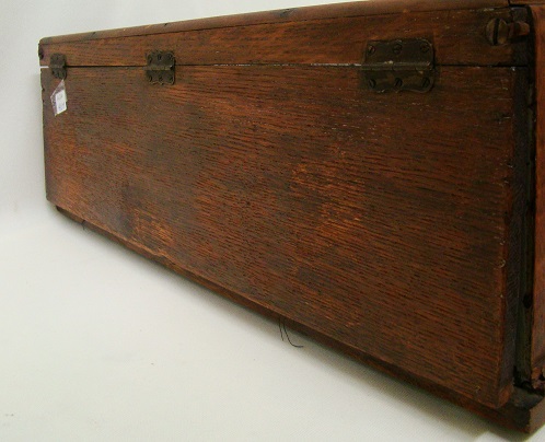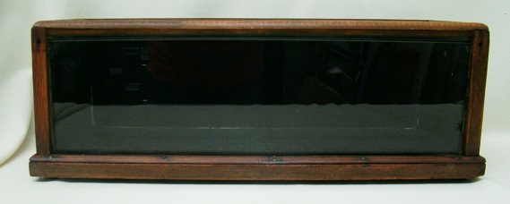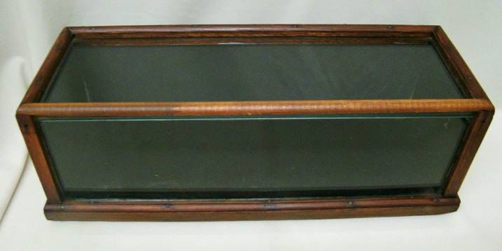 This tiny counter top showcase dates from around the turn of the 20th century and is made primarily of oak. It has a glass top and front with wooden panels on the sides with a rear lift door, half round moldings on the top, and quarter round moldings on the front and sides. It may be a salesman’s sample, but I think that it’s more likely a case to display a specific product on a store counter. The case measures 6 1/2″ tall by 18 3/4″ wide by 6 1/2″ deep and is in excellent condition with replaced glass and a replaced front top molding. The interior has been lined with black velvet. THIS IS NOT A STANDARD SHIPPABLE ITEM. IT WILL REQUIRE A THIRD PART SHIPPER. 14356-41QUT