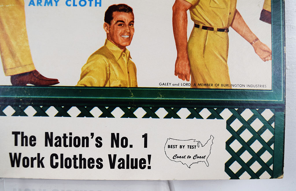 Dating from the 1950’s, this cool easel back cardboard display sign let customers know that genuine Cramerton Army Cloth clothing is suitable for work wear and casual wear! The sign is designed to mimic a billboard you would see on the highway, complete with green lattice work at the bottom. You can see that the bottom area contains the logo of the company that provides the clothing to the store, “Test”. Test made clothes specially to work in during the 1950’s. Some light wear can be seen on the outer edges of this easel back counter sign. 20205-50001