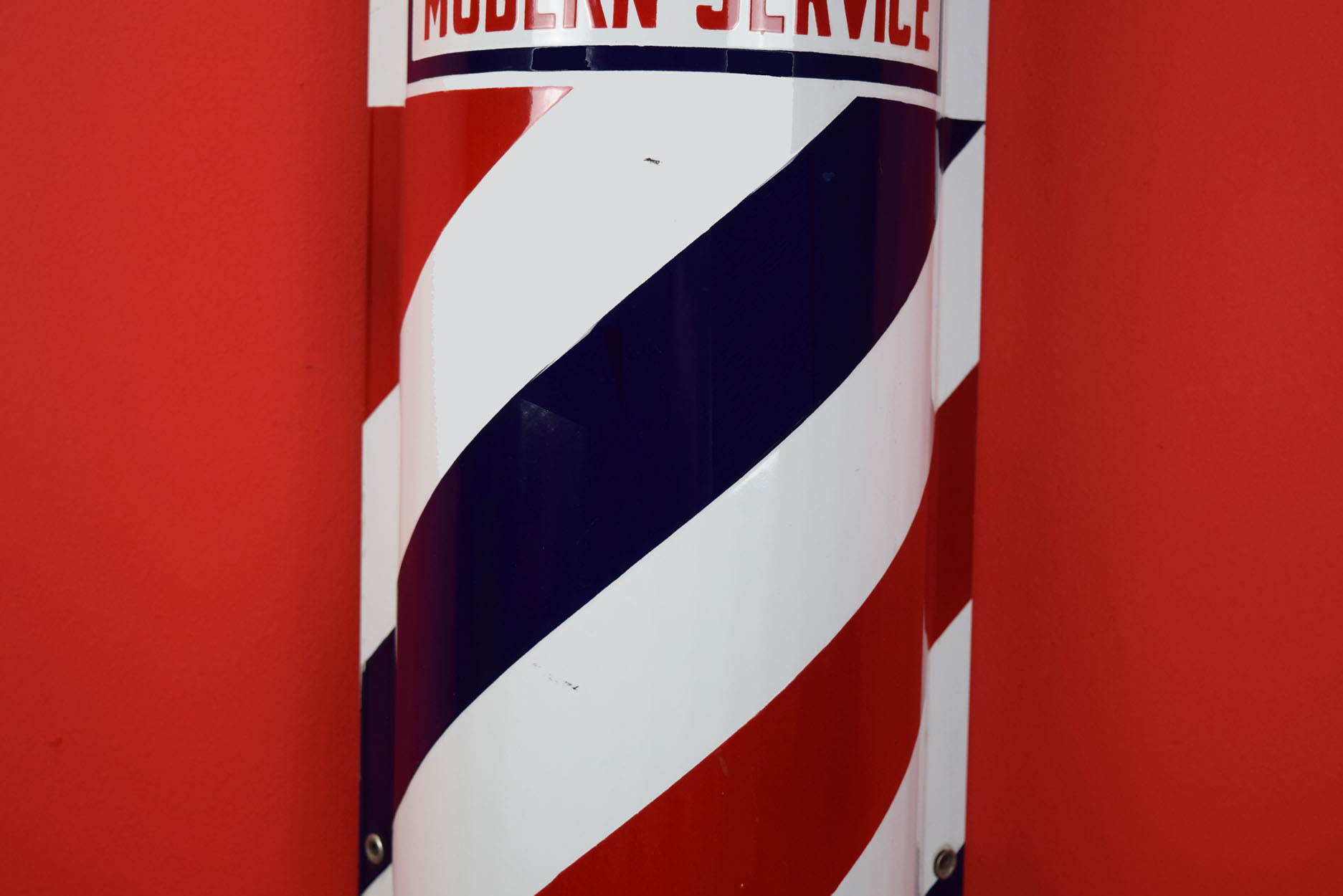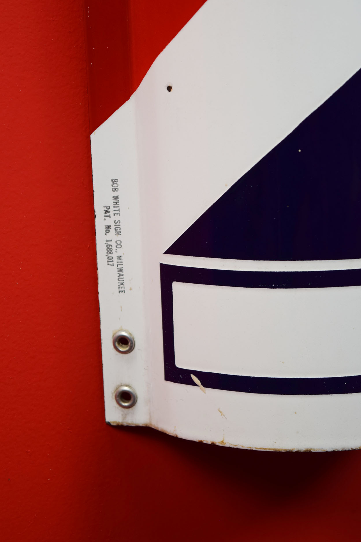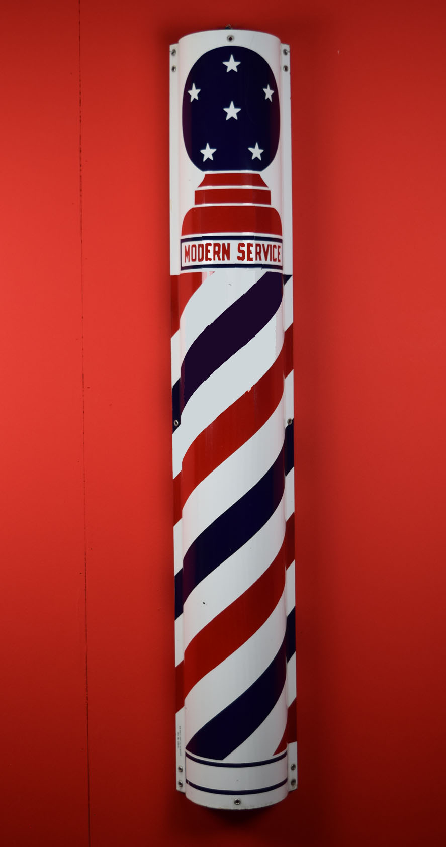 Just like some iconic brands, when you see a red, white, and blue striped sign, you naturally think of a barber shop. This curved porcelain sign does not have the words Barber Shop on it, but it does have the barber pole on it, along with “Modern Service” at the top. The top of the pole is in blue with six stars on it. The sides of the sign are flared with five mounting holes on each side with the original aluminum grommets on them. It also has a mounting hole at the very top and bottom in the curved part of the sign. Four chips are on the sign with a thin scratch up top. The scratch starts at the top edge of the sign and runs into the blue part of the pole. All four of the chips are in the white part of the sign and could be touched up if the buyer decides to. The lower left flange of the sign is marked “Bob White Sign Co., Milwaukee” and “Pat. No. 1,6888,017”. This huge sign measures 48 inches tall by 8 inches wide. 19069-QWPP