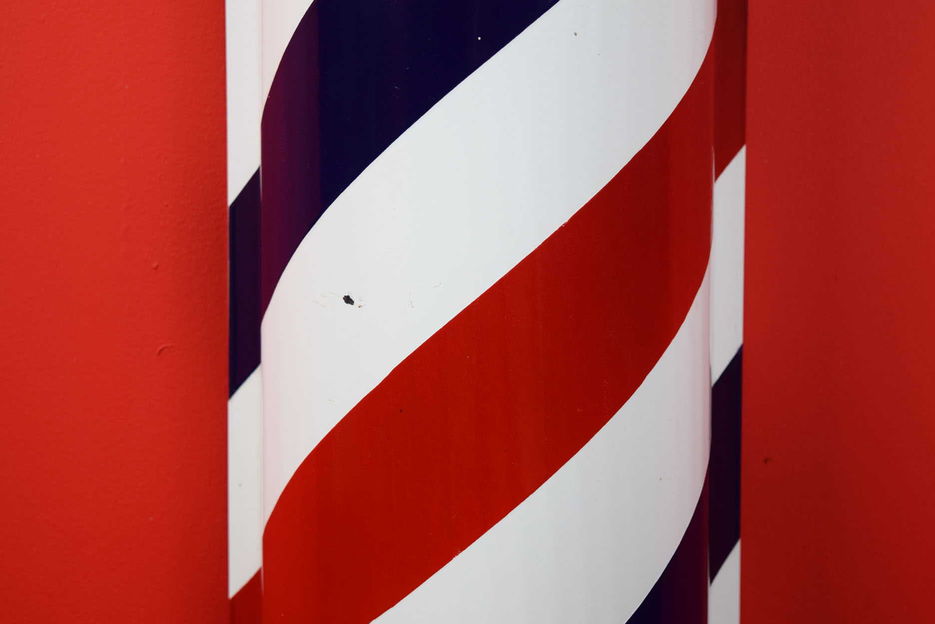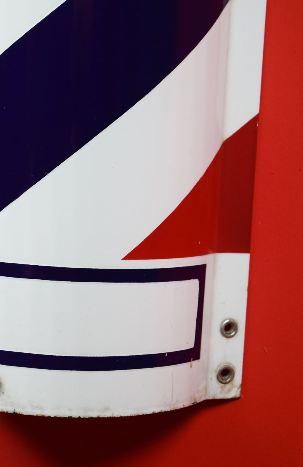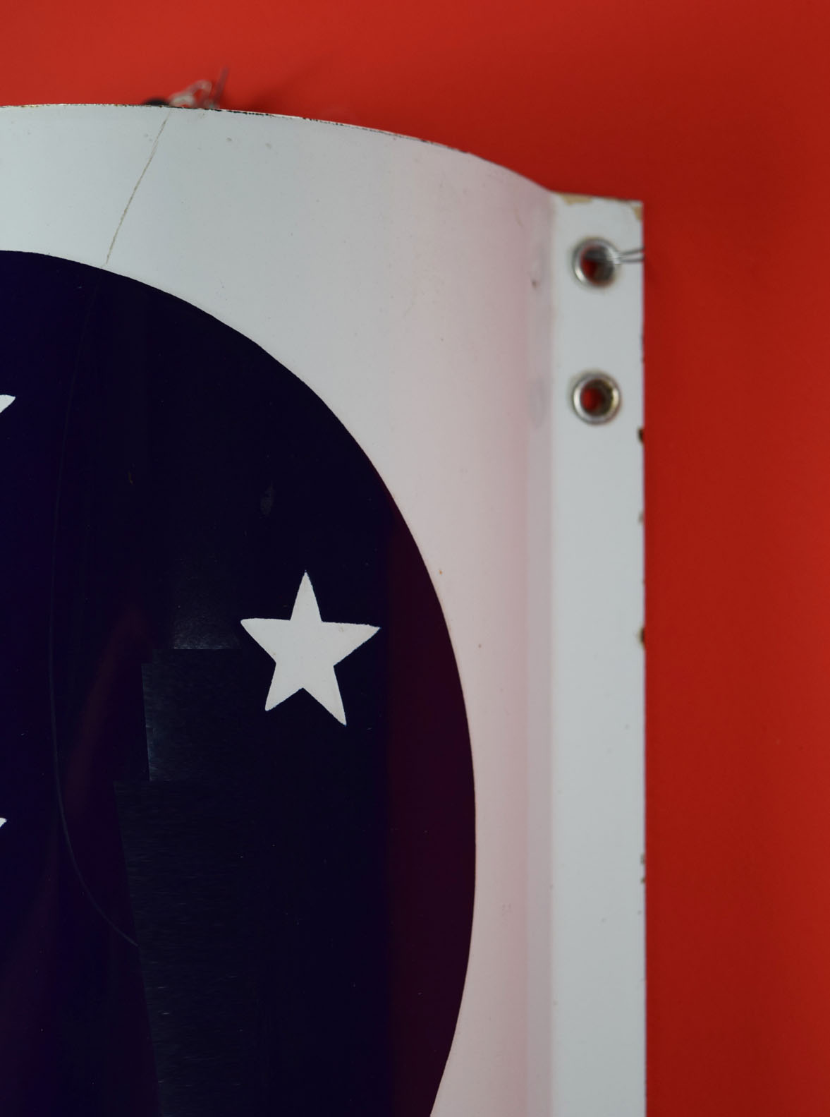 Just like some iconic brands, when you see a red, white, and blue striped sign, you naturally think of a barber shop. This curved porcelain sign does not have the words Barber Shop on it, but it does have the barber pole on it, along with “Modern Service” at the top. The top of the pole is in blue with six stars on it. The sides of the sign are flared with five mounting holes on each side with the original aluminum grommets on them. It also has a mounting hole at the very top and bottom in the curved part of the sign. Four chips are on the sign with a thin scratch up top. The scratch starts at the top edge of the sign and runs into the blue part of the pole. All four of the chips are in the white part of the sign and could be touched up if the buyer decides to. The lower left flange of the sign is marked “Bob White Sign Co., Milwaukee” and “Pat. No. 1,6888,017”. This huge sign measures 48 inches tall by 8 inches wide. 19069-QWPP