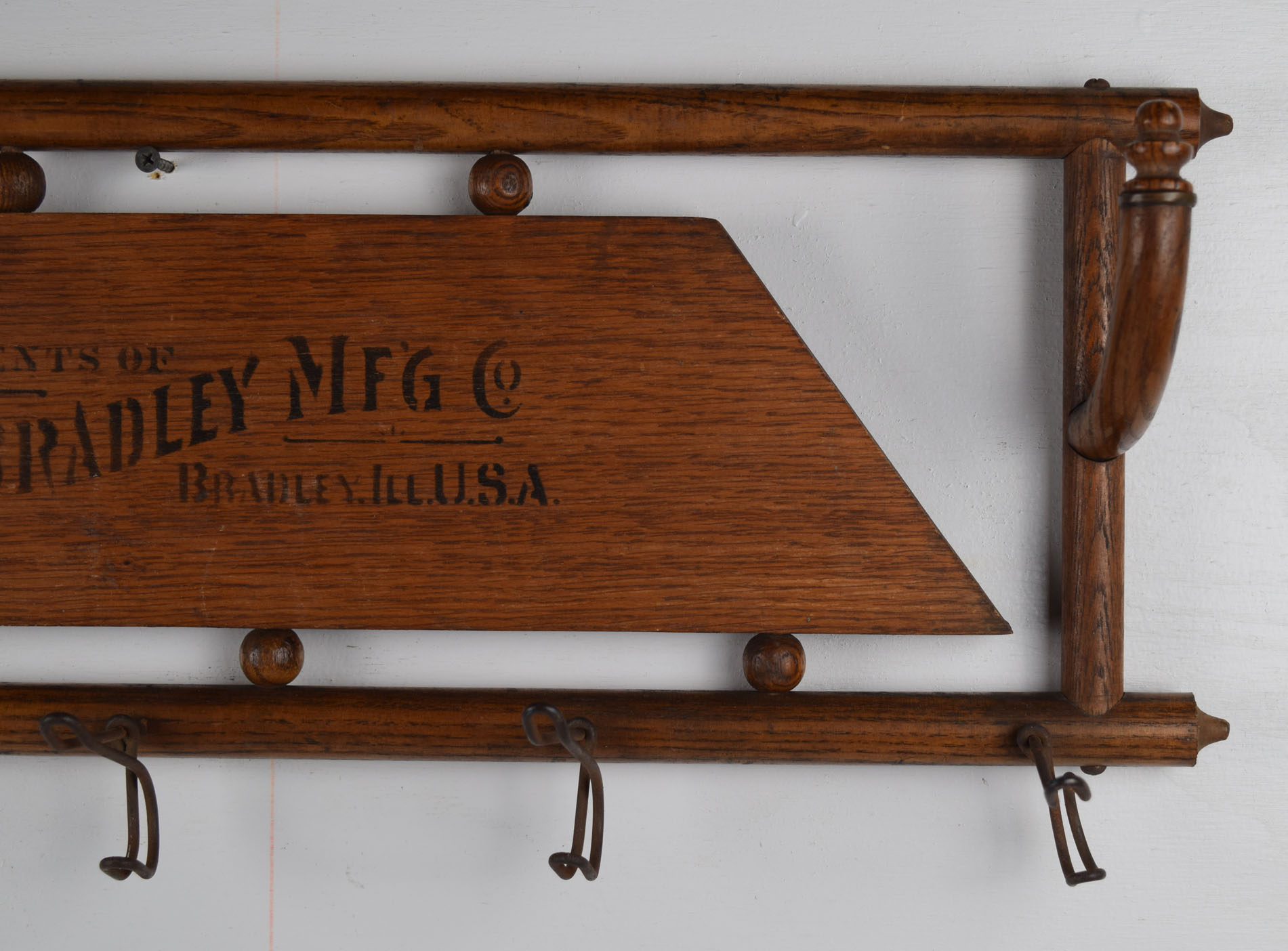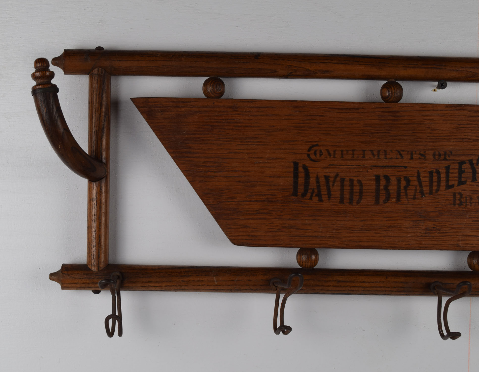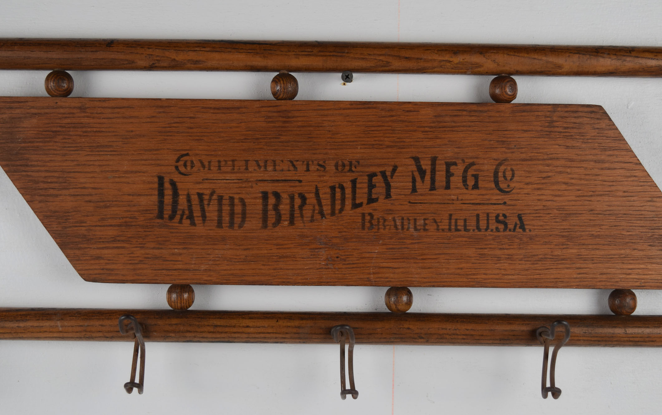 Dating from the late 19th century, this wooden coat rack was a very nice promotional item that was given to customers of the David Bradley Manufacturing Company in Bradley, Illinois. The company made farm machinery in Bradley, Illinois. Made of wood with metal hooks at the bottom, it is stenciled “Compliments of David Bradley Mfg Co.” “Bradley, Ill. U. S. A.” on the center panel. The upper wooden hooks have metal rings at the top and are slightly loose. It is in amazing shape for the age and ready for your wall! 19549-RTP