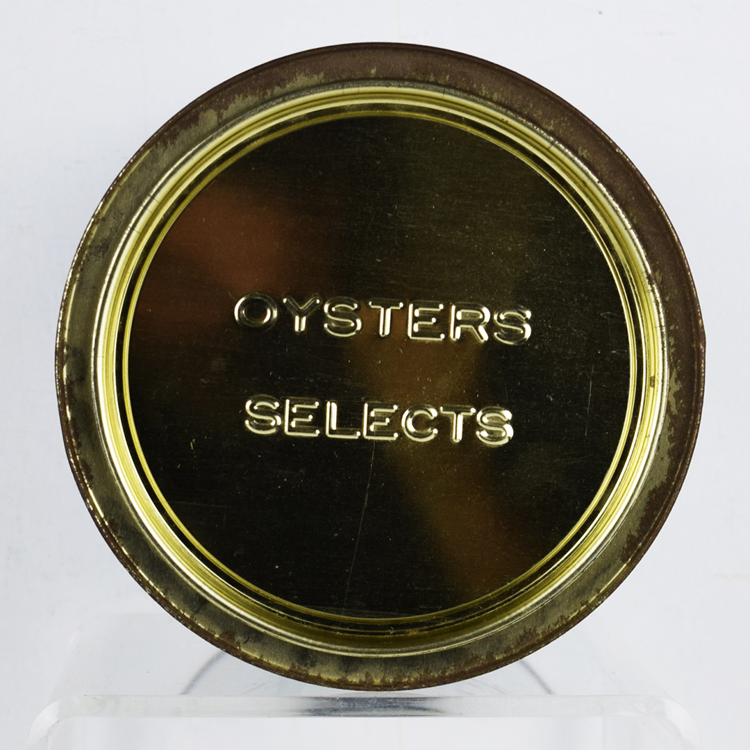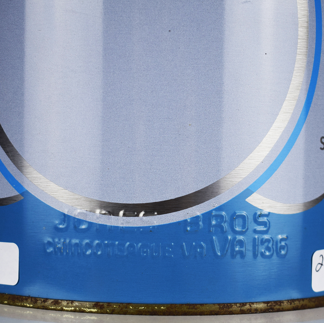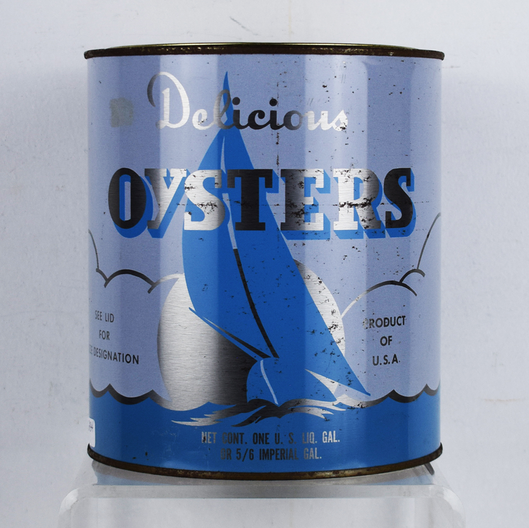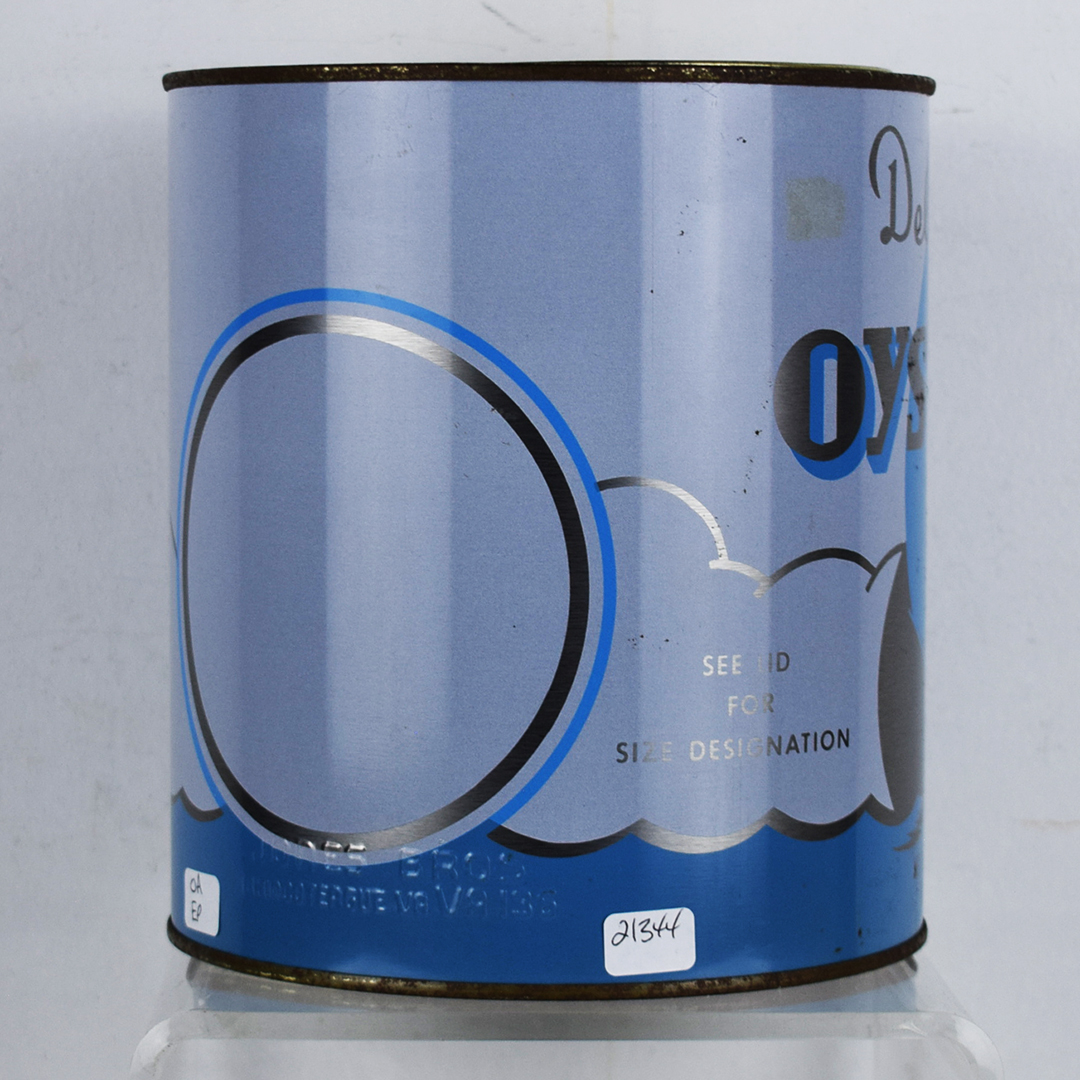 Today, oyster cans are used as decor. They once carried freshly shucked raw oysters from the packing plant to the market. Tin cans allowed companies to display logos and cities on the sides, and they were thin enough to allow the oysters to stay cold when packed in ice. This gallon features a generic picture of a sailboat with “Delicious Oysters” on the front. The bottom edge reads “Jones Bros Chincoteague VA VA 136”. The can is in excellent condition and has typical wear from its use. It measures 7.5 inches tall by 6.75 inches wide and retains the original embossed lid. 21344-EP