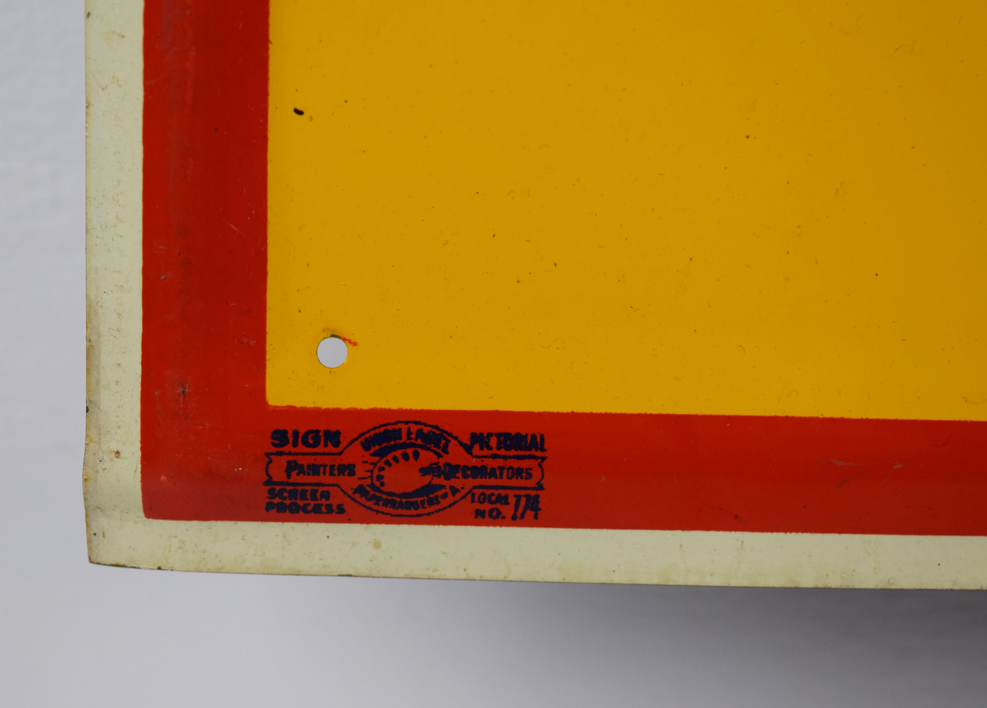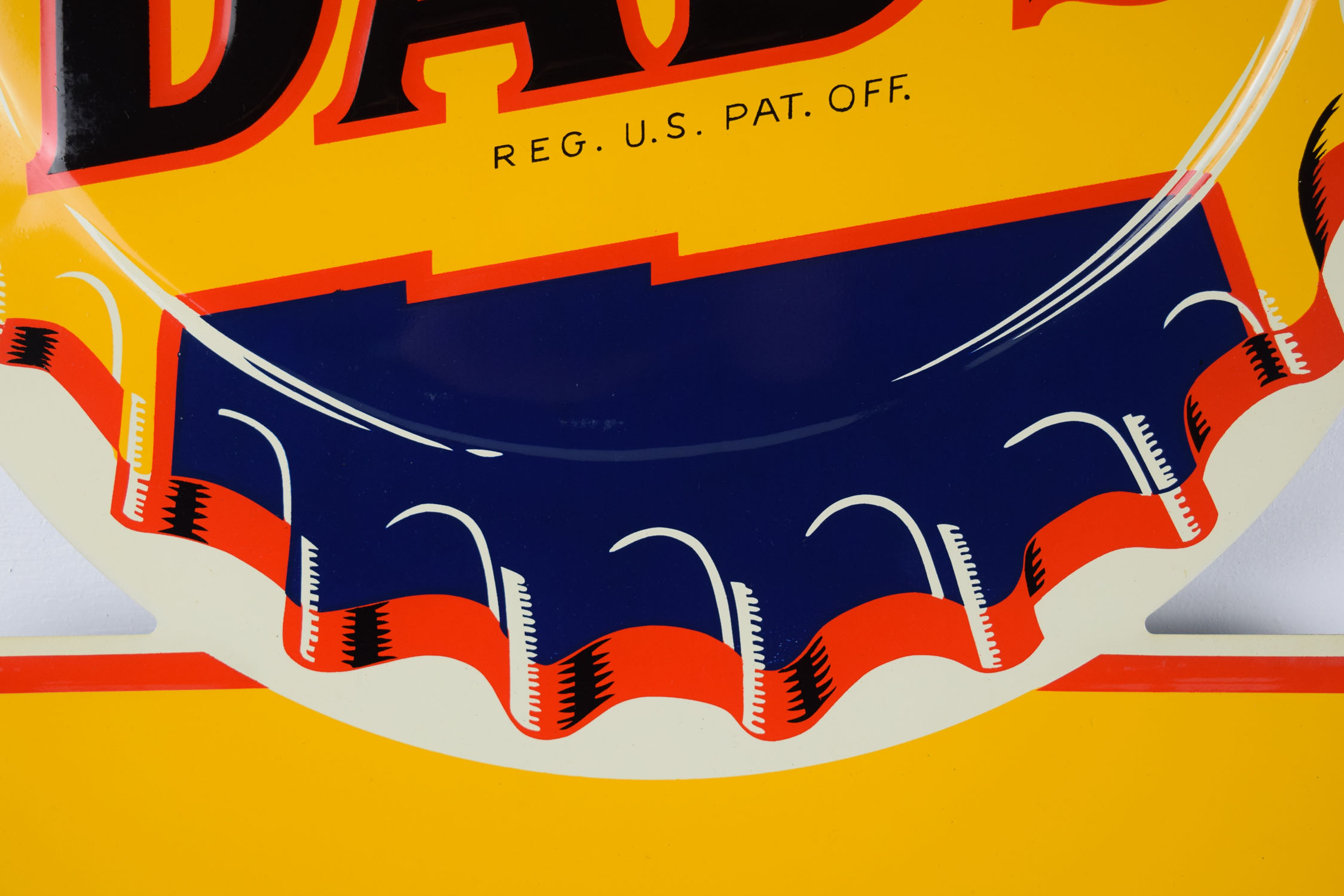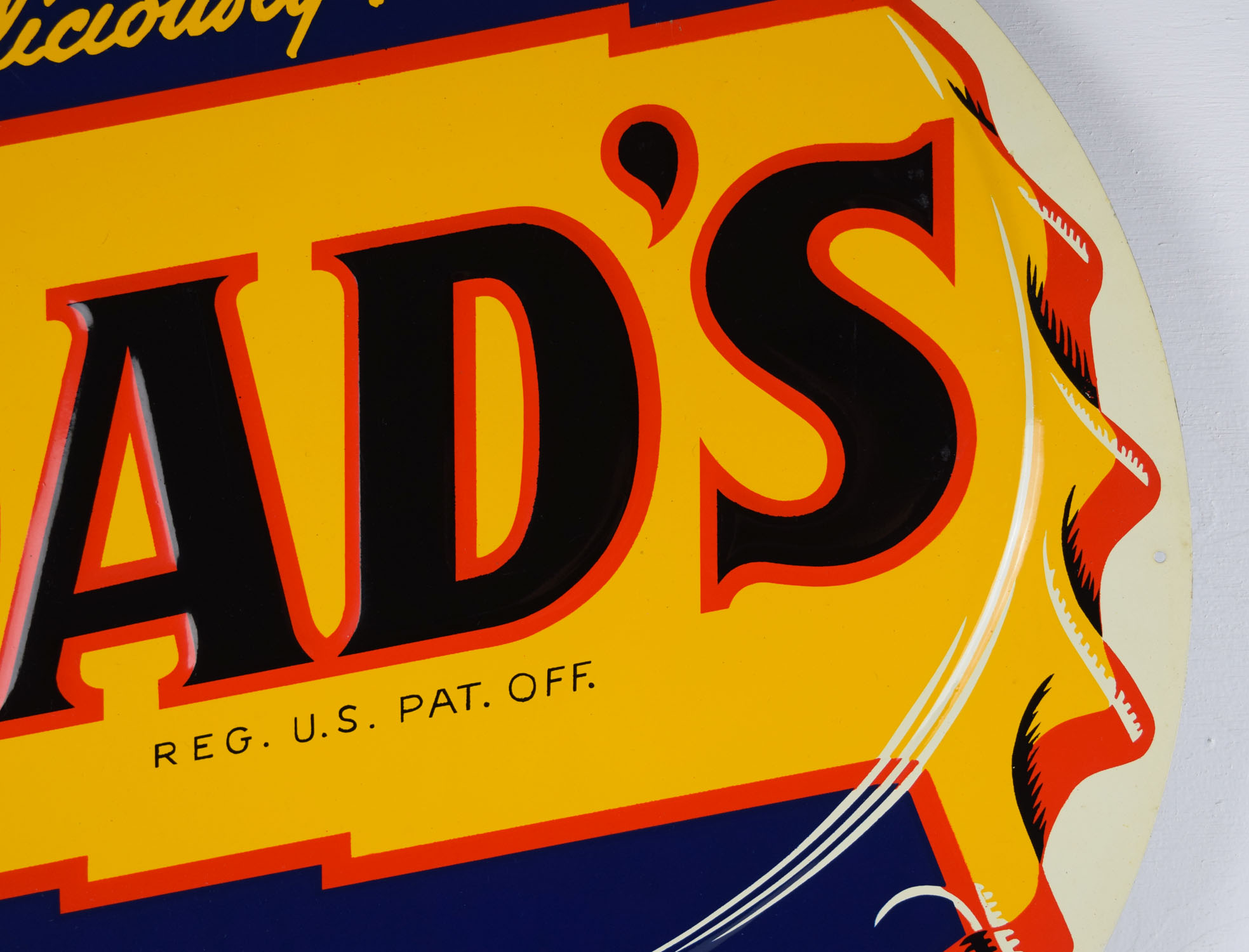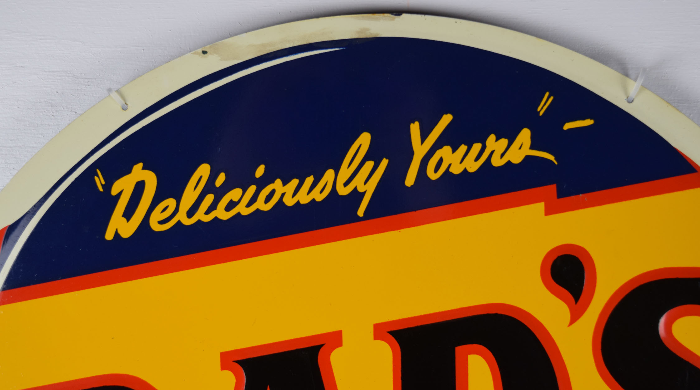 America’s premium root beer since 1937, Dad’s Root Beer has a unique and delicious flavor, which has attracted many followers over the years. This super nice die cut tin sign has the Dad’s logo in embossed letters on the colorful bottle cap with “Deliciously Yours” on top. The bottom is a blank privilege panel that could be used for your local soda fountain or grocery store to write their specials with ease. Most of these signs have embossed letters from the sign company in this area, but this one does not, which makes it very rare! Some chipping on the bottom corners with a scuff mark at the very top is the only issues we see with this super glossy and colorful sign. It appears it has never been hung, as the mounting holes are in amazing shape! 19520-YYP