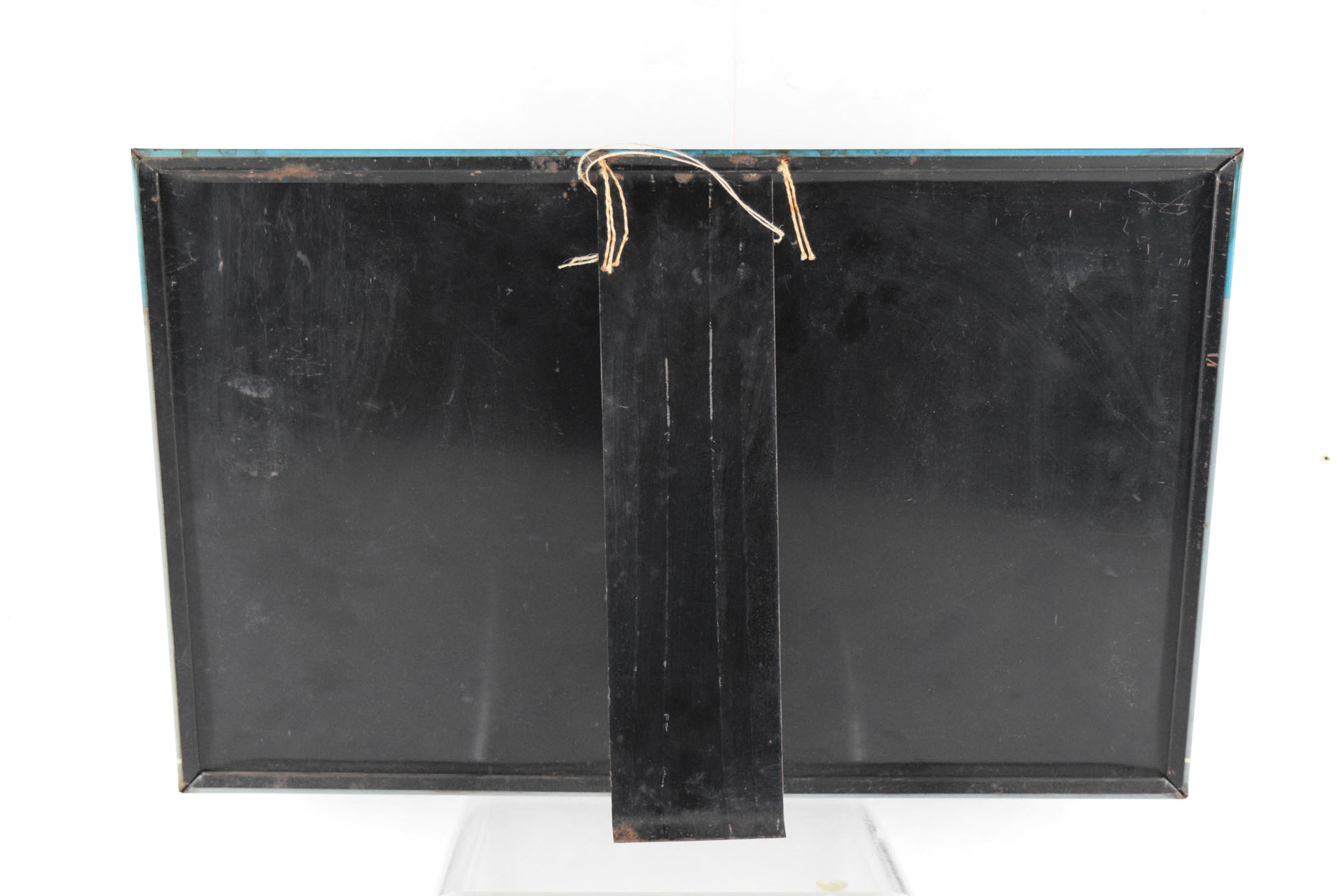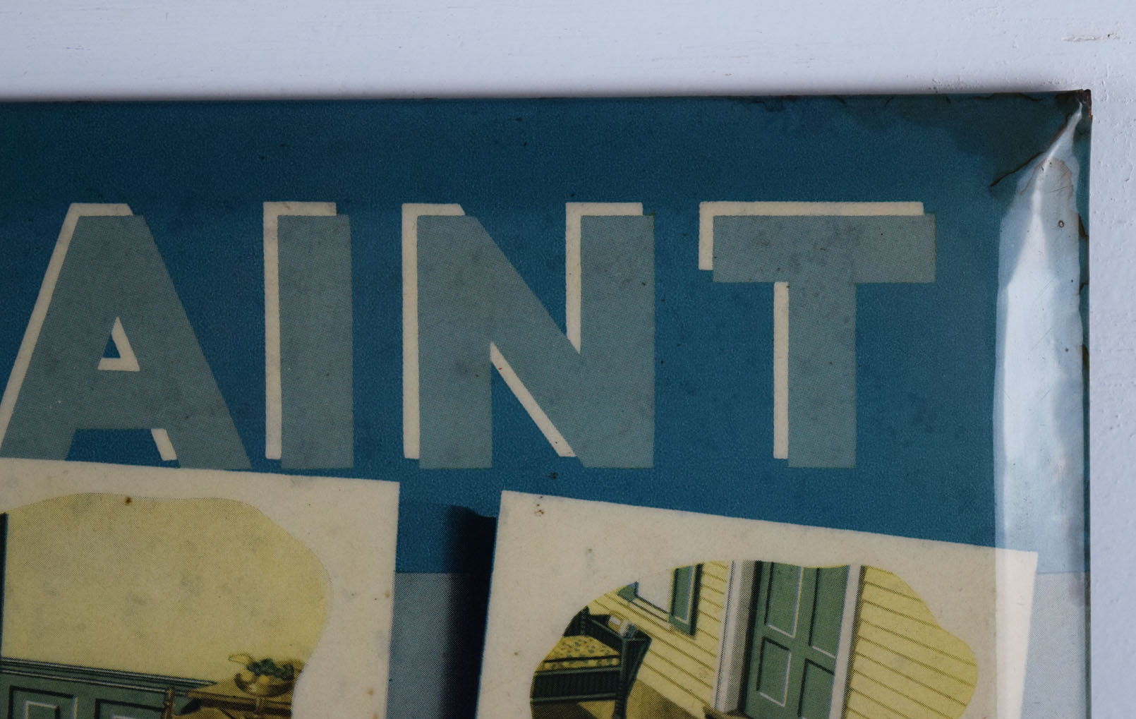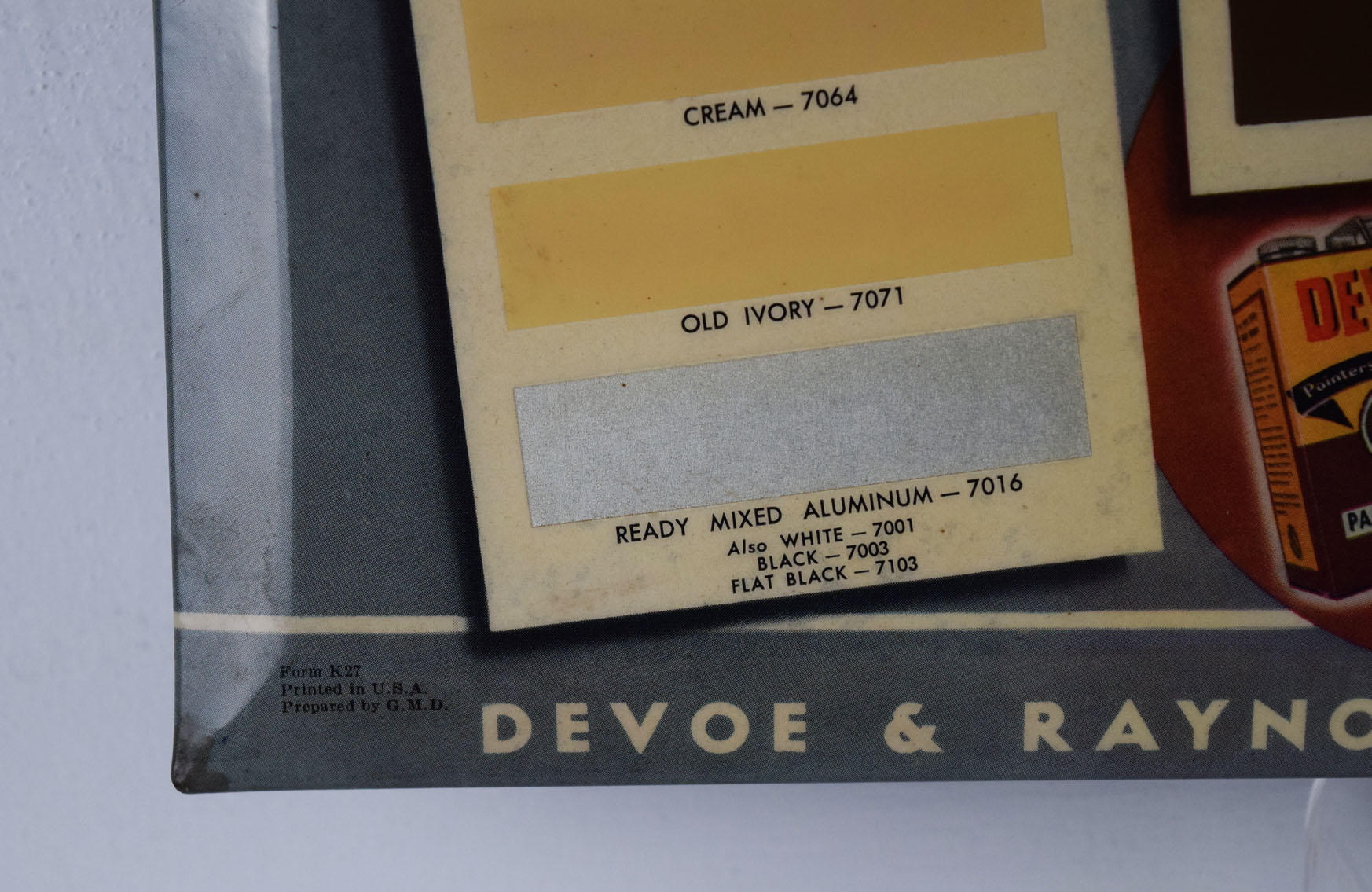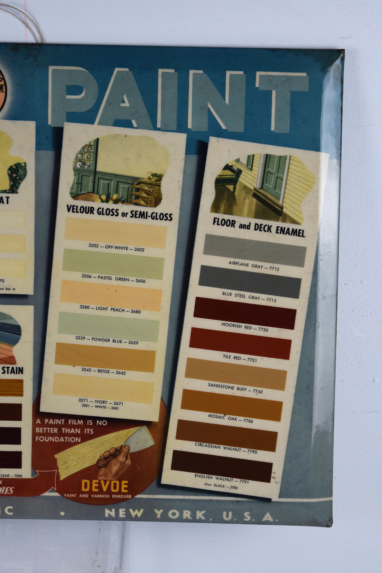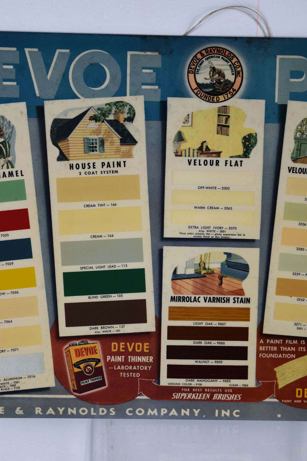 In order to show customers the different colors available to them, Devoe Paint issued this celluloid easel back sign to the general stores across the country. It features different styles of house paint and wood varnish, which includes enamel, house paint, velour flat, velour gloss / semi-gloss, floor and deck enamel, and mirrolac varnish stain. Each type of paint has different colors to choose from with the stock numbers assigned. It also advertises Devoe paint thinner at the bottom. Some discoloration has occurred along the edges, mainly in the corners. The display can be placed on a store counter, or hung from the wall. The original string that it hung has broken with age and a replacement has been added. Very rare piece to find! 1007-QWT