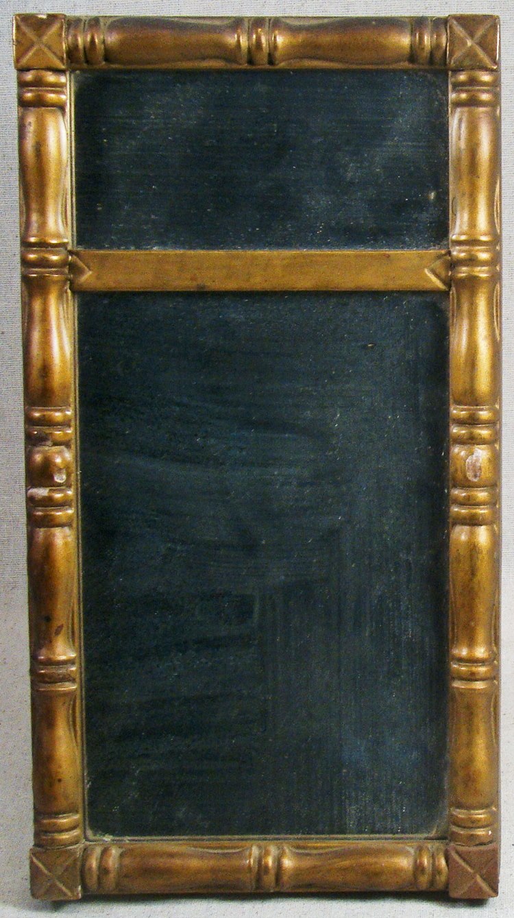 This sweet little doll sized pier mirror has a wooden gilt frame just like the big ones and a wire easel back with a 1909 patent date. It has turned column moldings and X marked block corners. It measures 11″ tall by 6″ wide and is in excellent condition with the original glass and only a couple of chips in the gilt finish. It could be used on a dresser. 13655-WT