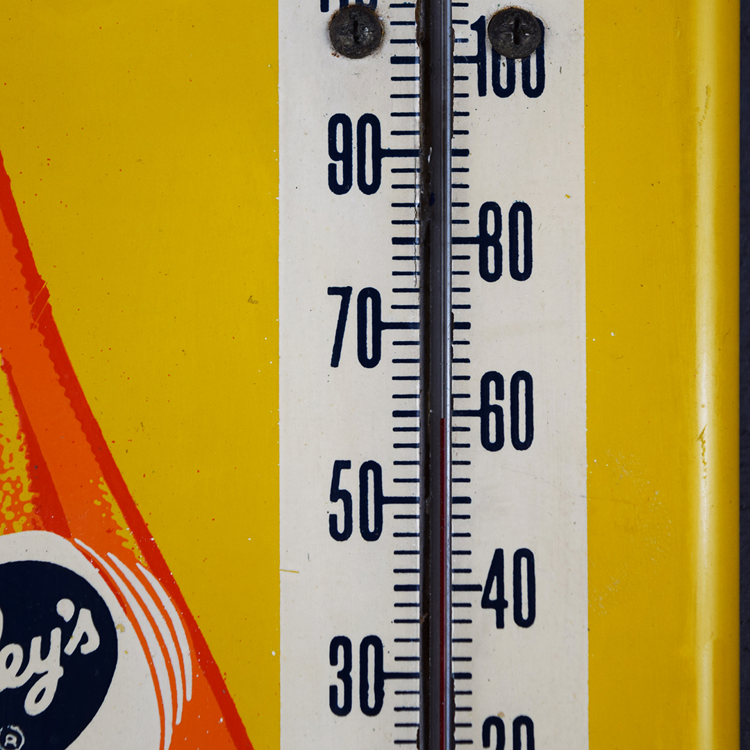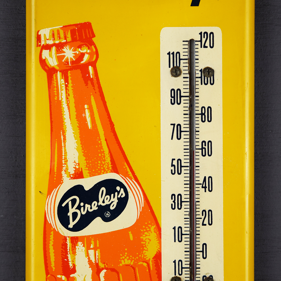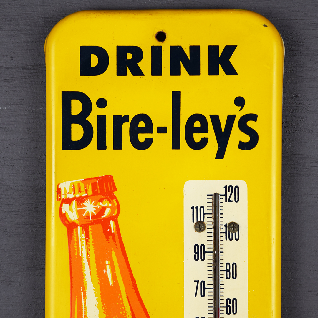 Rare Bire-ley’s thermometer, 15.75 inches tall by 4.5 inches wide with rounded corners. Marked “E 519 51” in the lower left corner, dating it to 1951. Colors are sharp with a nice gloss. Minor marks: one left of the tilted bottle, two below, slight wrinkles around mounting holes, and two marks on the outer edges. The thermometer reads correctly and is original. The graphics are sharp on this right-sized thermometer, as are the letters. 21444-WTP