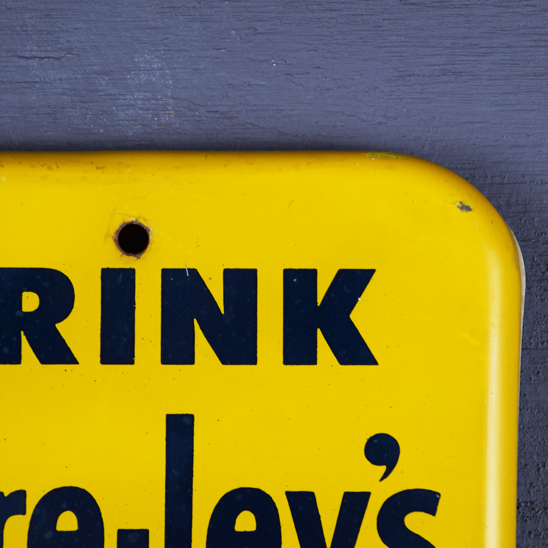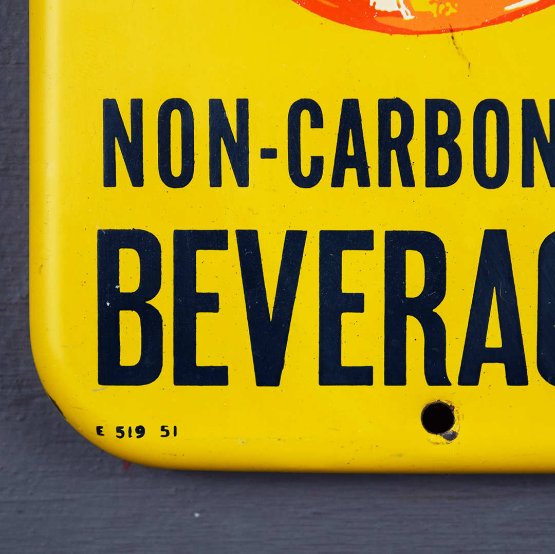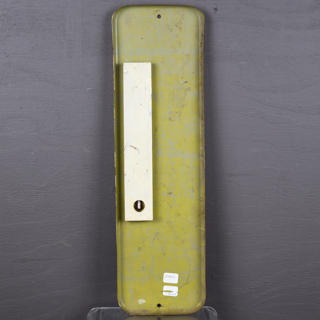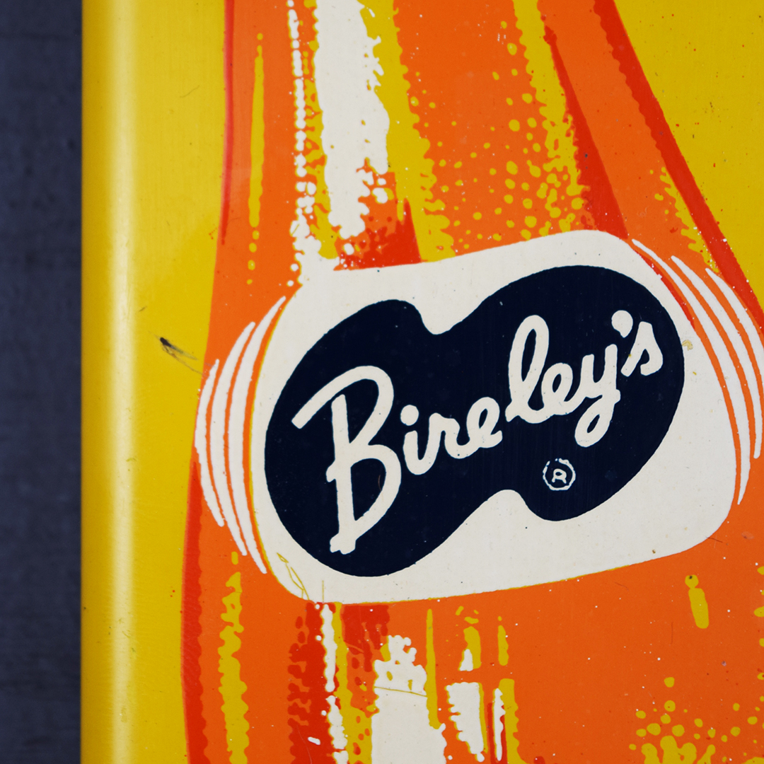 Rare Bire-ley’s thermometer, 15.75 inches tall by 4.5 inches wide with rounded corners. Marked “E 519 51” in the lower left corner, dating it to 1951. Colors are sharp with a nice gloss. Minor marks: one left of the tilted bottle, two below, slight wrinkles around mounting holes, and two marks on the outer edges. The thermometer reads correctly and is original. The graphics are sharp on this right-sized thermometer, as are the letters. 21444-WTP