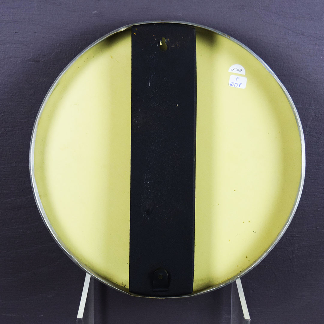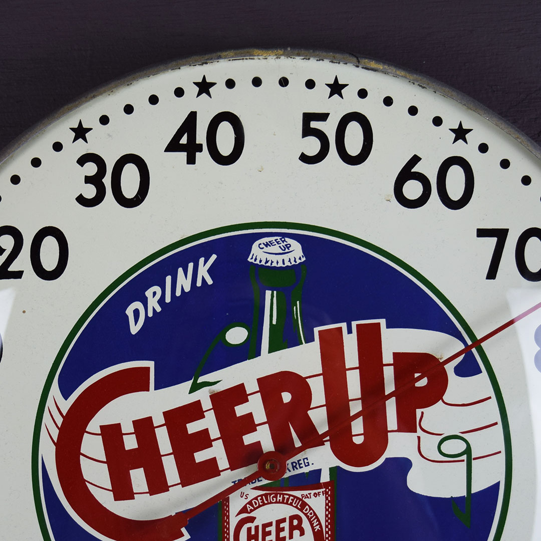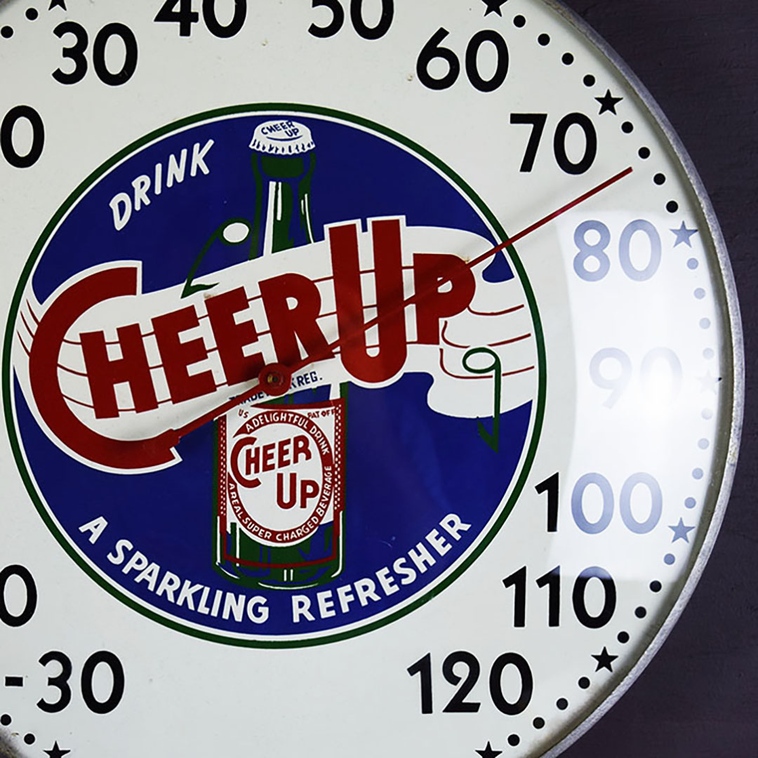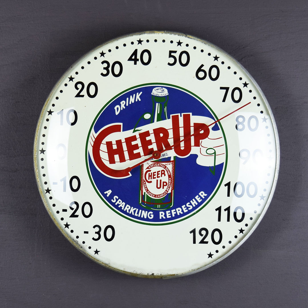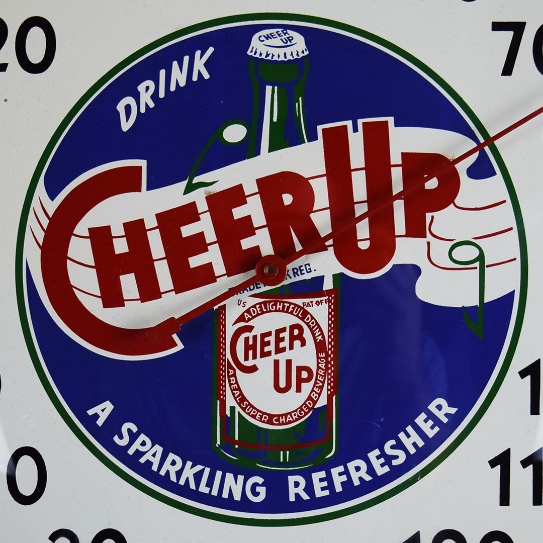 How about adding this colorful Drink Cheer Up round thermometer to your collection? It features a whole bottle of Cheer Up soda with the Cheer Up logo on a musical note in the center, with “Drink” above and “A Sparkling Refresher” below. It measures 12 inches in diameter and features a curved glass cover. The metal face inside is very nice, with typical discoloration along the outer edge. The metal outer ring of the thermometer has some slight pitting from the outside elements. With great colors, it is sure to be a keeper! 21012-WOP