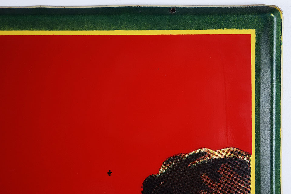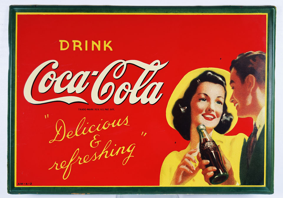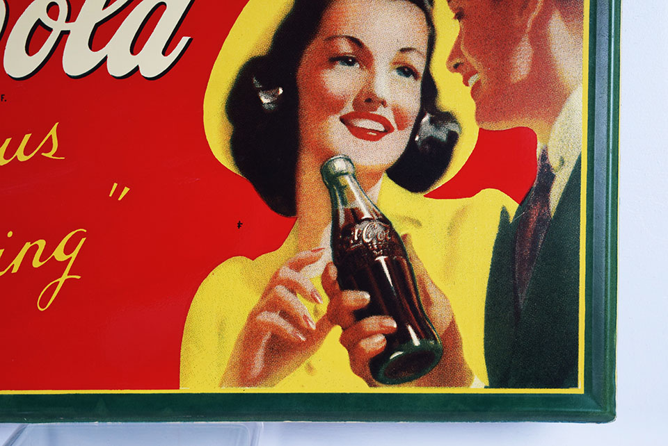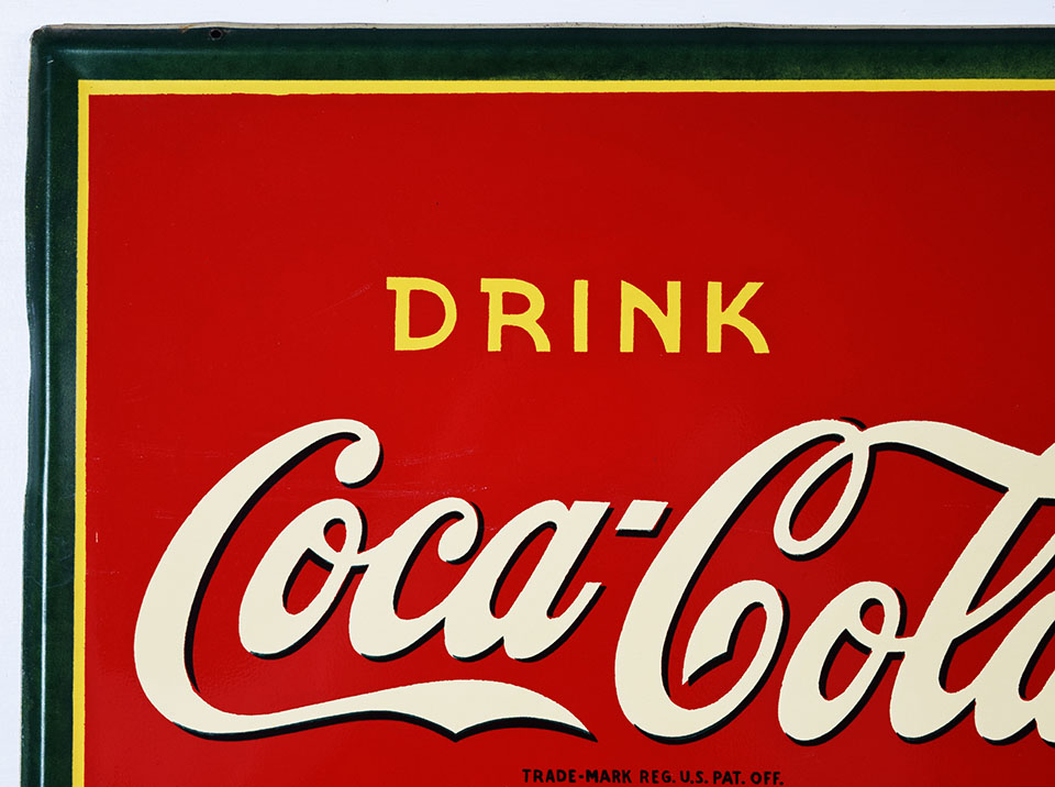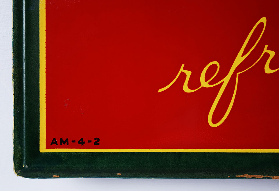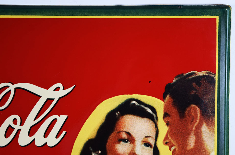 How about a beautiful single sided self framed tin sign to add to your collection? The colors pop nicely on this 1940’s sign that features a couple enjoying an ice cold Coca-Cola. A few very small bends can be seen on the outer frame, with two mounting holes that have been added along the top. The face of this sign is very glossy and the colors are sharp with just some very light scratches on the left side. It is marked “AM-4-2” in the lower left corner. Super nice sign that will add value to your collection. 20088-QYIP