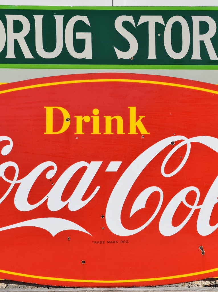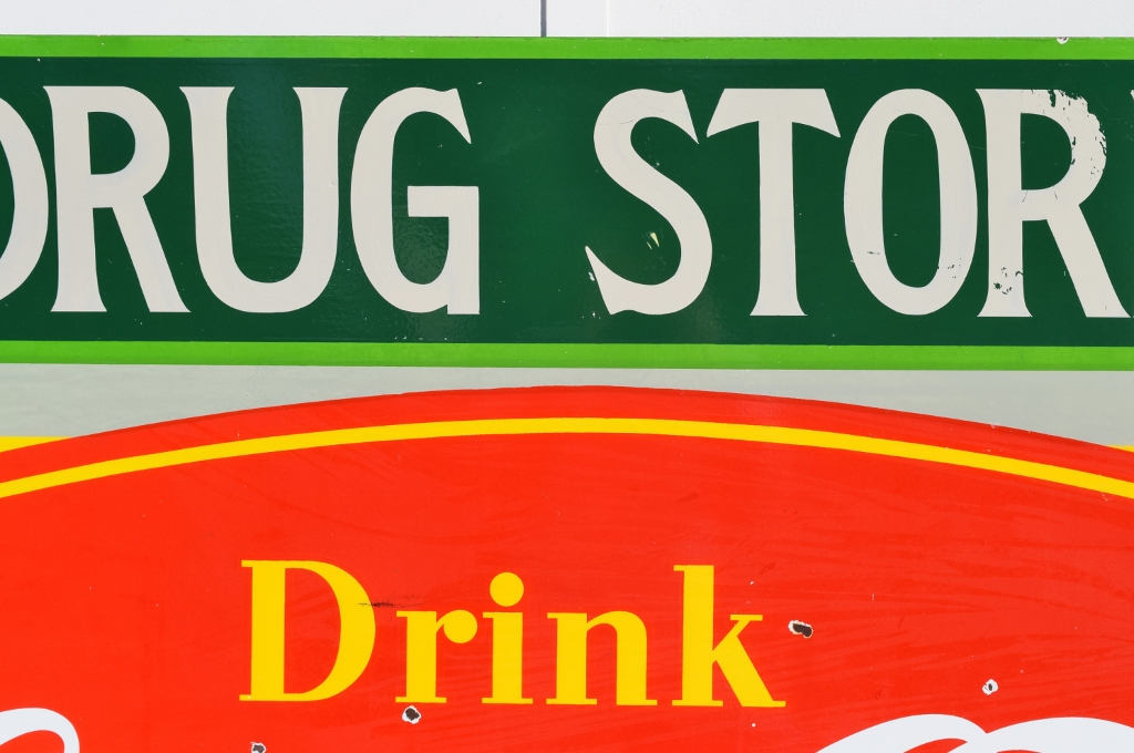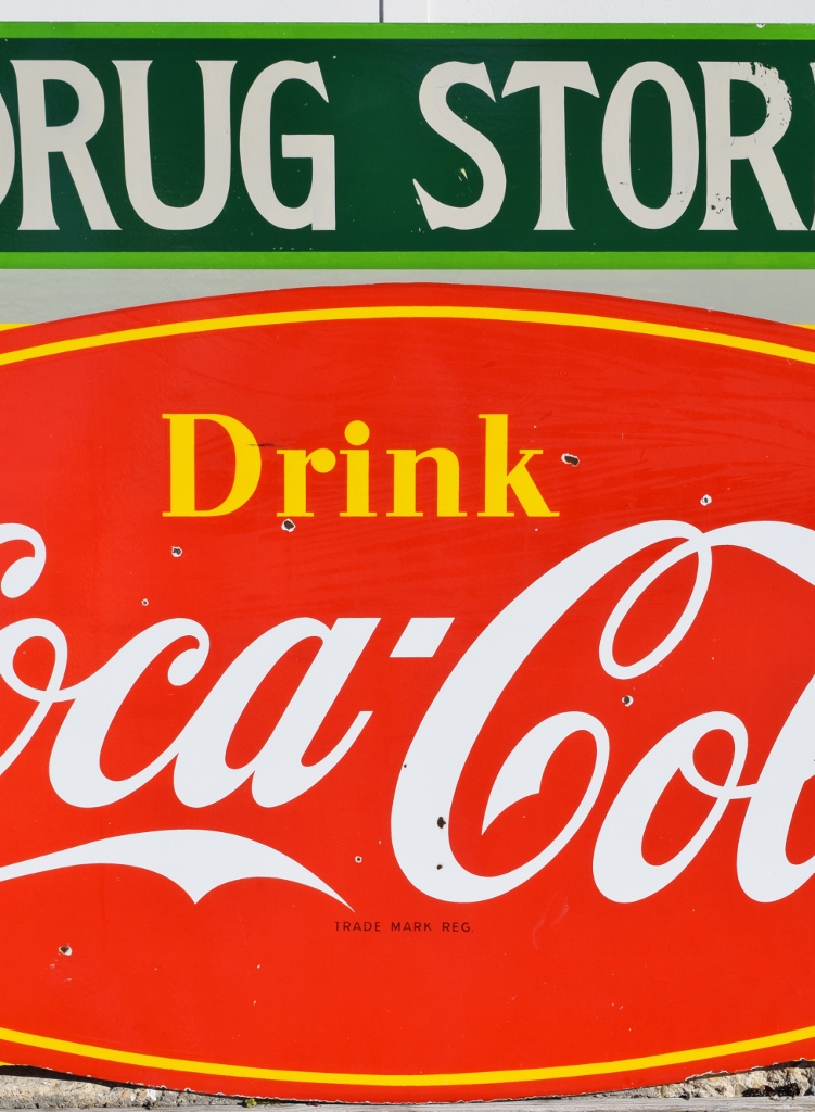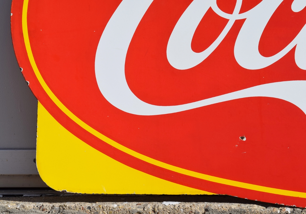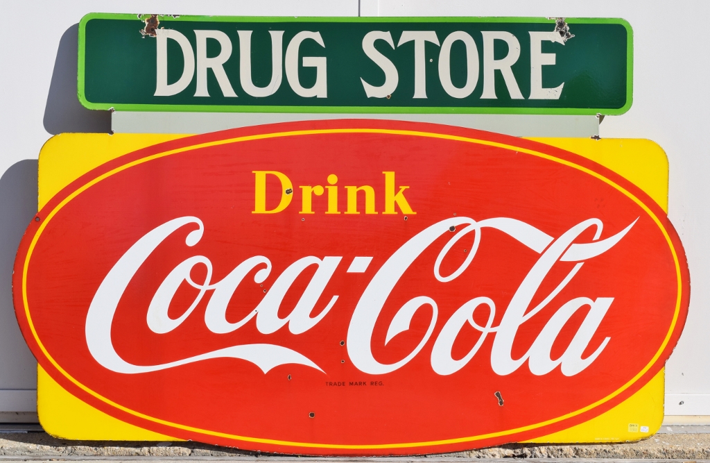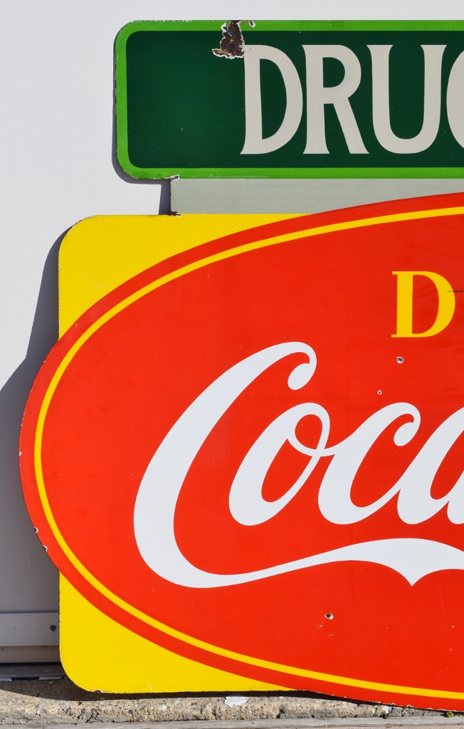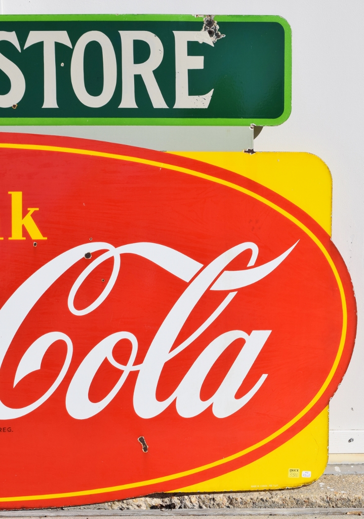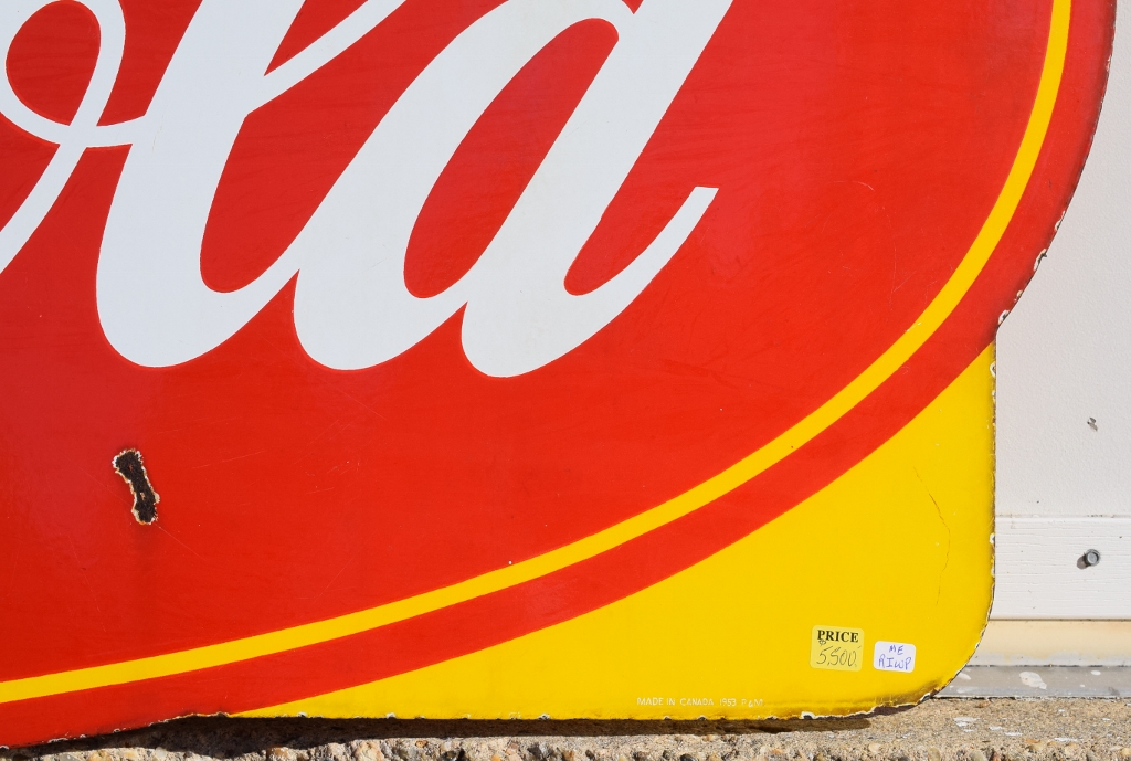 Check out this beautiful double sided porcelain Drink Coca Cola hanging sign that just arrived! It is complete with a privilege panel at the top that has “Drug Store” letters added to it. The sign is marked “Made In Canada 1953 P& M” in the lower right corner of one side only. Some chipping has occurred in the porcelain finish around the top mounting holes, along with some smaller chips in the field of this rare sign. The gloss is very shiny and impressive to see. As you can see by the pictures, the colors of this sign are just spectacular! Typical minor chips can be seen around the outer edges of this 39 by 60 inch sign. Don’t miss this opportunity to own this super nice sign! 20072-RIWP