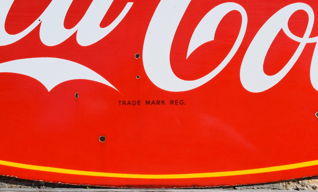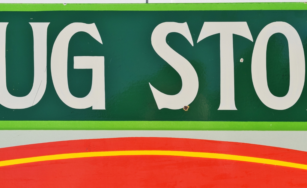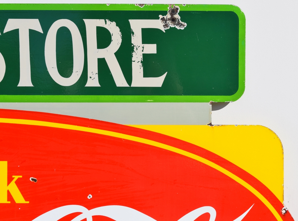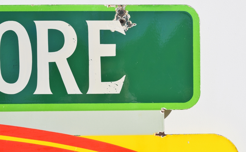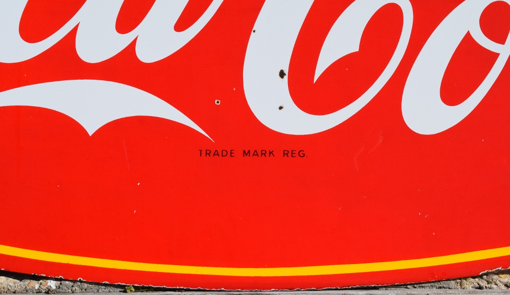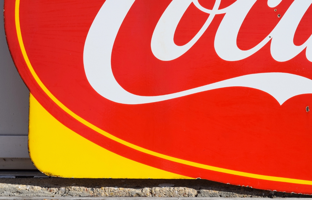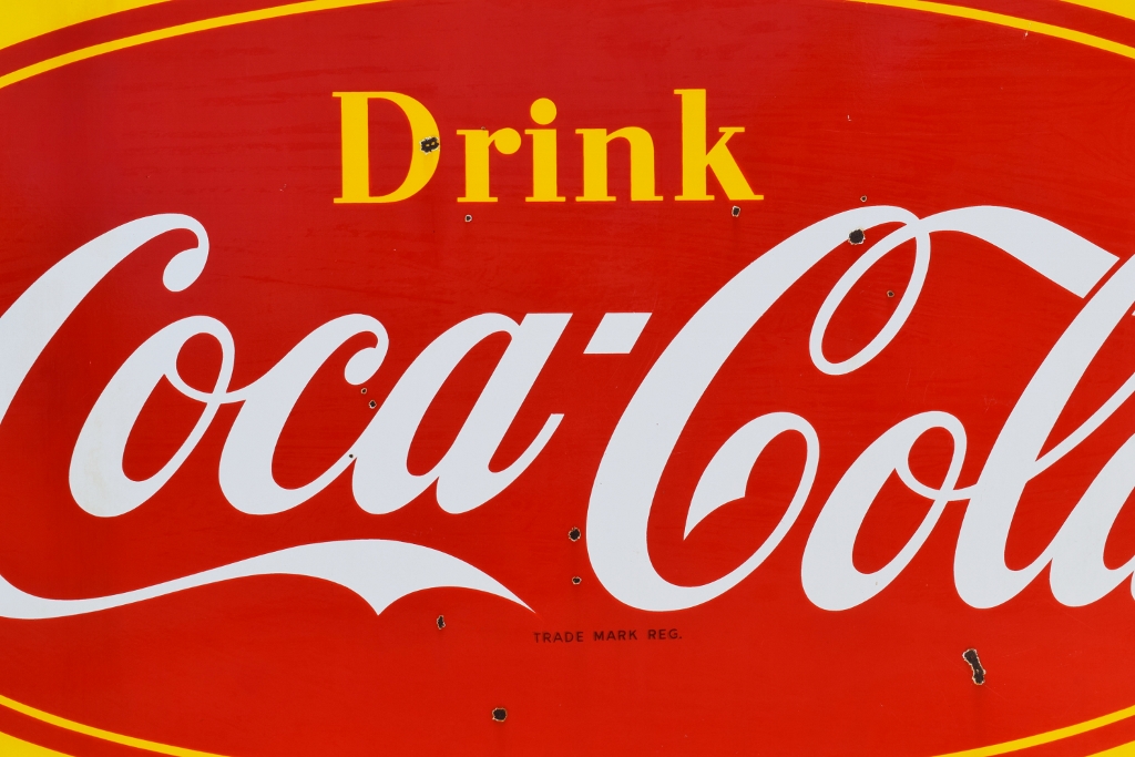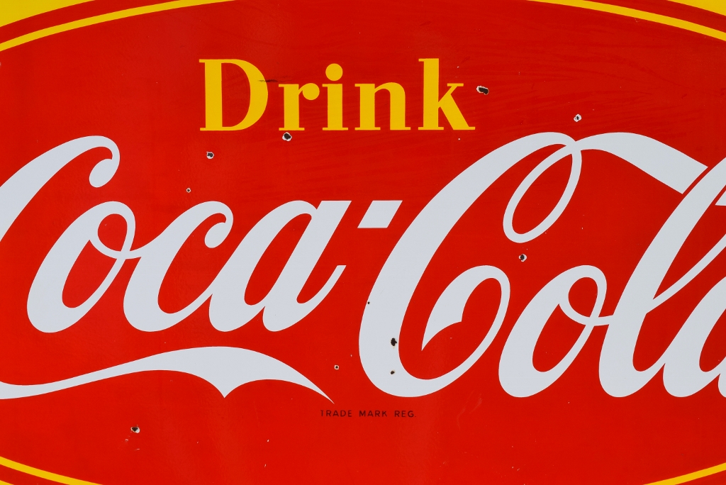 Check out this beautiful double sided porcelain Drink Coca Cola hanging sign that just arrived! It is complete with a privilege panel at the top that has “Drug Store” letters added to it. The sign is marked “Made In Canada 1953 P& M” in the lower right corner of one side only. Some chipping has occurred in the porcelain finish around the top mounting holes, along with some smaller chips in the field of this rare sign. The gloss is very shiny and impressive to see. As you can see by the pictures, the colors of this sign are just spectacular! Typical minor chips can be seen around the outer edges of this 39 by 60 inch sign. Don’t miss this opportunity to own this super nice sign! 20072-RIWP