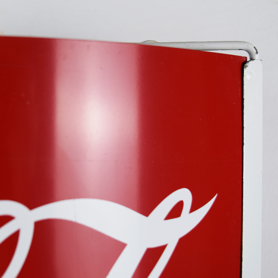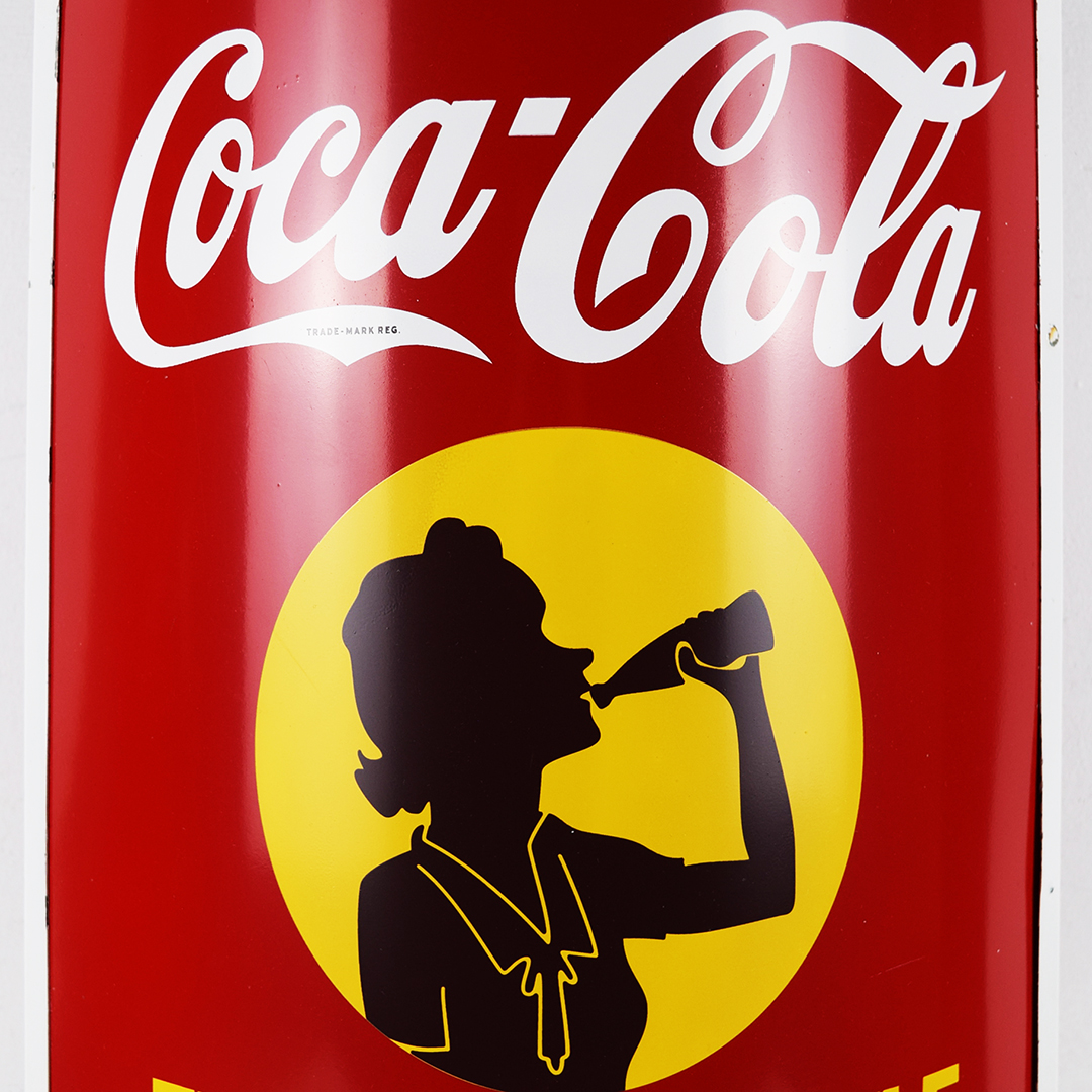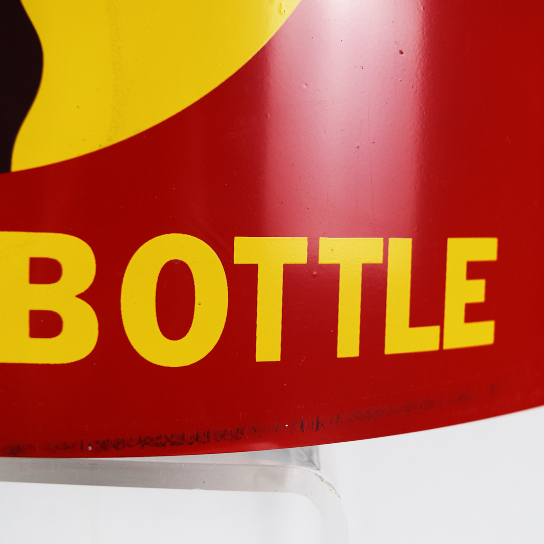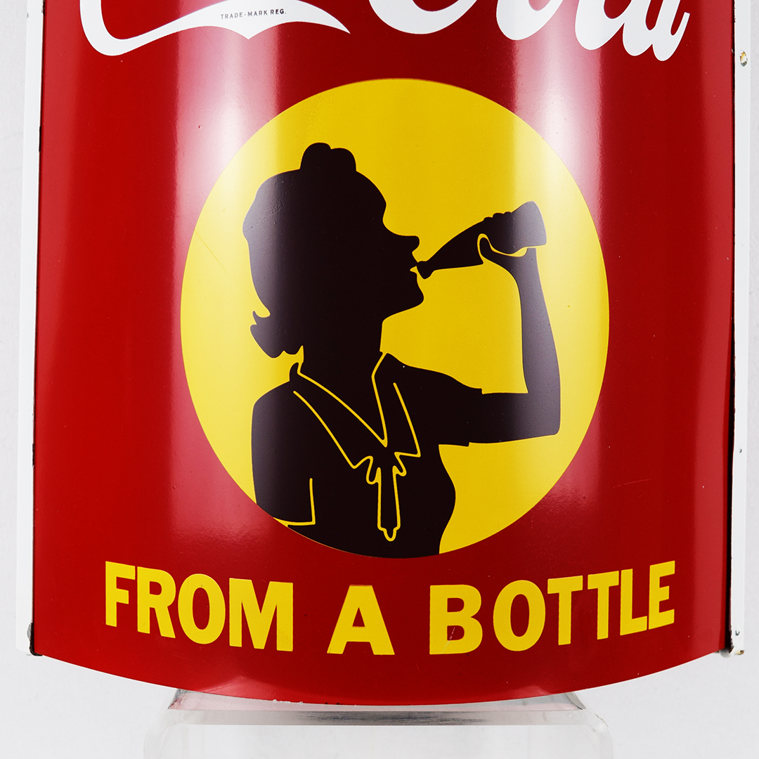 Showing the iconic silhouette girl on each side of this string holder, the tin signs read “Drink Coca-Cola” and “From A Bottle”, and measure 16.25 inches tall by 12 inches wide. The metal frame holds the outer edges of each tin sign tightly, allowing a roll of string to sit inside, hidden from customers’ view. Once the clerk needed a string to wrap a package or tie an item, he reached up and pulled the string down. With the string inside, the holder measures 8 inches deep. The tin signs on both sides are very nice, with sharp colors, crisp graphics, and a nice gloss. Very minor wear is along the bottom edge, along with a fine scratch on the top edge. The white inner frame shows minor paint chipping as well. With the condition of this piece, it was well cared for, and it shows. 21503-QWPP