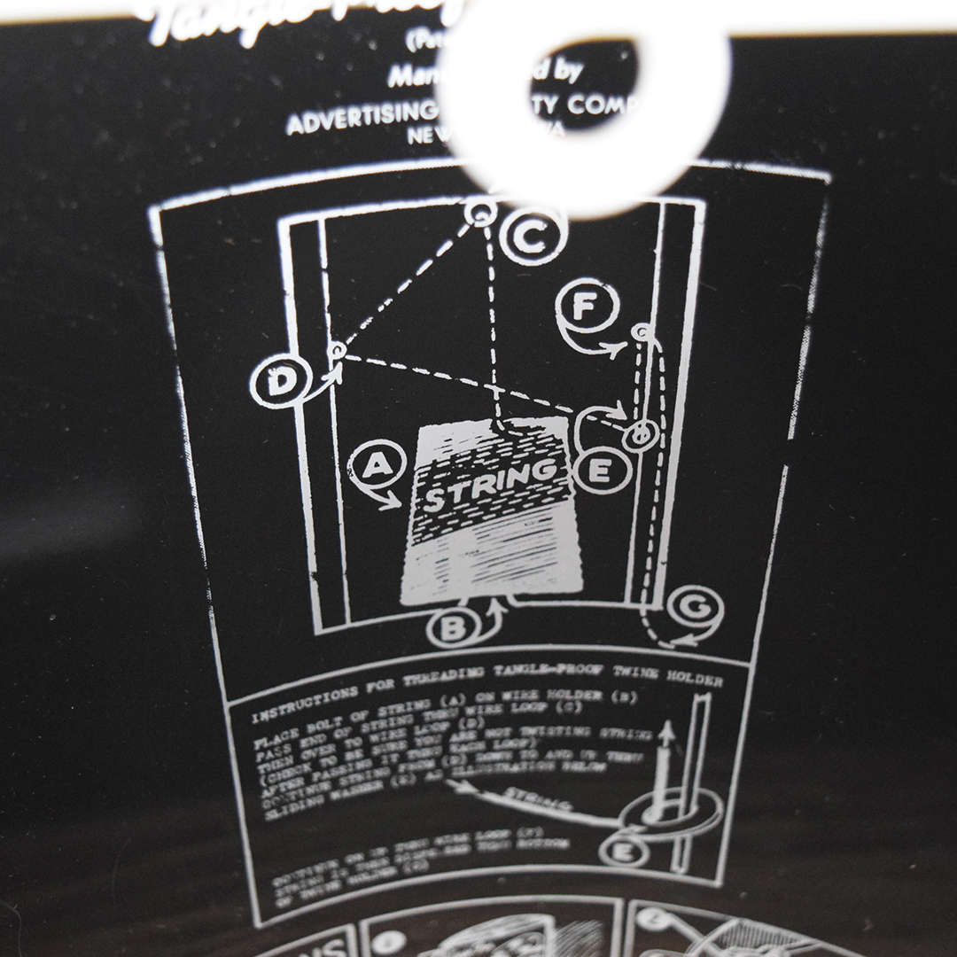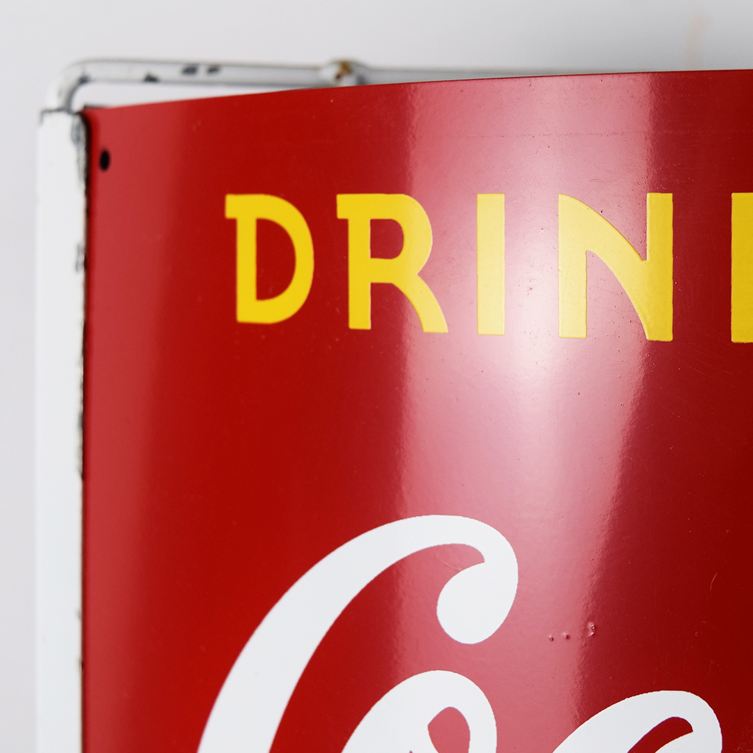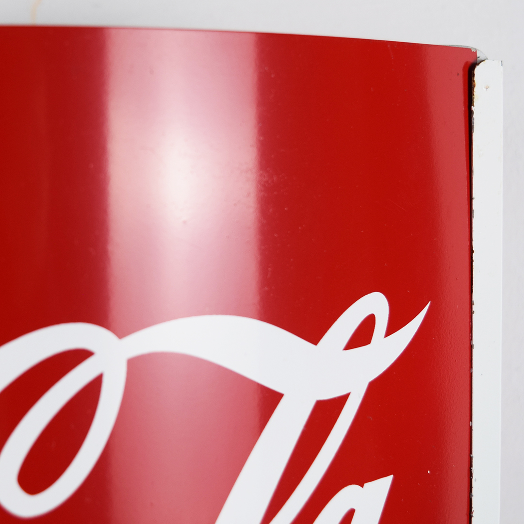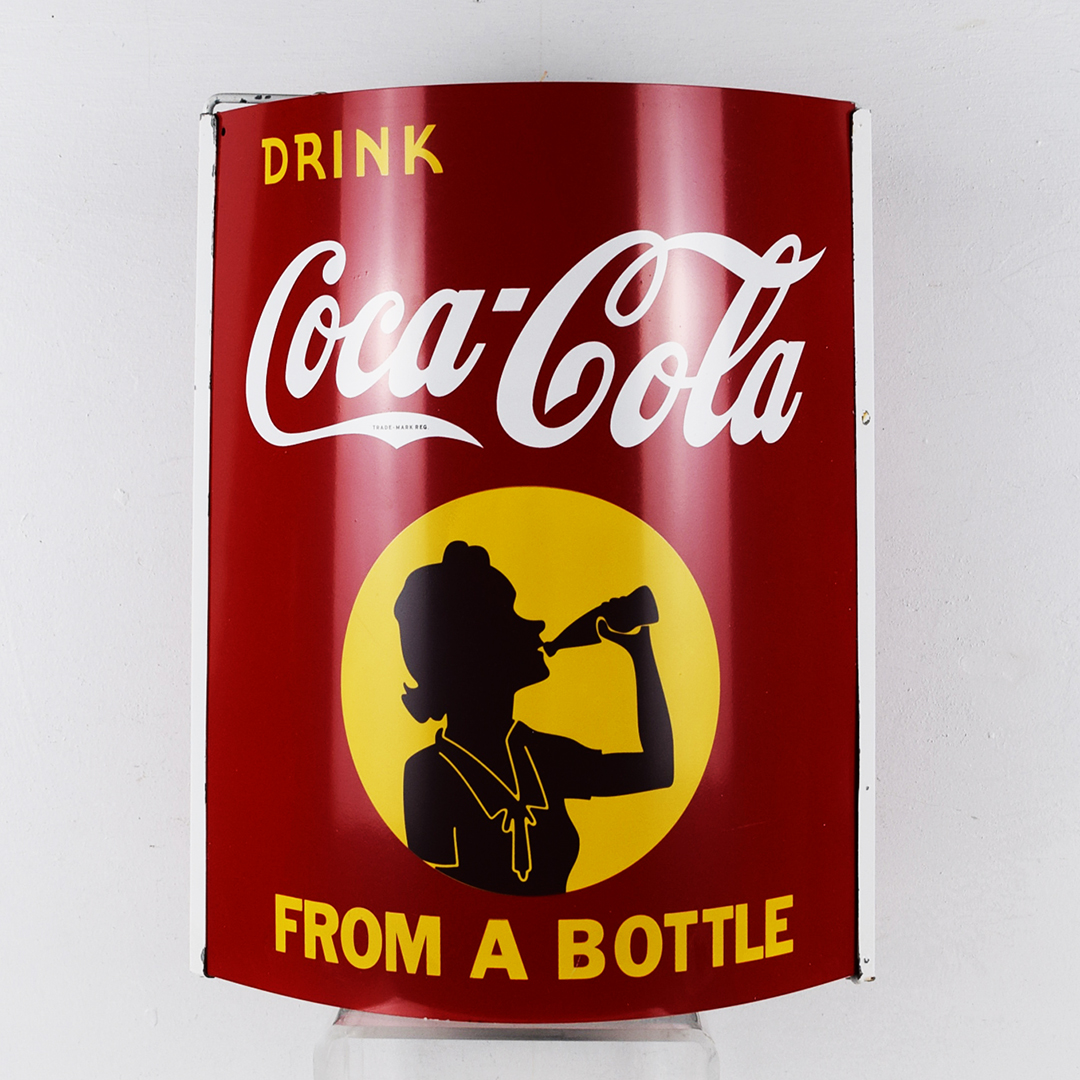Showing the iconic silhouette girl on each side of this string holder, the tin signs read “Drink Coca-Cola” and “From A Bottle”, and measure 16.25 inches tall by 12 inches wide. The metal frame holds the outer edges of each tin sign tightly, allowing a roll of string to sit inside, hidden from customers’ view. Once the clerk needed a string to wrap a package or tie an item, he reached up and pulled the string down. With the string inside, the holder measures 8 inches deep. The tin signs on both sides are very nice, with sharp colors, crisp graphics, and a nice gloss. Very minor wear is along the bottom edge, along with a fine scratch on the top edge. The white inner frame shows minor paint chipping as well. With the condition of this piece, it was well cared for, and it shows. 21503-QWPP