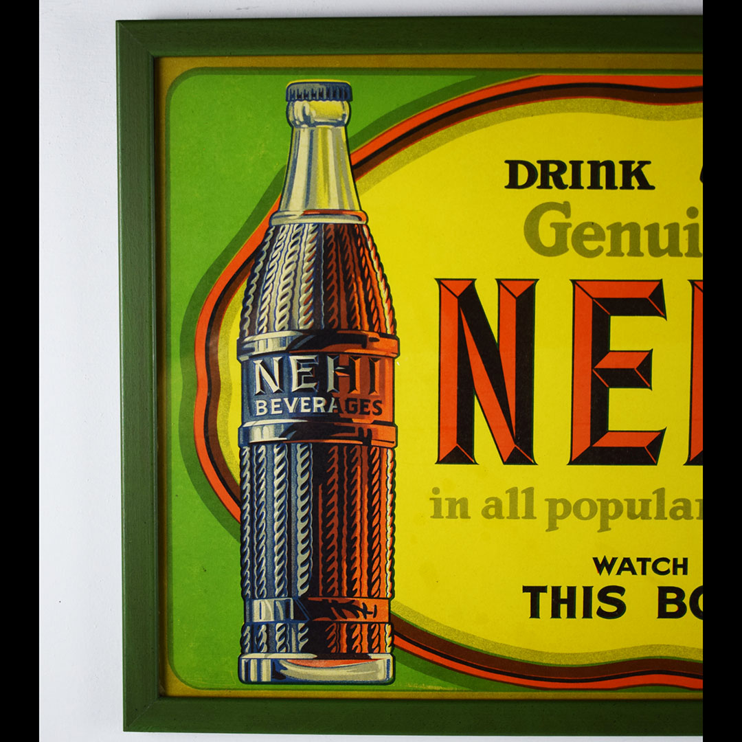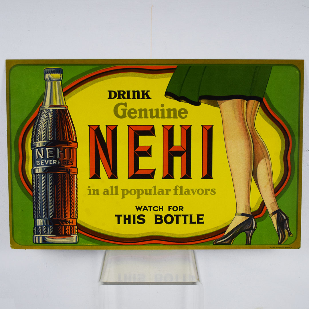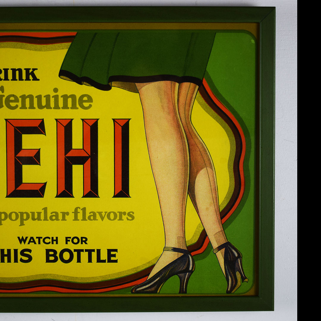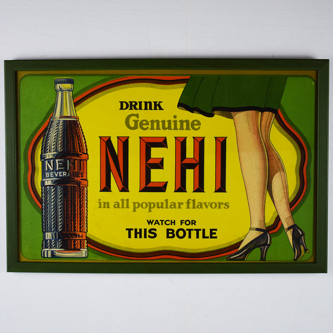 Very rare to find these days, this amazingly vivid Nehi heavy paper advertising sign dates from the 1940s and has been professionally framed, ready for your wall! The colors are perfect on this sign, which measures 13.5 inches tall and 21 inches wide. The sign features the iconic Nehi bottle on the left, with the reason it was called “Nehi” on the right. They showcased a lady’s legs, with stockings “knee-high”, illustrating how to say the soda’s name. This sign was produced by The John Igelstroem Co. in Massillon, Ohio, as marked in the lower right corner. The bottom corners have some slight wear, with the left having some rounding and wear. This area is not seen once in the frame. The frame measures 14.75 inches tall by 22.25 inches wide. 21290-QEPP