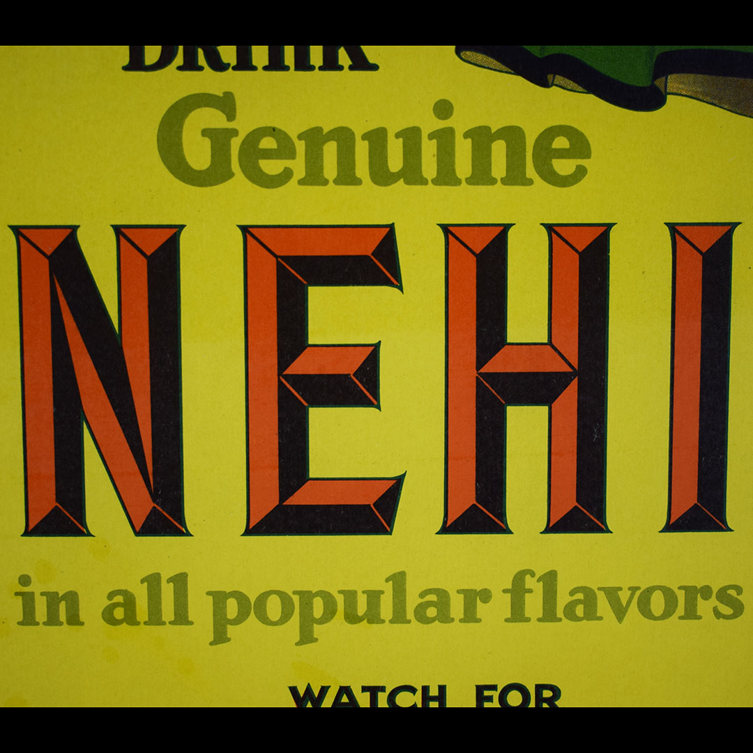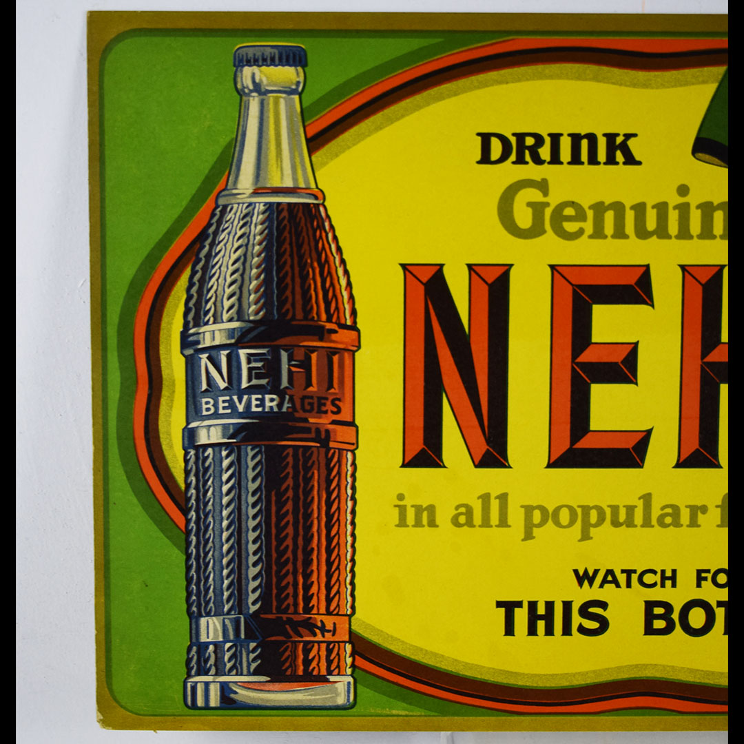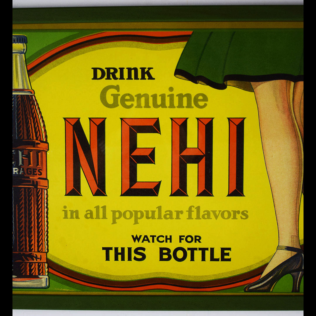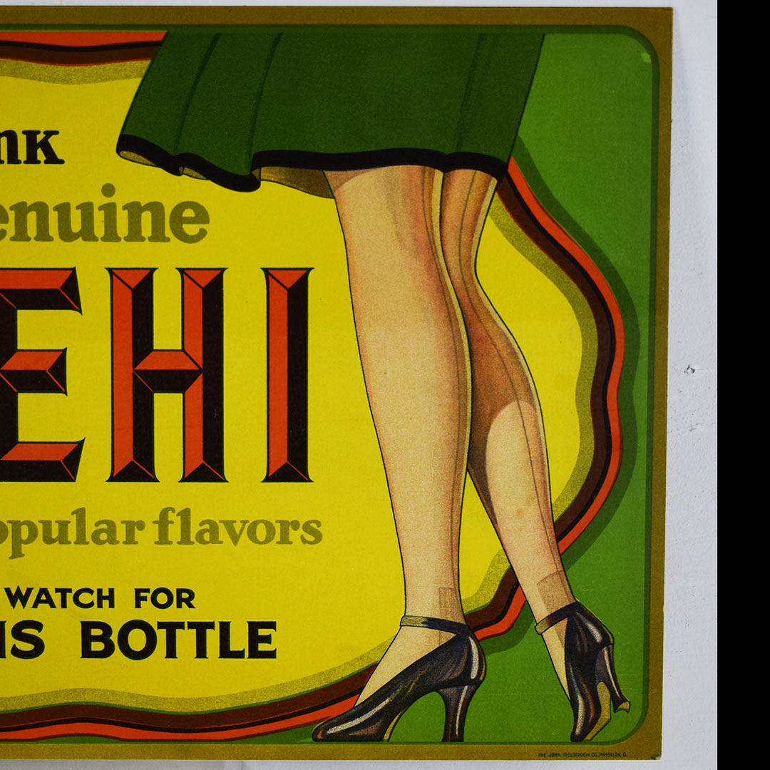 Very rare to find these days, this amazingly vivid Nehi heavy paper advertising sign dates from the 1940s and has been professionally framed, ready for your wall! The colors are perfect on this sign, which measures 13.5 inches tall and 21 inches wide. The sign features the iconic Nehi bottle on the left, with the reason it was called “Nehi” on the right. They showcased a lady’s legs, with stockings “knee-high”, illustrating how to say the soda’s name. This sign was produced by The John Igelstroem Co. in Massillon, Ohio, as marked in the lower right corner. The bottom corners have some slight wear, with the left having some rounding and wear. This area is not seen once in the frame. The frame measures 14.75 inches tall by 22.25 inches wide. 21290-QEPP