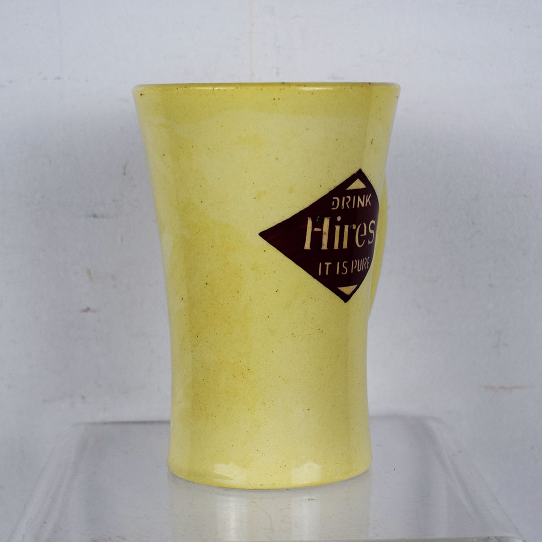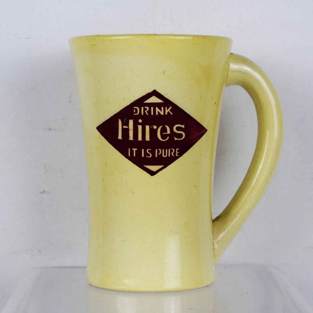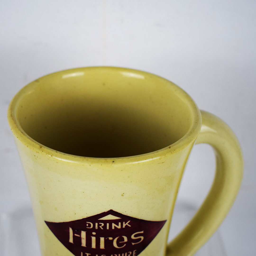 Marked “Germany” on the base, this 5.5-inch tall mug is a beautiful creme color with a red diamond on the side. Inside the red diamond, it reads “Drink Hires It Is Pure” in fantastic colors and print. The mug handle is on the right side, which accounts for 90 percent of the population. The upper lip has one small chip, and the inside is free of syrup stains. As noted earlier, the base is marked “Germany” and has one minor chip. This mug dates from the 1920s and is ready to add to your collection! 21291-RP
