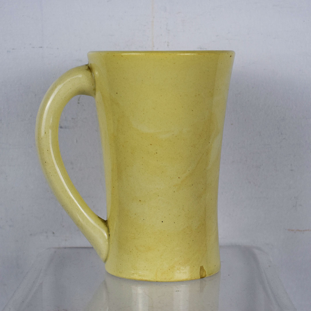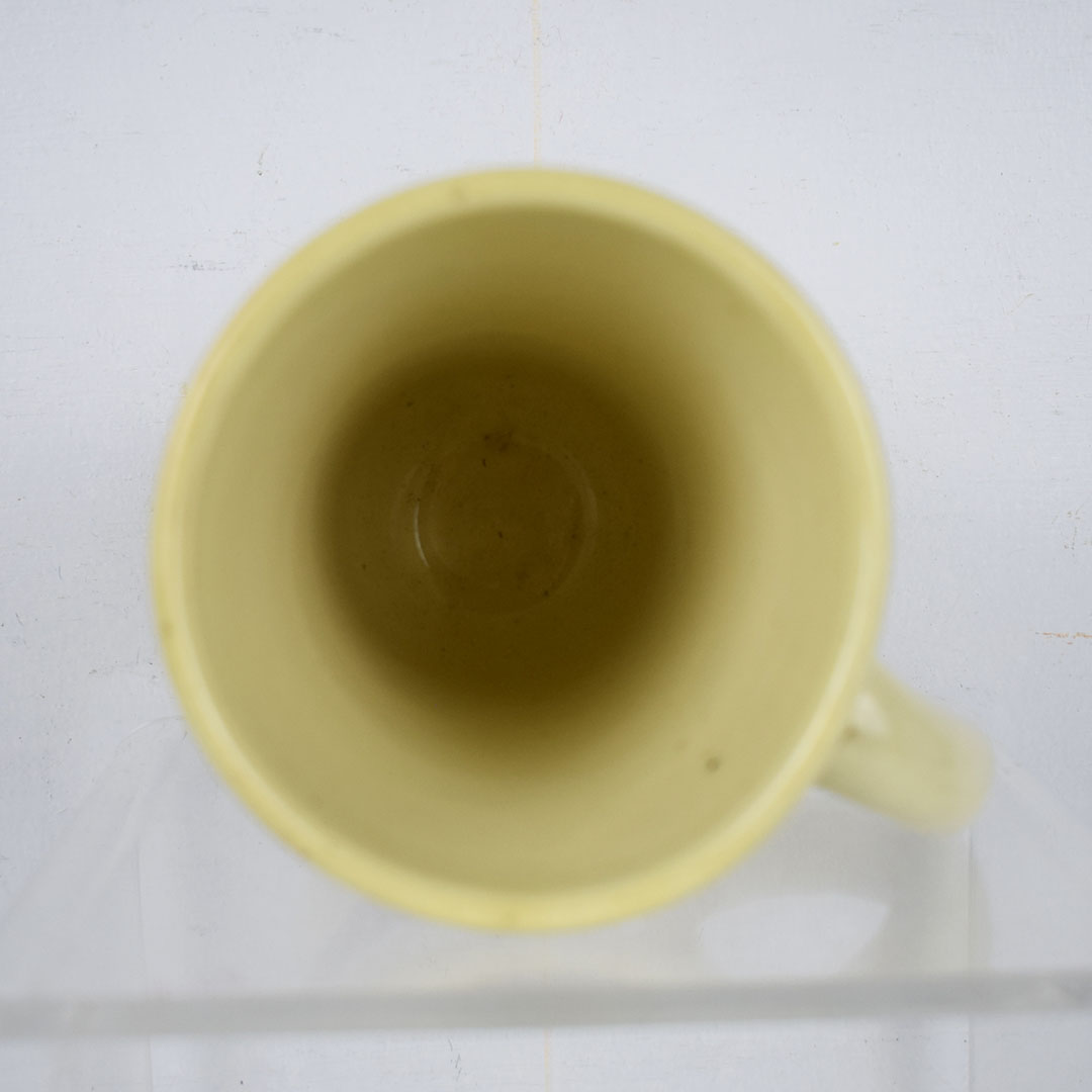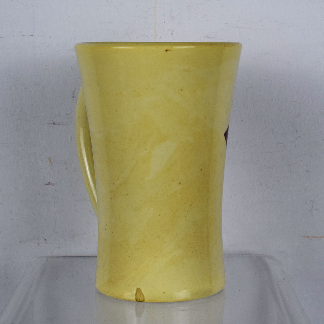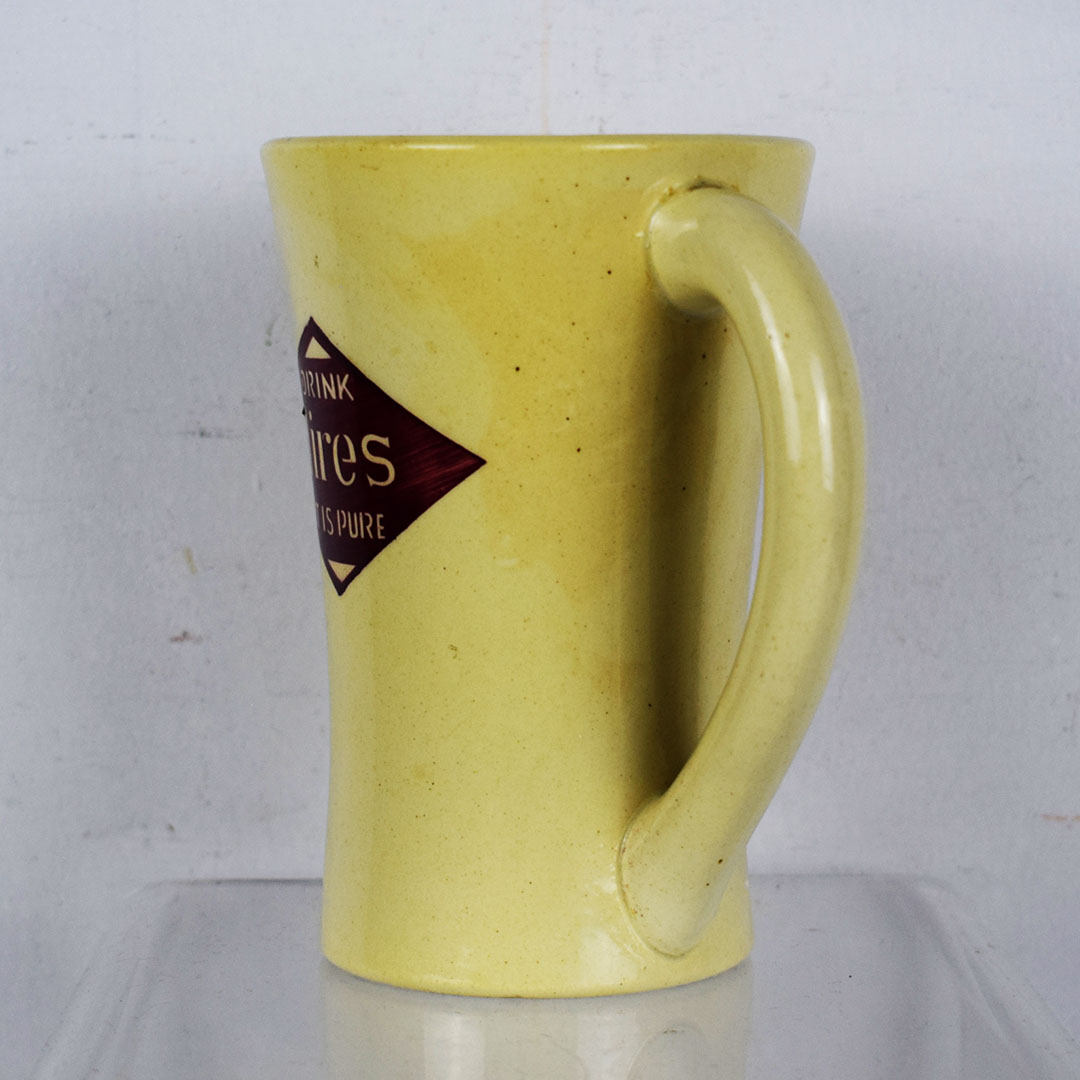 Marked “Germany” on the base, this 5.5-inch tall mug is a beautiful creme color with a red diamond on the side. Inside the red diamond, it reads “Drink Hires It Is Pure” in fantastic colors and print. The mug handle is on the right side, which accounts for 90 percent of the population. The upper lip has one small chip, and the inside is free of syrup stains. As noted earlier, the base is marked “Germany” and has one minor chip. This mug dates from the 1920s and is ready to add to your collection! 21291-RP