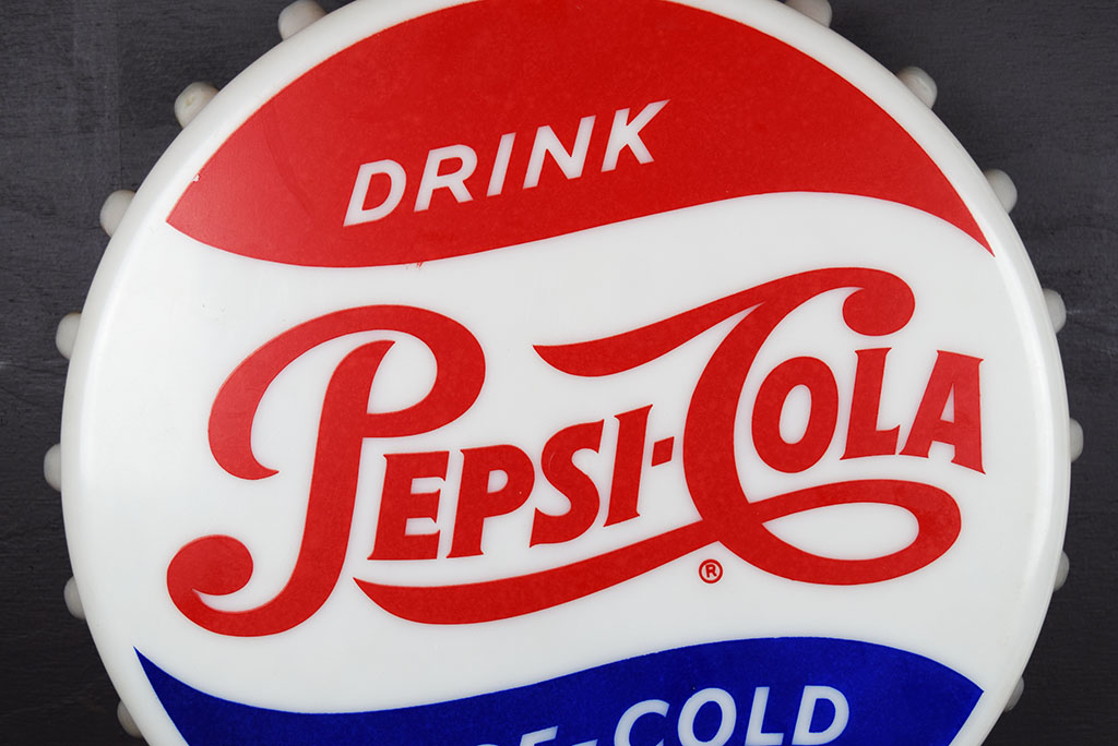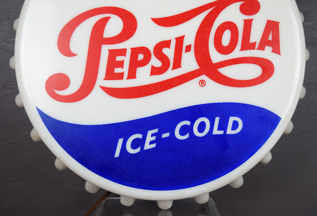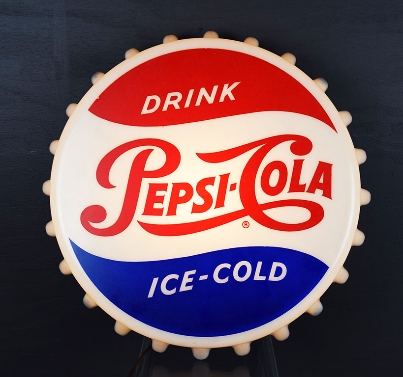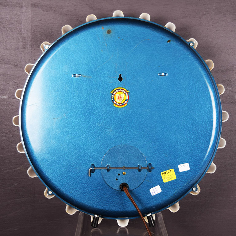 In the vibrant era of the 1950s, a remarkable piece of advertising artistry emerged – a Pepsi Cola light-up sign designed to resemble an oversized bottle cap. The plastic face looks sharp with great graphics and lights up nicely when plugged in. A small scratch in the left upper corner can be seen with a small chip in the paint. The plastic face is free of cracks, and measures sixteen inches across. The back of the light up is metal, and looks great, with just a few scratches from hanging. It is marked “The Ohio Advertising Display Co.” from Cincinnati, Ohio, with a sticker on the back. The cord is original, and it is ready for your collection! 20506-OEP
