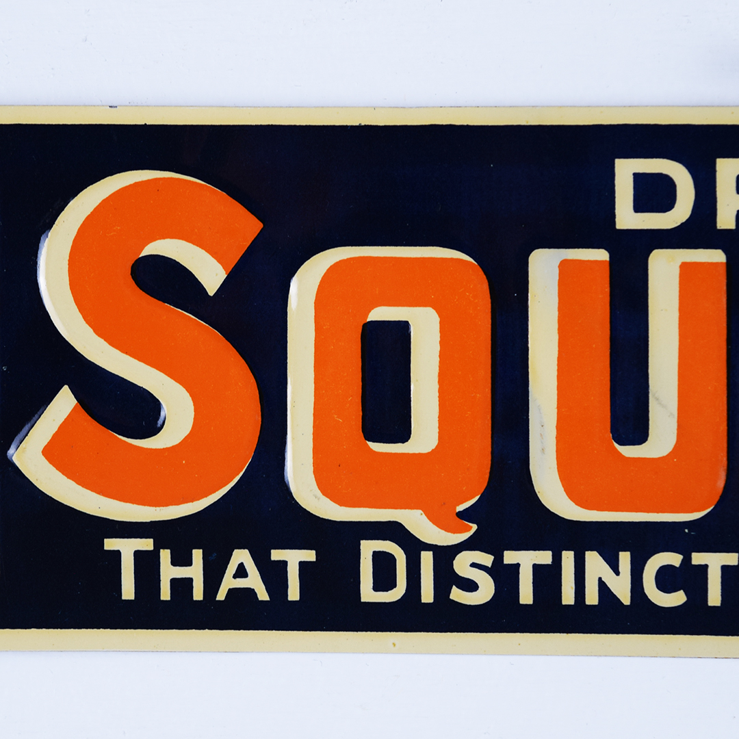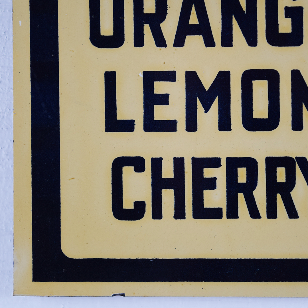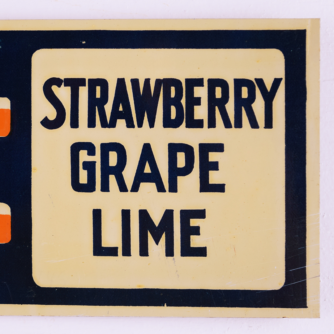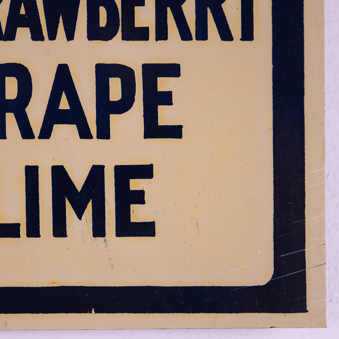 Measuring 4 inches tall by 19.75 inches wide, this Drink Squeeze tin tacker sign features embossed “Squeeze” letters with each flavor on the ends. It lists Orange, Lemon, and Cherry on the left, with Strawberry, Grape, and Lime on the right. Very sharp colors and nice gloss throughout, this tin sign is free of mounting holes. A slight bend with paint loss is along the upper edge, just to the right of the word “Drink,” and measures about an inch in length. Given the condition, this sign appears to be new-old stock, with slight storage damage. You could add a simple frame to this rare sign, or display it on your shelf as is! 21452-QPPP