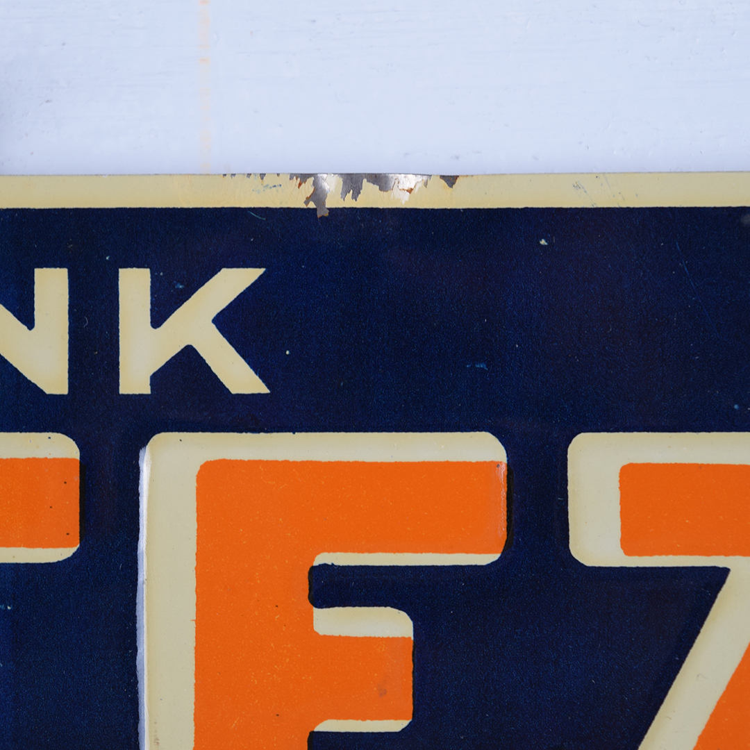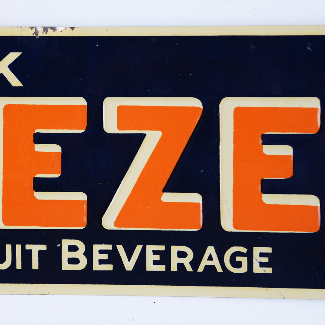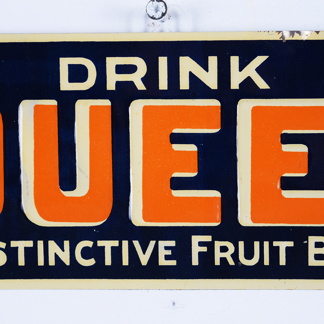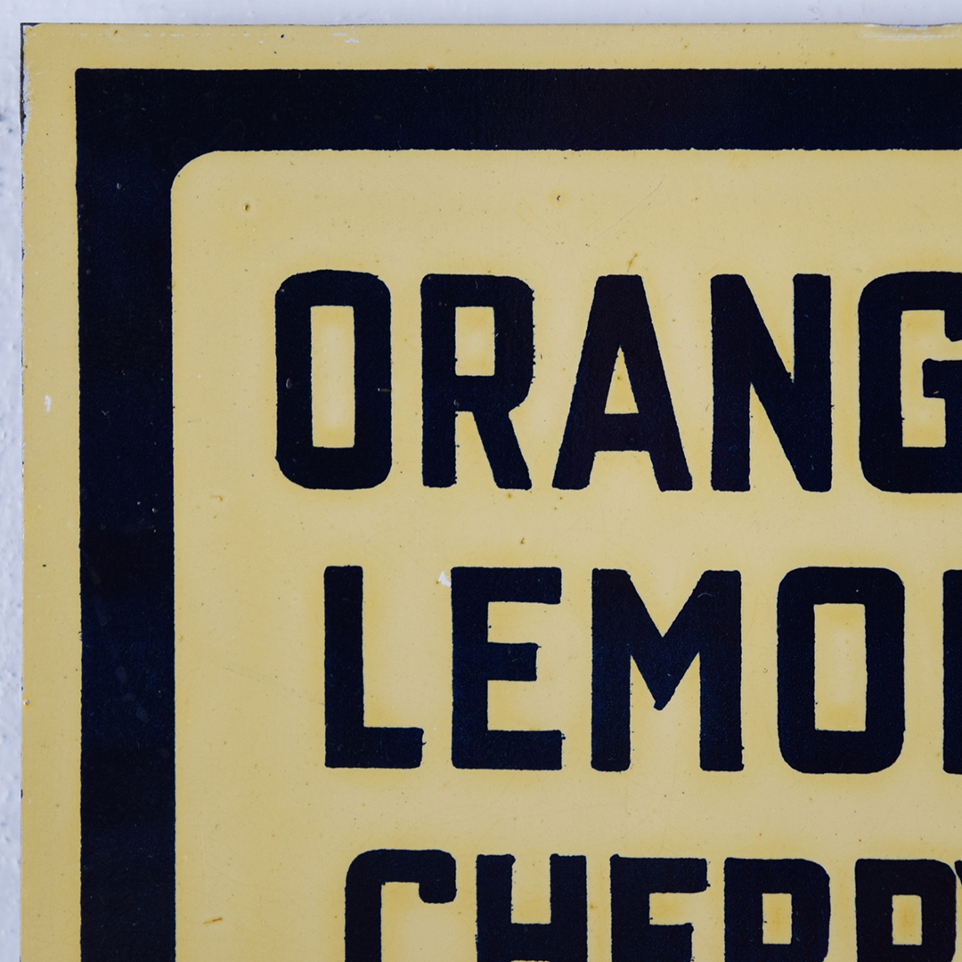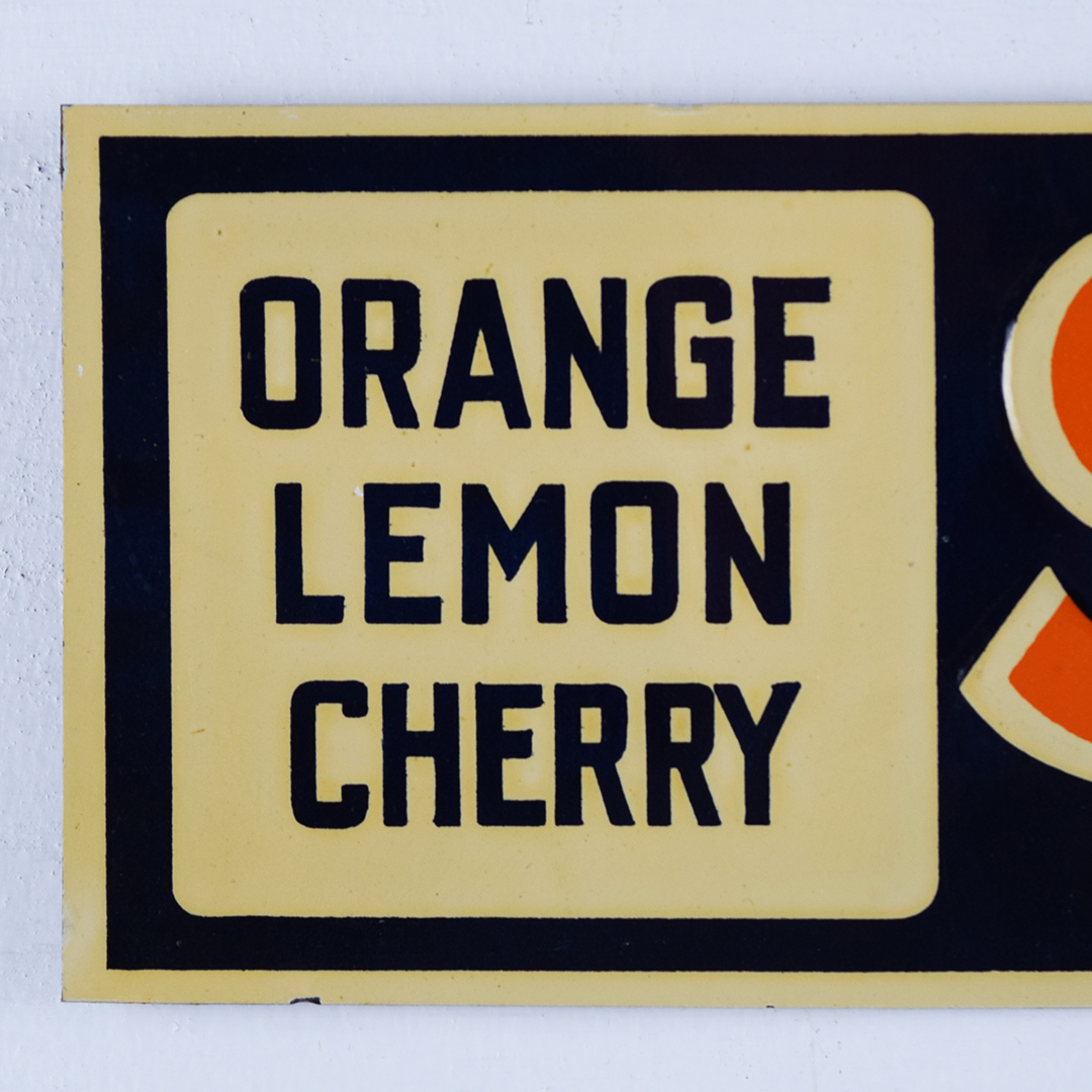 Measuring 4 inches tall by 19.75 inches wide, this Drink Squeeze tin tacker sign features embossed “Squeeze” letters with each flavor on the ends. It lists Orange, Lemon, and Cherry on the left, with Strawberry, Grape, and Lime on the right. Very sharp colors and nice gloss throughout, this tin sign is free of mounting holes. A slight bend with paint loss is along the upper edge, just to the right of the word “Drink,” and measures about an inch in length. Given the condition, this sign appears to be new-old stock, with slight storage damage. You could add a simple frame to this rare sign, or display it on your shelf as is! 21452-QPPP