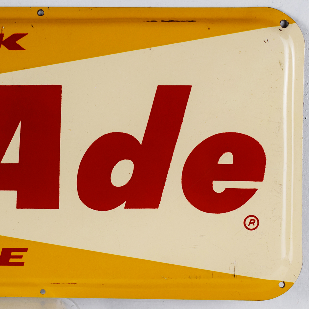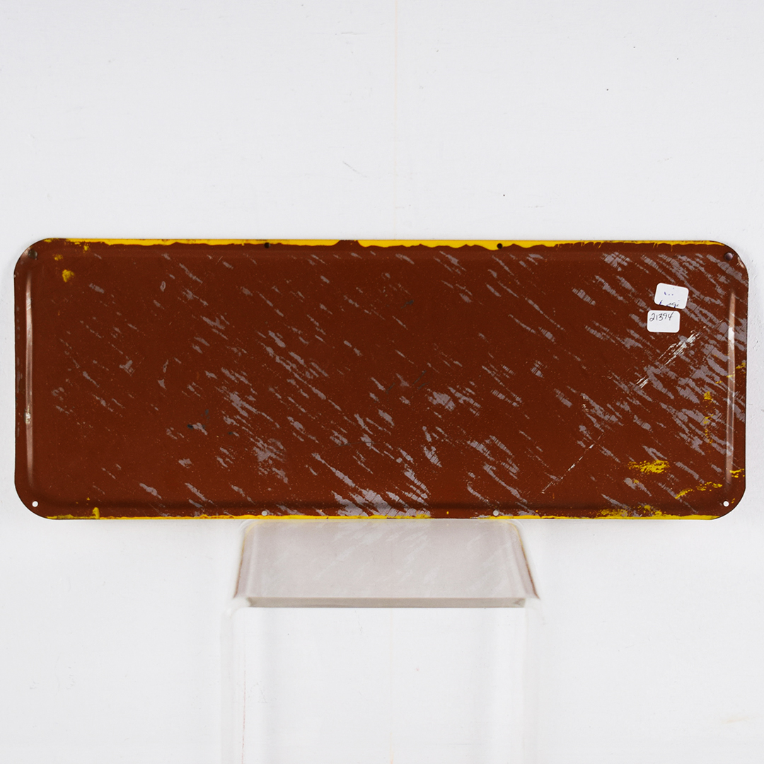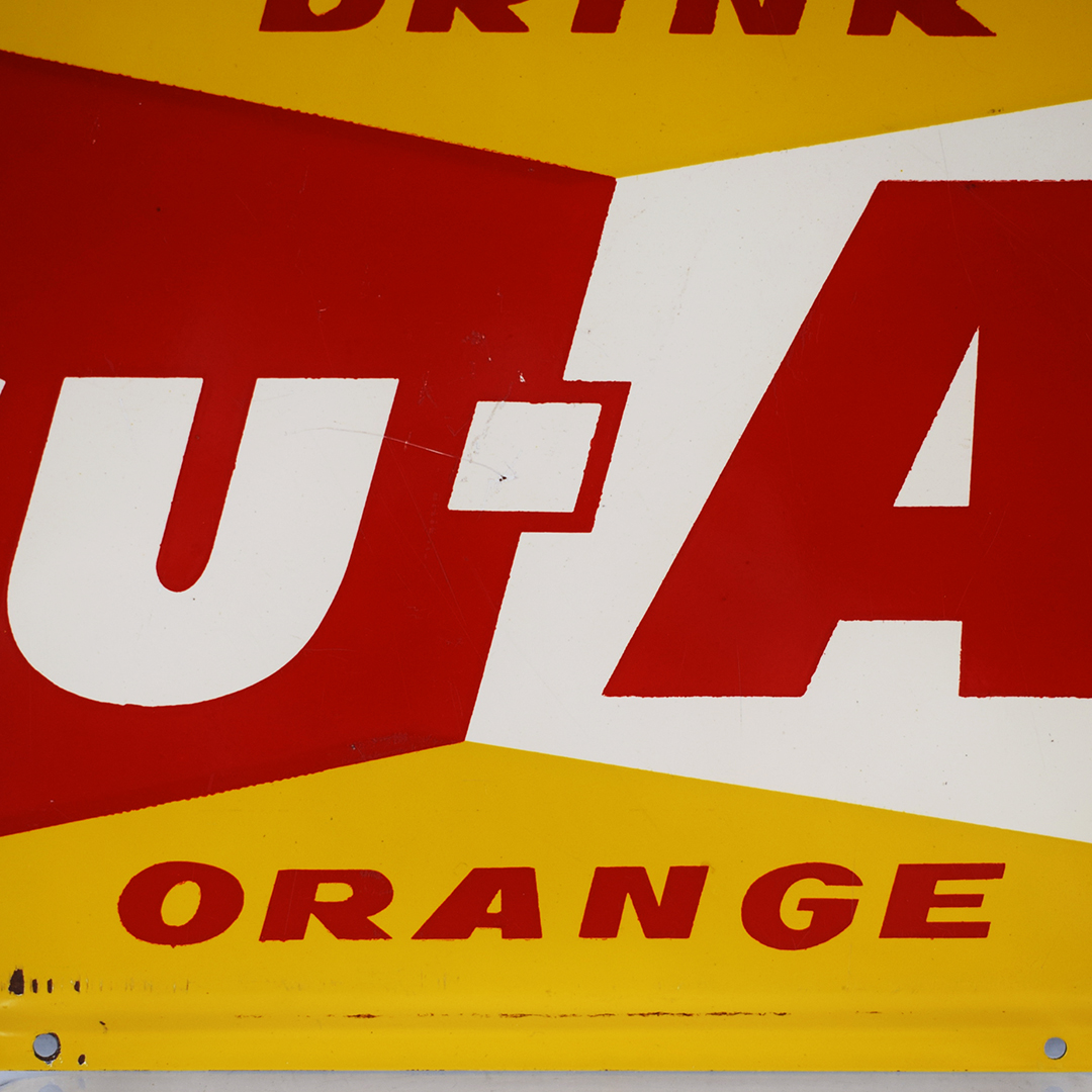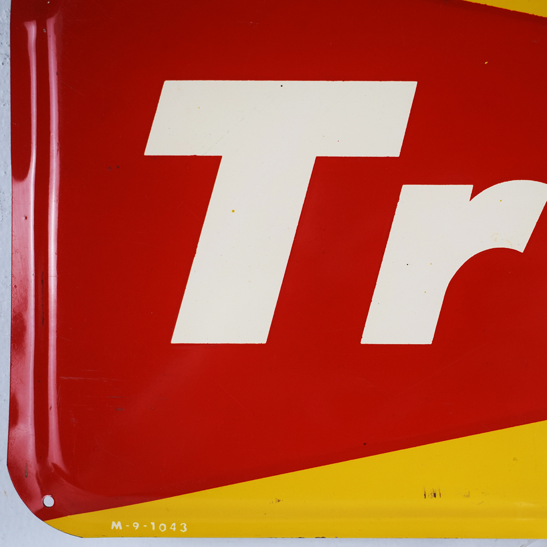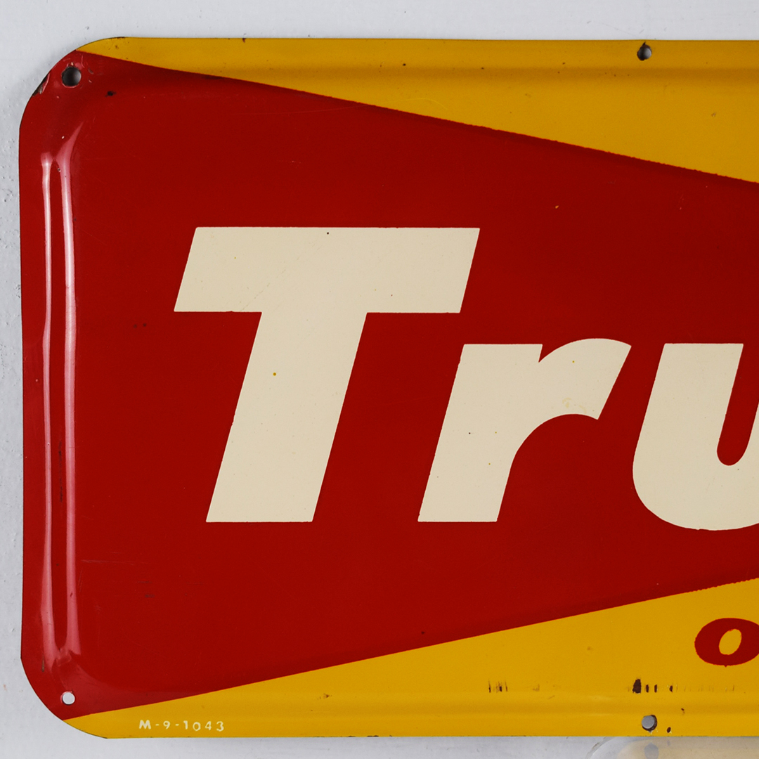 Check out this great, smaller Tru-Ade sign that you don’t see too often! Measuring 6.5 inches tall by 17 inches in length, the outer edges of this steel sign are curved inward, the total opposite of many self-framed signs of the era. Sharp colors and nice gloss throughout, with “Drink Tru-Ade Orange” on the face of the sign. A few very minor scratches in the field, with some chips along the bottom edge and along the top. It is marked “M – 9 – 1043” along the left bottom edge. 21394-EEP