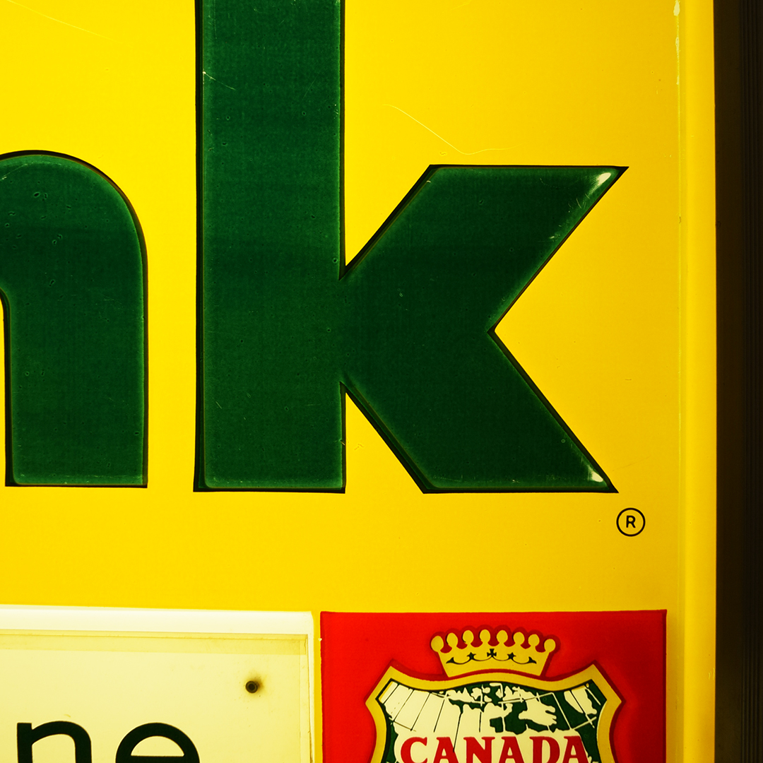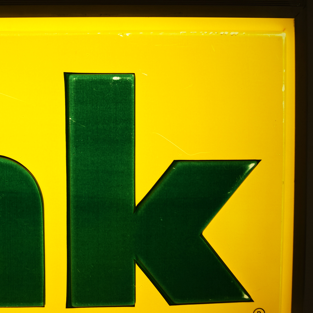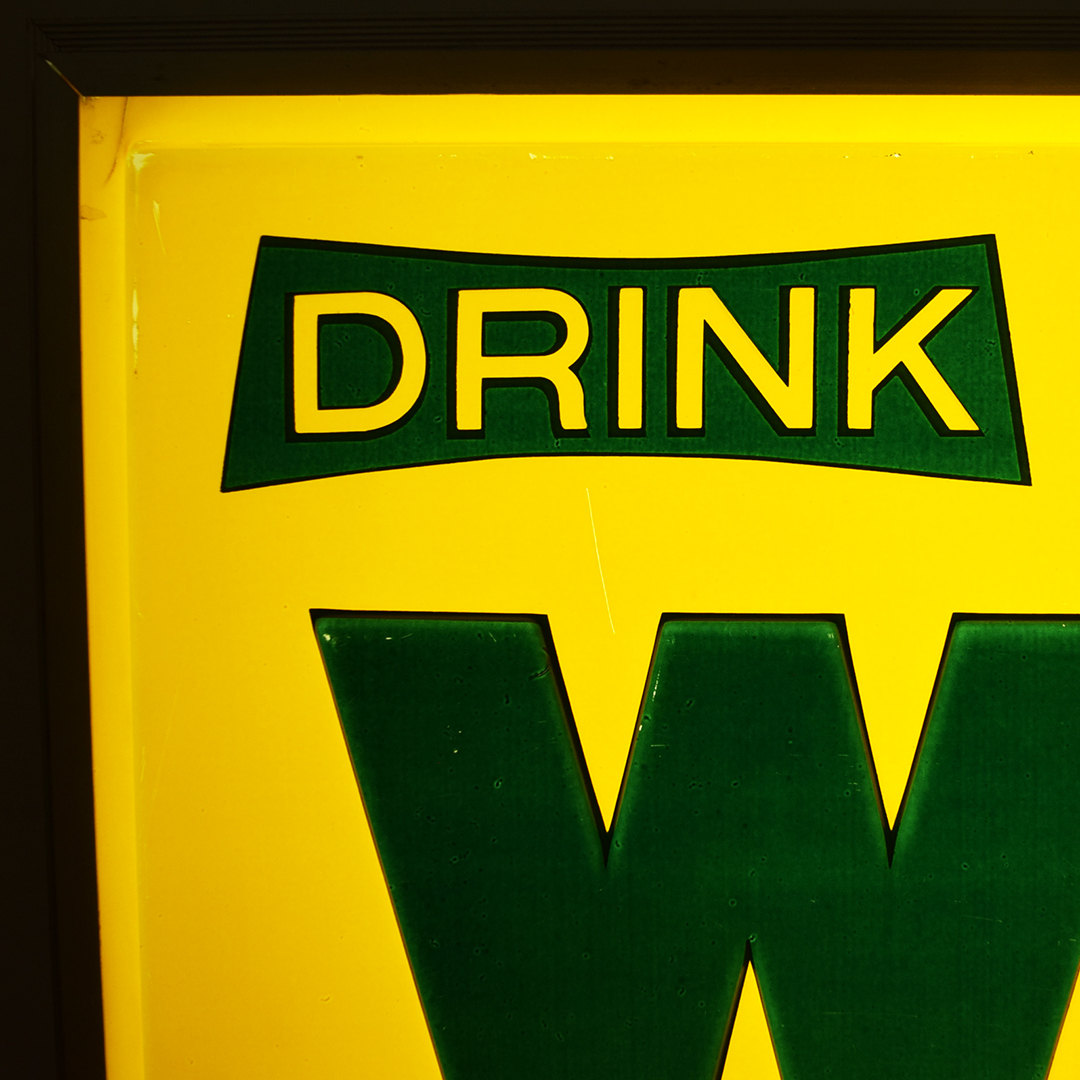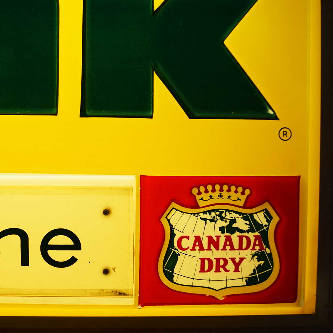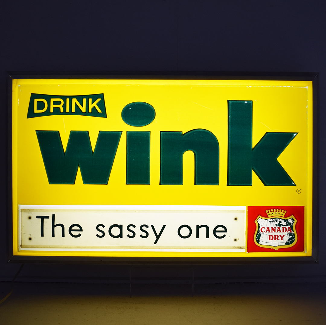 Take a look at this original 1960s Drink Wink light-up soda sign, which measures 26.25 inches long, 16.25 inches tall, and has a depth of 4.75 inches. Wink was introduced by Canada Dry in 1965 as a caffeine-free, non-cola drink with a grapefruit citrus flavor. This sign is very cool with forest green raised letters, yellow background, forest green “The sassy one” letters on a curved plastic panel, a heavy, thick aluminum frame, along with red, gold, and green Canada Dry crown logo. The sign was manufactured by N P I (Neon Products Inc.), as marked on the rear metal panel. The plastic face has very minor wear marks on the outer edges, with a few marks on the green ‘k’. The curved plastic panel, which reads “The sassy one,” has a one-inch crack on the left side, near the outer frame. Once plugged in, it lights with ease and looks amazing when lit! Super nice soda sign from a lesser-known brand that will be a hit in your collection! 21423-YPP