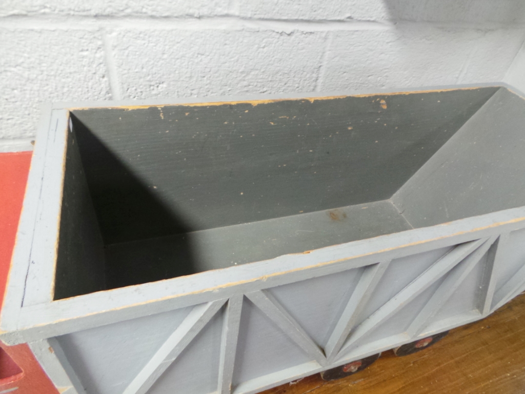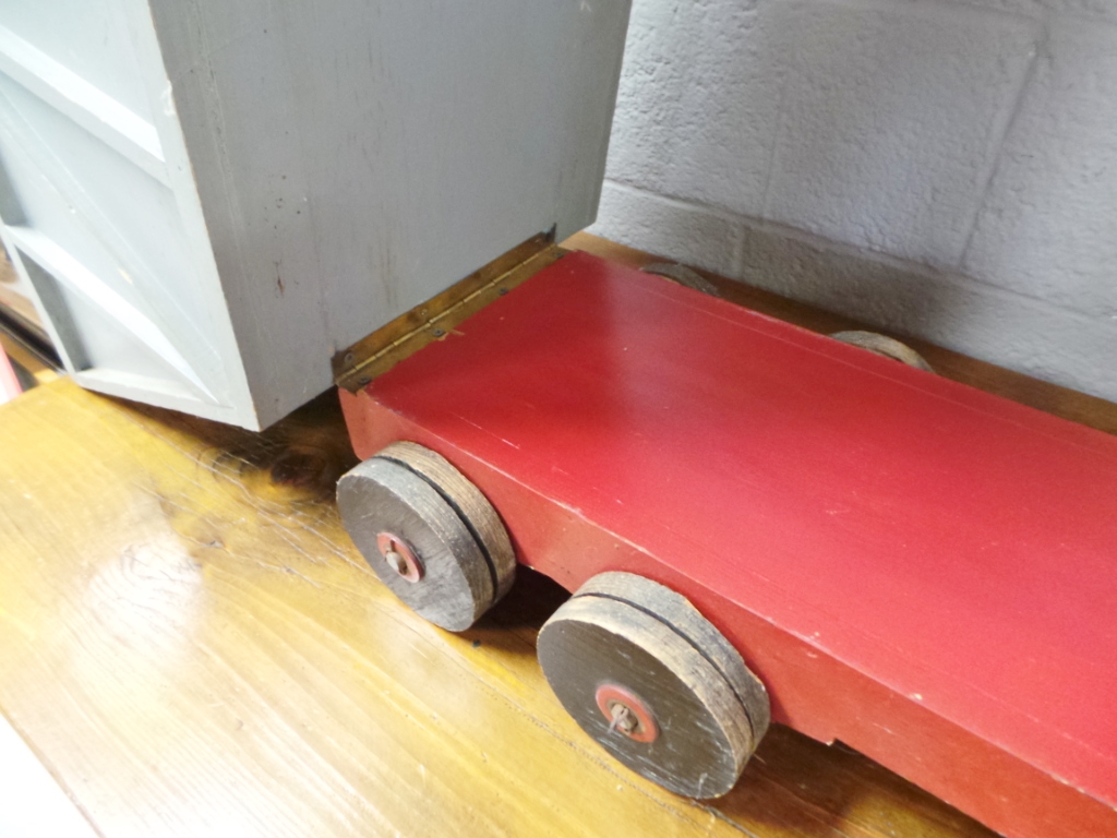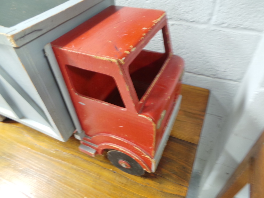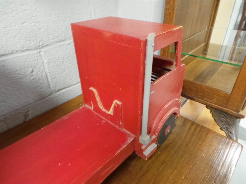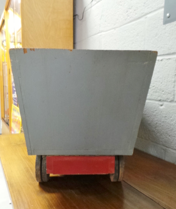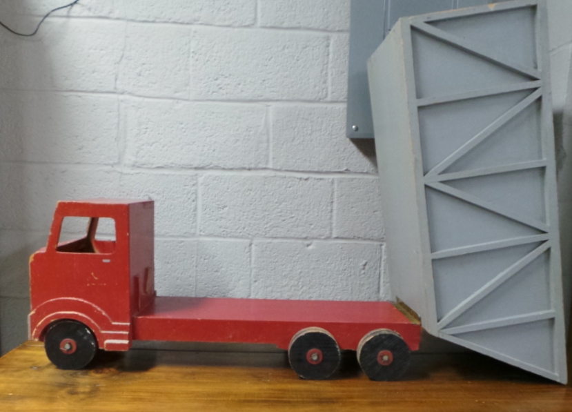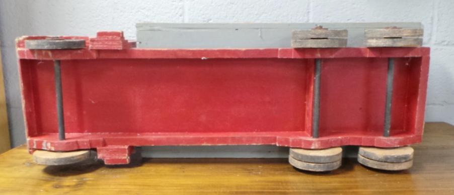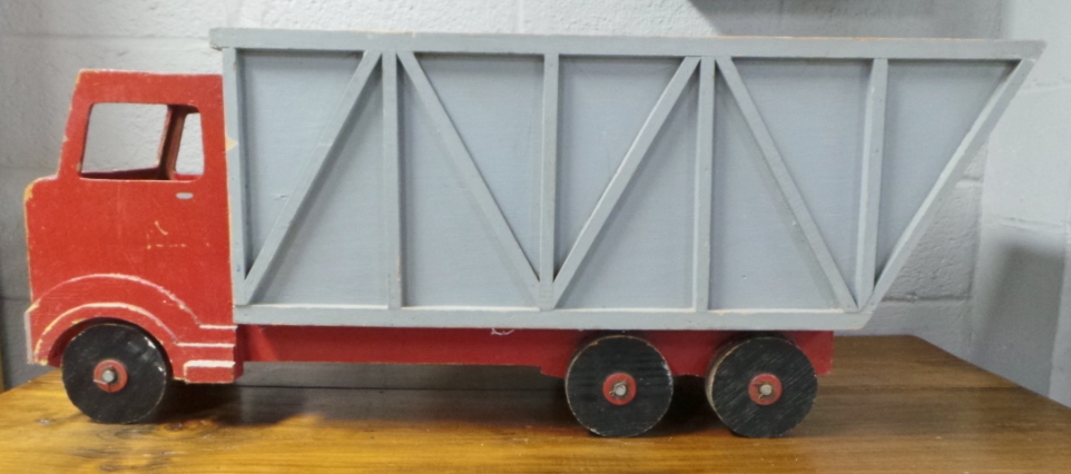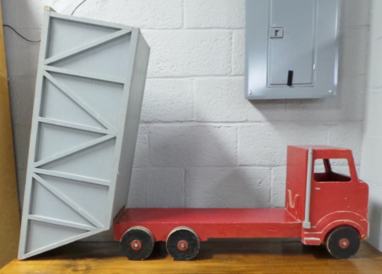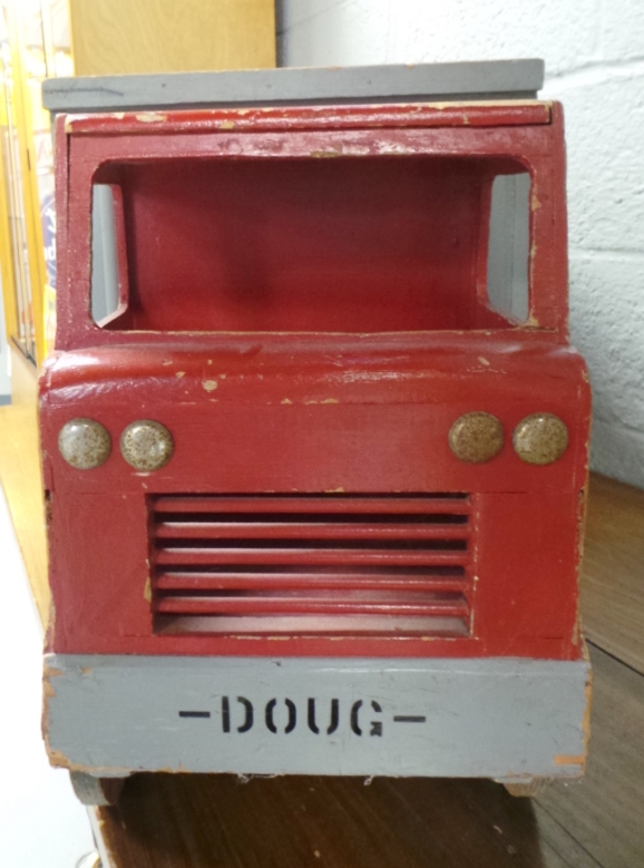 Have you seen Doug’s truck? Well now you have!! This neat older wooden dump truck looks to have been made especially for Doug, as it has his name stenciled in the front bumper. If you don’t have a Doug, it can easily be repainted with another name. This cool truck is forty-two inches long, sixteen and a half inches tall, thirteen inches wide and very heavy! It features a working dump bed, wheels that actually roll, and a smoke stack on the right side of the cab. Imagine all the hours your child or grandchild will enjoy playing with this at your home. Or better yet enjoy it yourself in your collection! It has minor wear in various places on the truck cab, the dump bed, and the wheels. It looks like it was handmade which you do not find anymore, so this is a great treasure to have! 18174-51QEQ