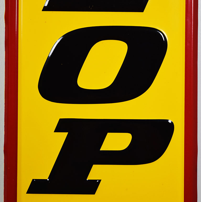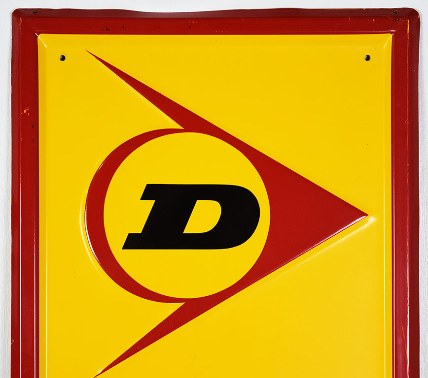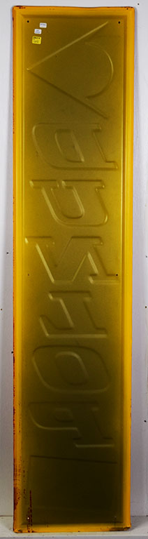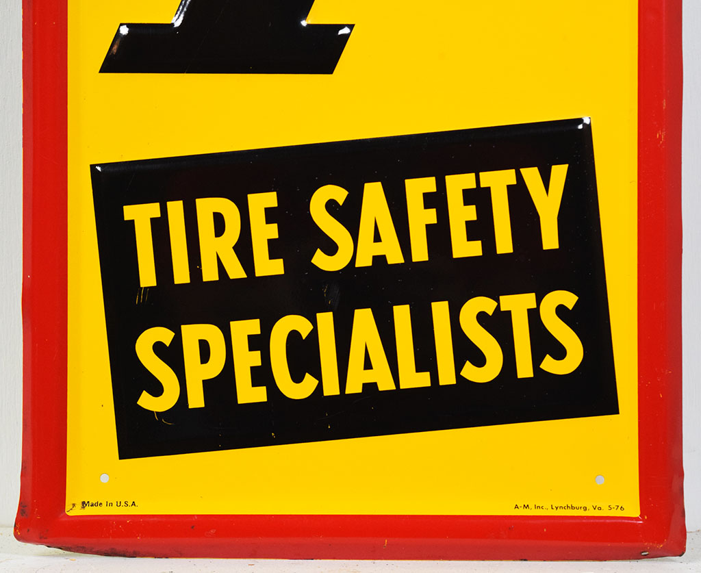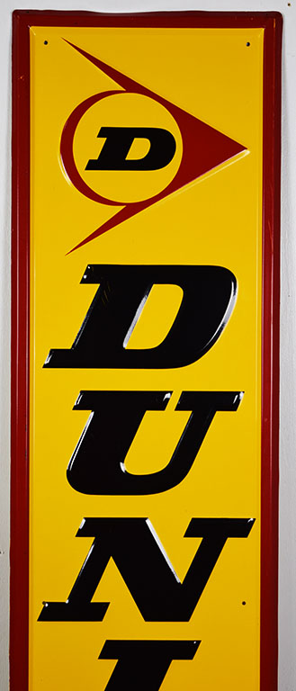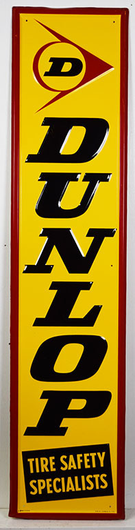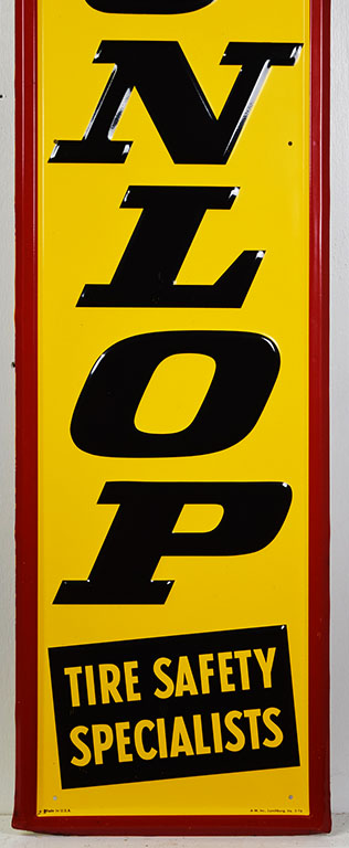 The sign depicts the iconic red and yellow Dunlop logo, which is embossed with raised lettering to create a sense of depth and dimensionally. Almost sixty inches tall, this sign was designed to fit nicely on the posts between service station doors to advertise that the station was “Tire Safety Specialists”. A few small scratches can be seen on the raised black letters, along with a few marks on the red outer frame. It is marked “AM, Inc. Lynchburg, VA 5-76” in the lower right corner, and has some light bends on the left lower corner. Beautiful sign that is seldom seen will make a nice addition to you collection. 20363-UIP