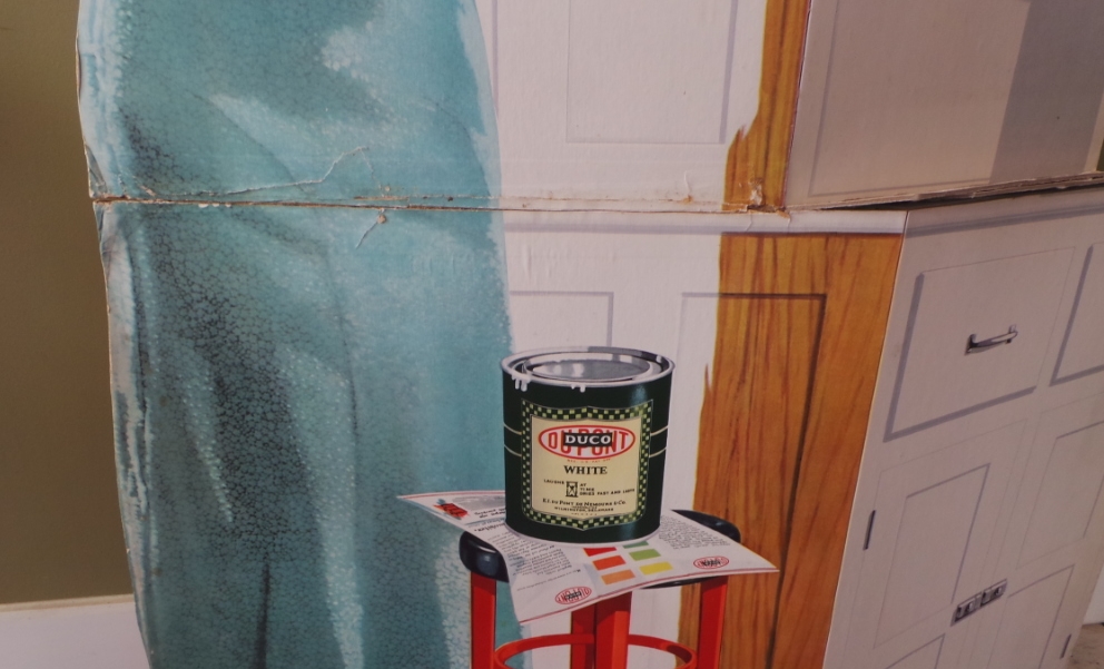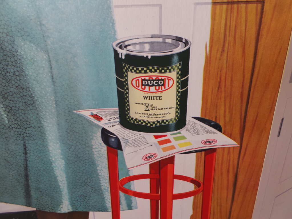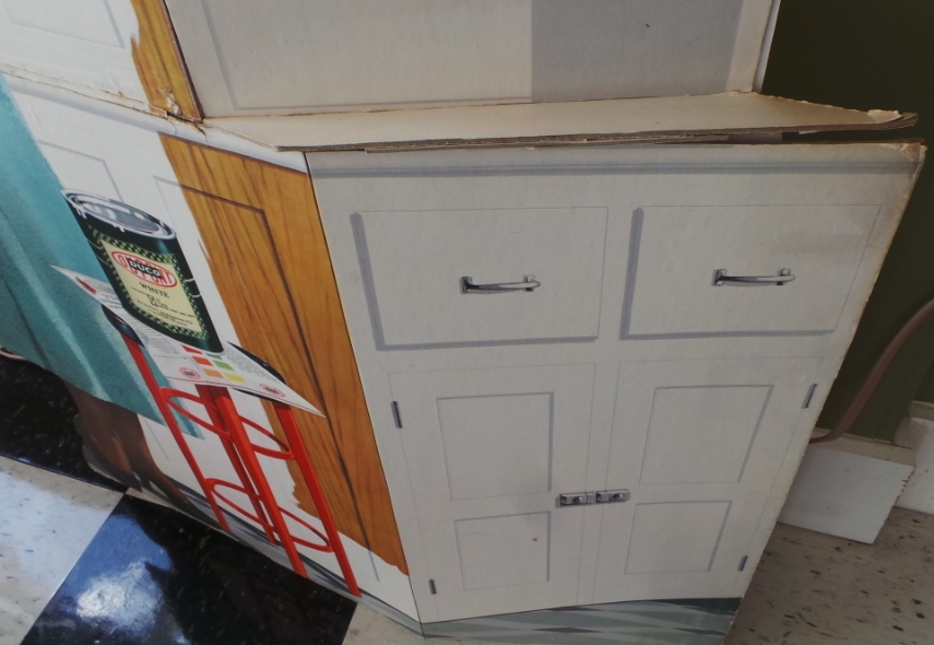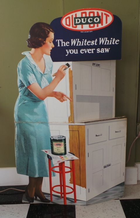 Wow, lots of folks collect tin signs but here is an outstanding tall cardboard display that would have been in the local paint store. Advertising the Dupont Deco paint for your kitchen cabinets. Shows a lady with a paint brush, Duco paint on a stool and color chart under it. It is a 3-D type, in that the cabinets fold out. Colors are nice and bright. Folding area has been reinforced and the normal wear and marks on the fold. This has an original easel back and can be folded for shipping. I doubt you will ever find another of these. 9936-WTP
