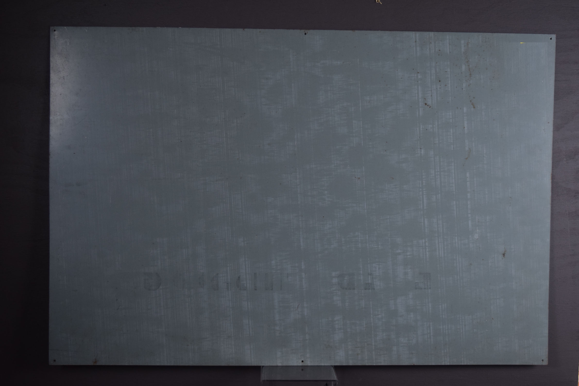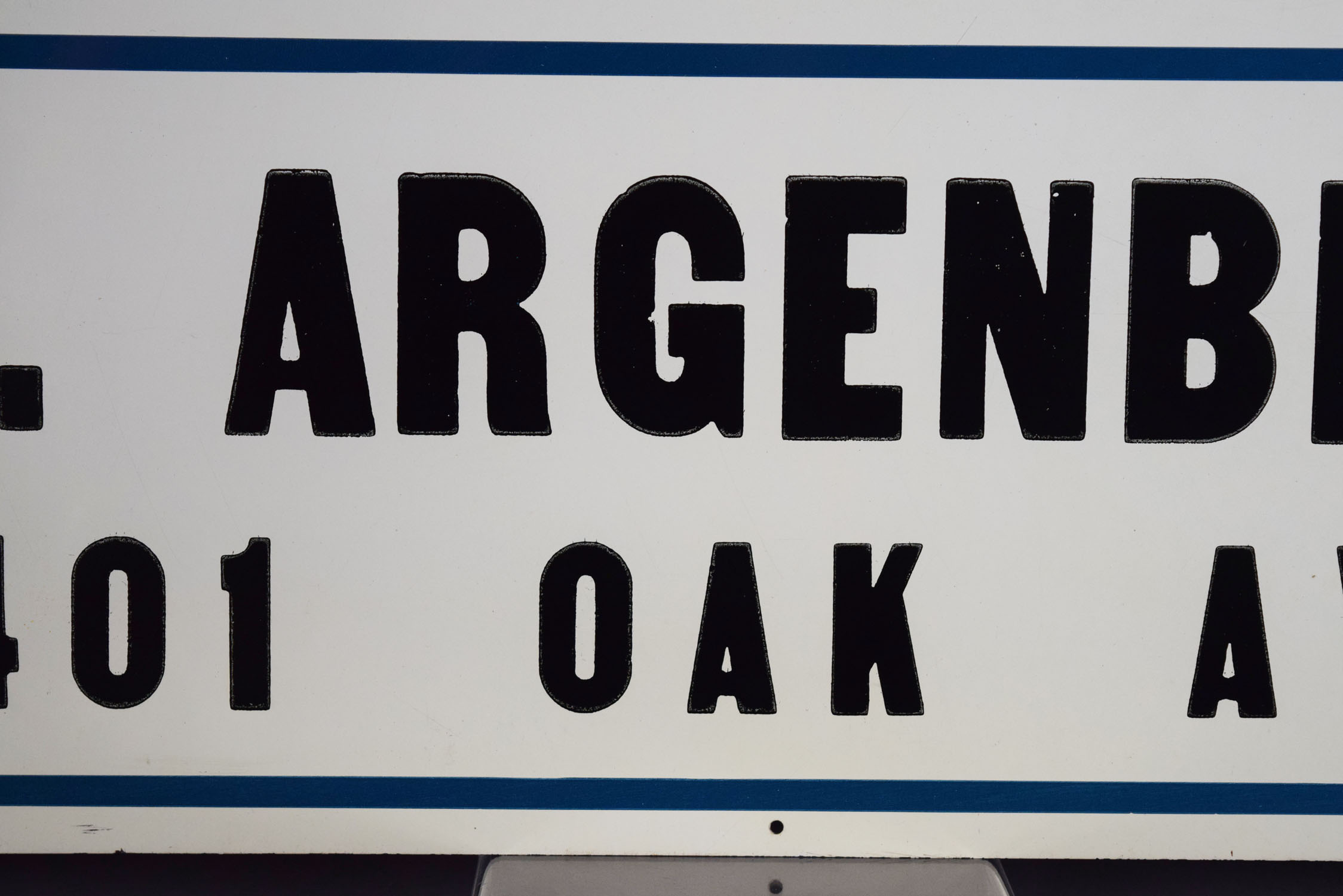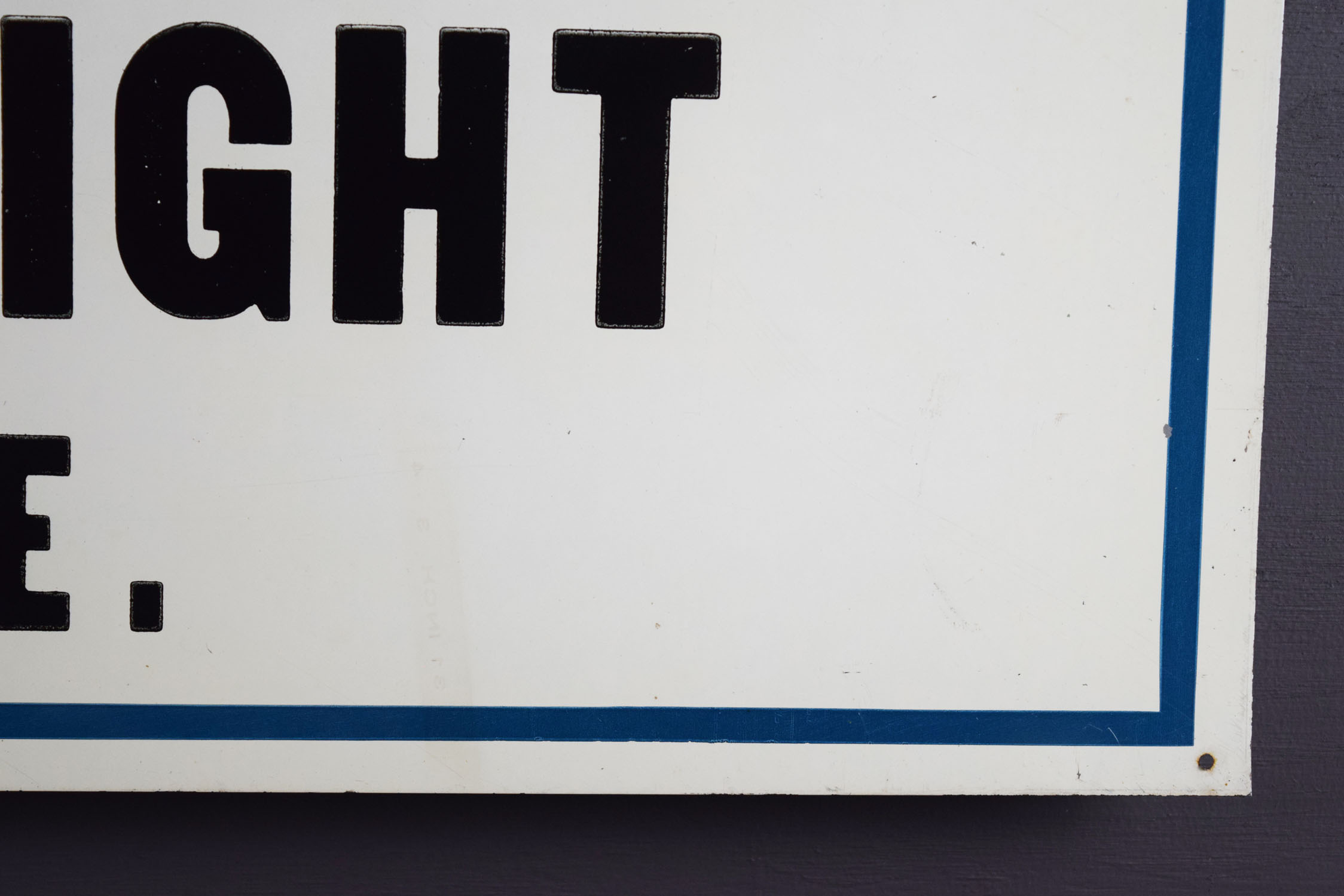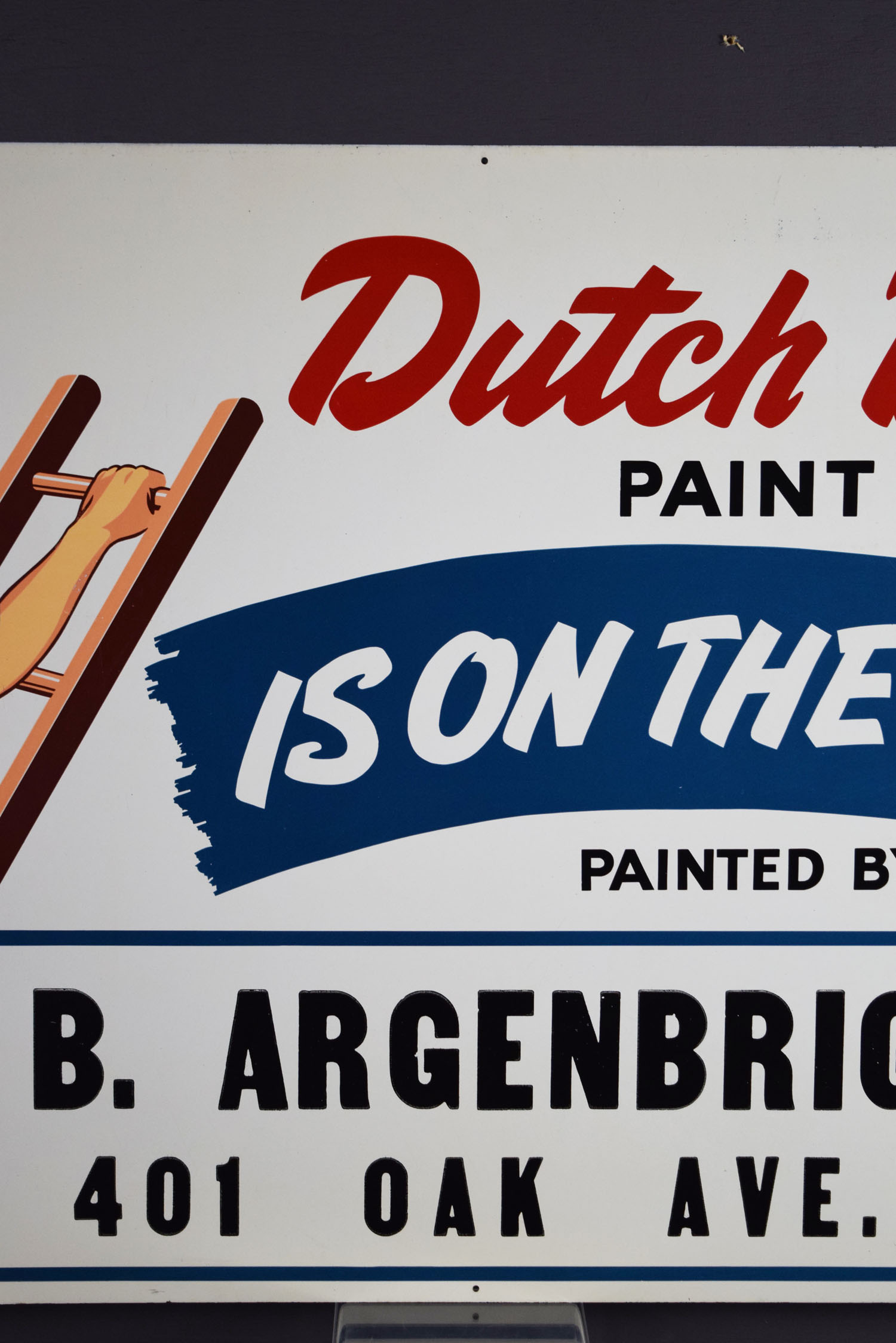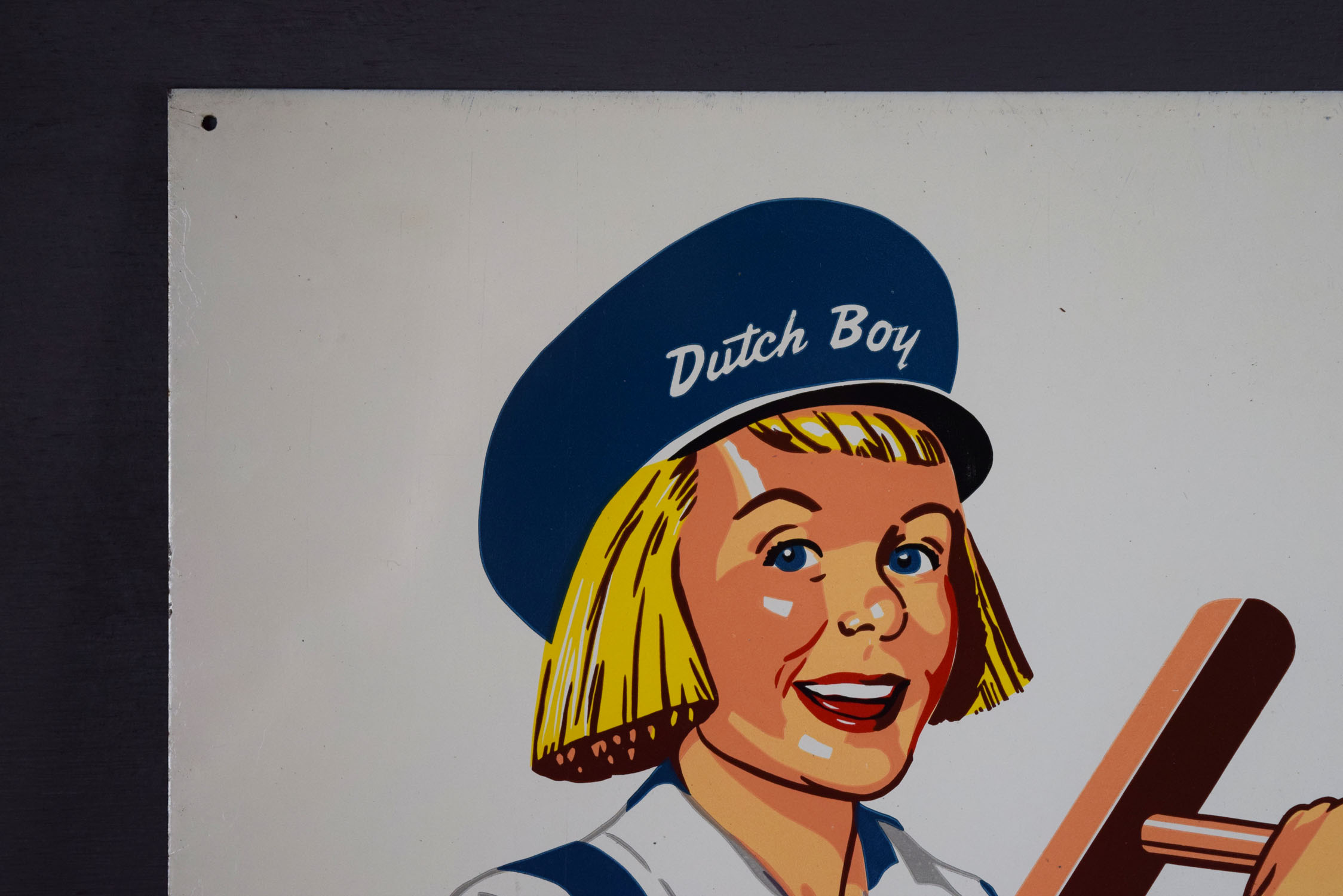 Used by painters to let potential customers know they only used Dutch Boy paints, this metal sign dates from the early 1950’s and is in super nice shape! Dutch Boy gave these beautiful signs to paint contractors who painted with Dutch Boy paints as a thank you, and the bottom privilege panel had their name and address added. The sign appears to be in unused condition, as the mounting holes are flat, with just some minor chips around the outer lip of the sign. The gloss is great, with just some typical production marks on the face. It is marked “The Donaldson Art Sign Co.” in the lower left corner, and “Reg. U. S. Pat. Off. – National Lead Co.” above the privilege panel on the right size. It measures just under two foot by three foot so it will fit in a frame with ease. 19700-OOP