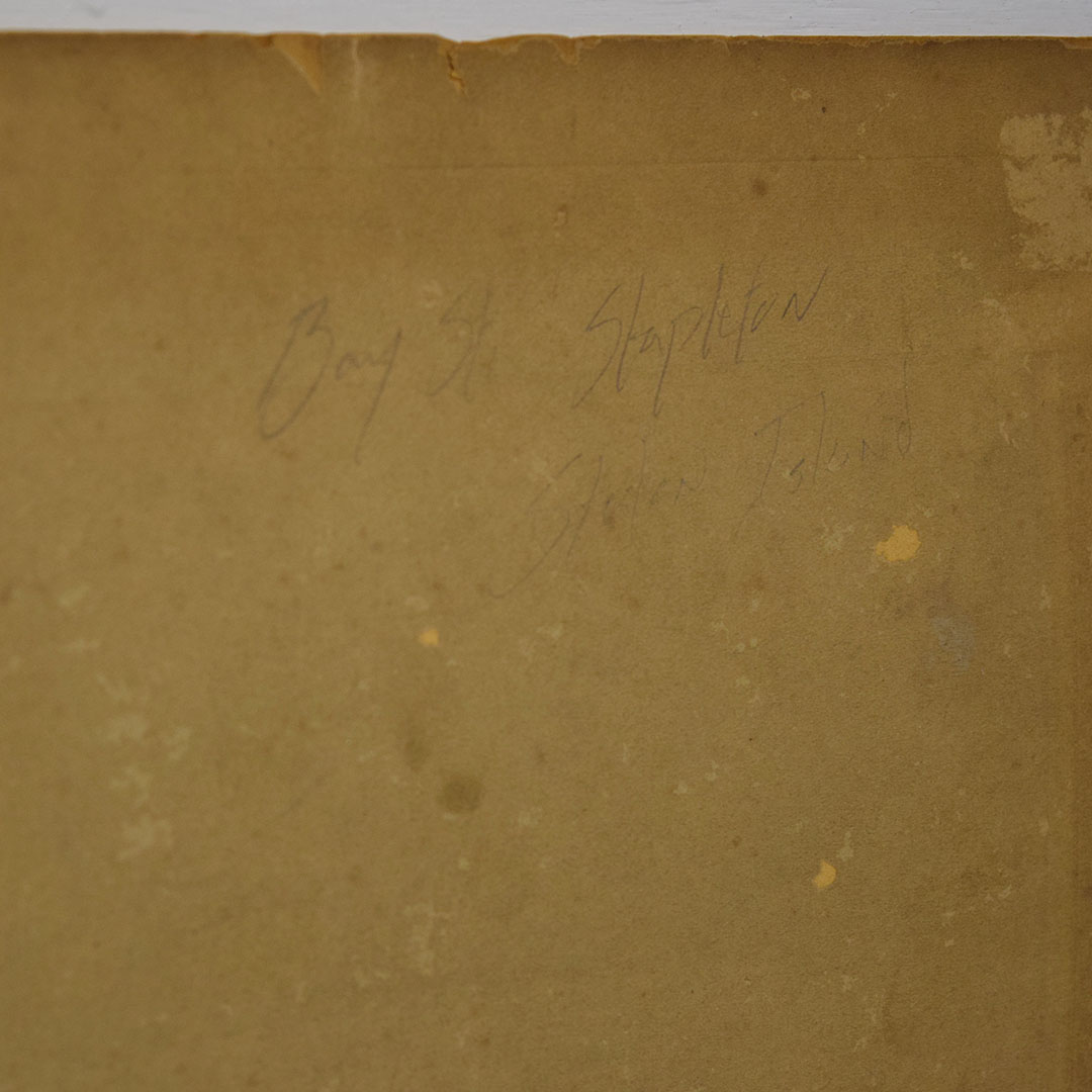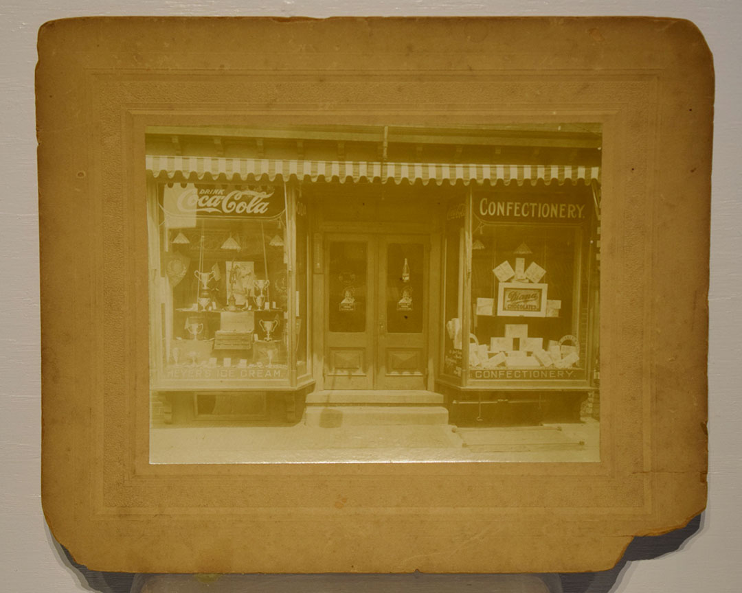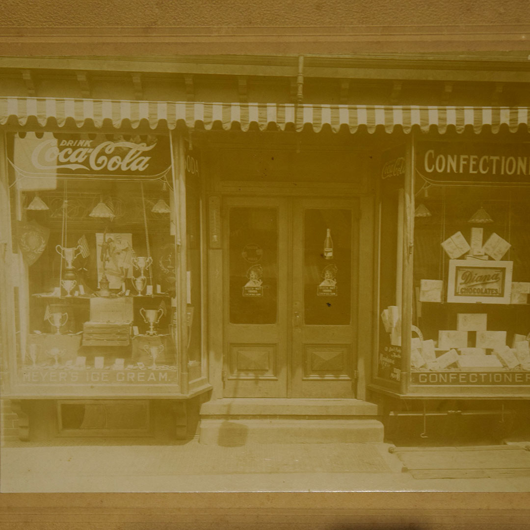 If you love seeing advertising in old pictures, you have to check this great black and white store front picture out! At the top of the glass you can see “Drink Coca-Cola” and “Confectionery” on the store front glasses, with “Soda” and “Coca-Cola” on the smaller glass leading into the store. At the bottom of the glass, you can see “Myer’s Ice Cream” on the left and “Confectionery” on the right. On the glass doors, you can see “Beech-Nut Chewing Gum” decals on both doors, along with “Tootsie Rolls” and “Welch’s” decals on the doors. The left side of the store front has trophies in the windows, and the right side shows boxes of “Diana Chocolates”! This black and white picture has been mounted to a decorative backer to lengthen the life of the photo. On the back it is written “Bay St. Stapleton Staton Island” in pencil. The corners of the backer are worn, but you could easily trim and frame for your collection. 18509-TP