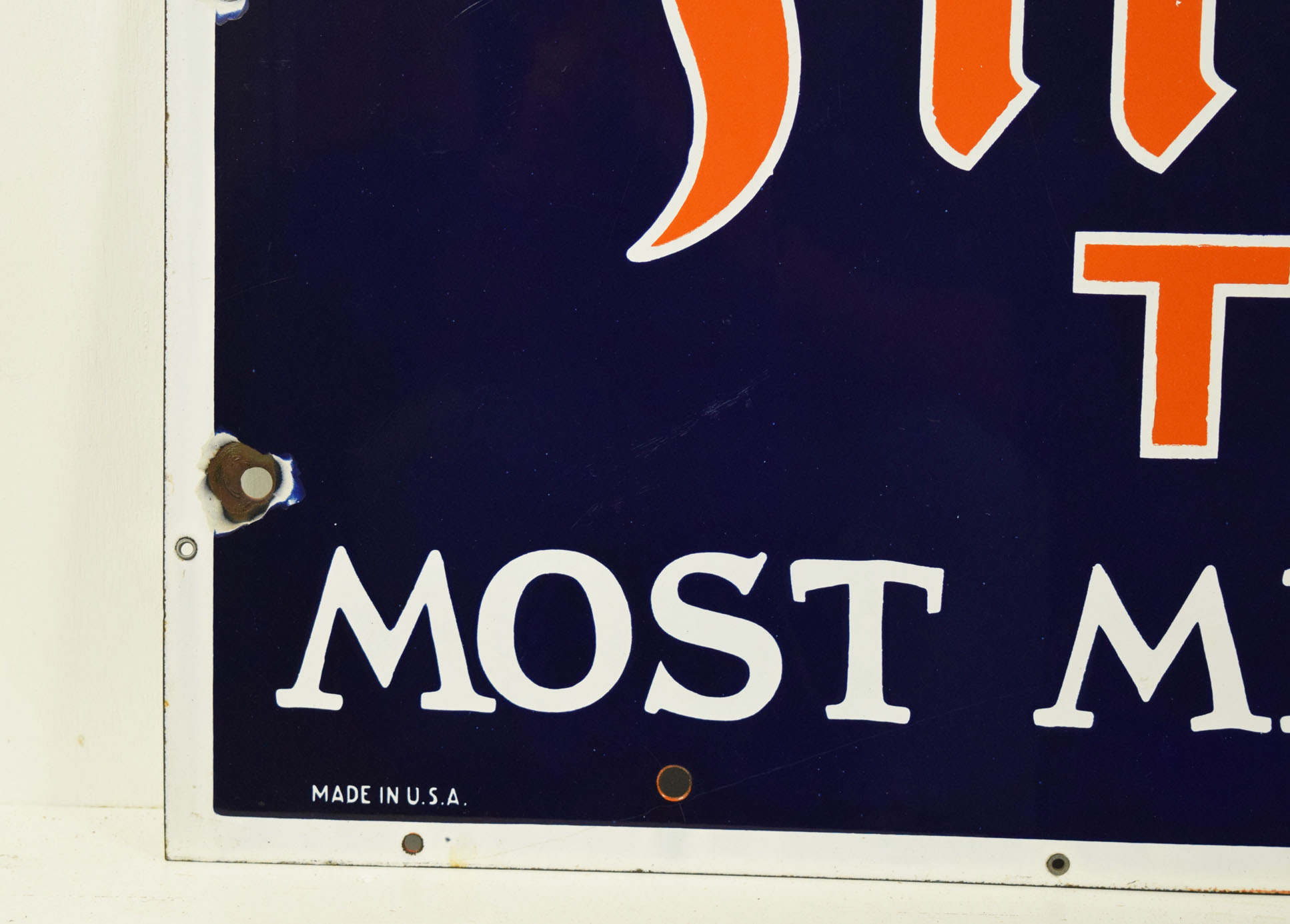 Signs were made to last in the early 1930’s, just like this beautiful Firestone Tires porcelain example! Measuring twenty inches tall by forty-eight inches long, the colors on this original sign are amazing and vibrant. The white outer boarder has some minor chips in the porcelain, and is marked “Baltimore Enamel, 200 Fifth Ave N.” in the lower right corner. Also in the white border, many of the original aluminum grommets are still installed. The larger holes just inside the border have some slight chipping in them from the age of the piece. The center field is just amazing and you could not ask for a better looking porcelain sign that is almost a century old. Don’t let your neighbor beat you to this incredible piece of history! This is an oversized shippable item. Please contact us for shipping info. 19278-WQYP