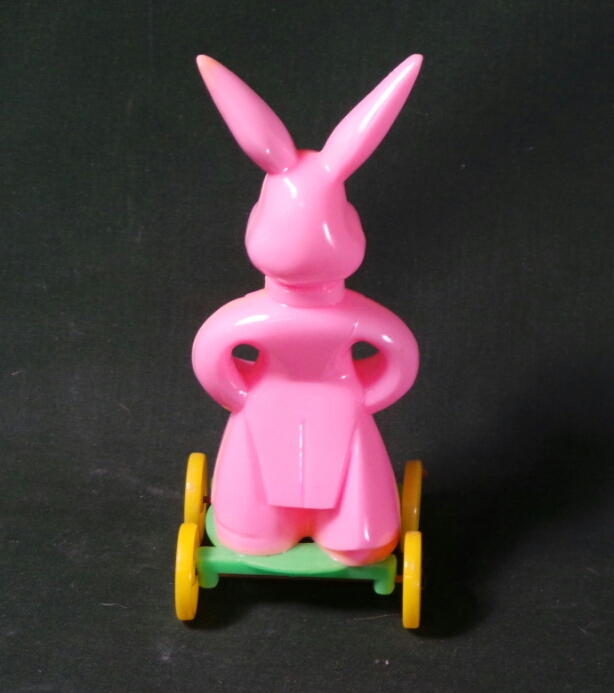 This neat Rosbro candy container dates from the 1950’s. It is a pink plastic Easter Bunny standing on a green platform with yellow wheels. His hands are designed to hold lollipops and the platform has a hole in the front for tying a string and creating a pull toy. He measures about six inches tall by two and a half inches wide and is in excellent condition with minor paint flakes on his ears. 9219-QT