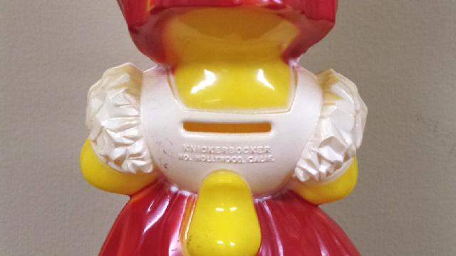 This sweet figural still bank was manufactured by Knickerbocker Plastics in North Hollywood, CA. during the 1950’s. It is made in the shape of a bespectacled female Easter bunny in a red dress and scarf, holding a little pink bunny. She is wearing a white apron and has white petticoats poking out below her dress. Still has the original coin plug in the bottom. She measures 11 1/4″ tall by 5″ wide and is in excellent condition with some minor scuffs and scratches. 8744-31TO