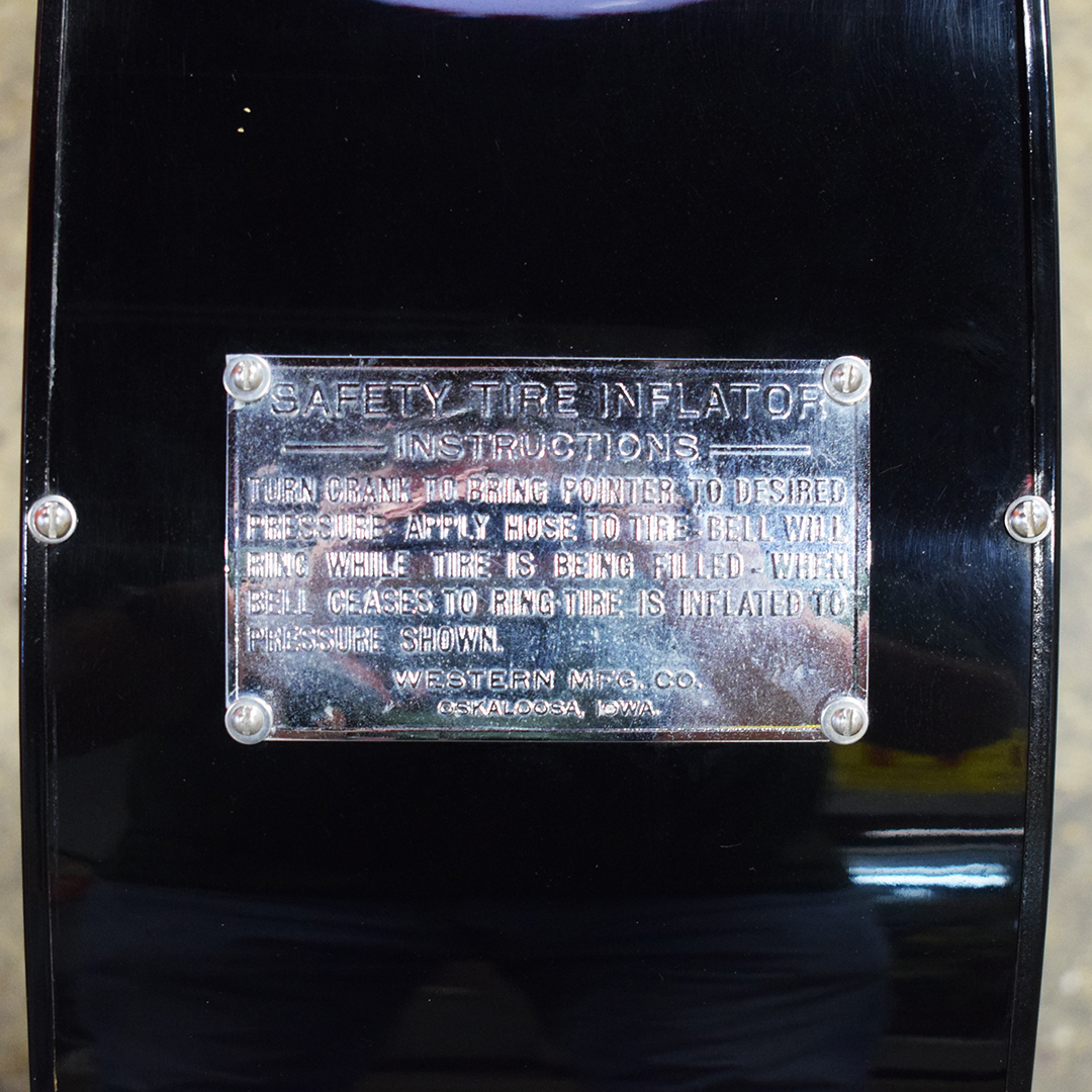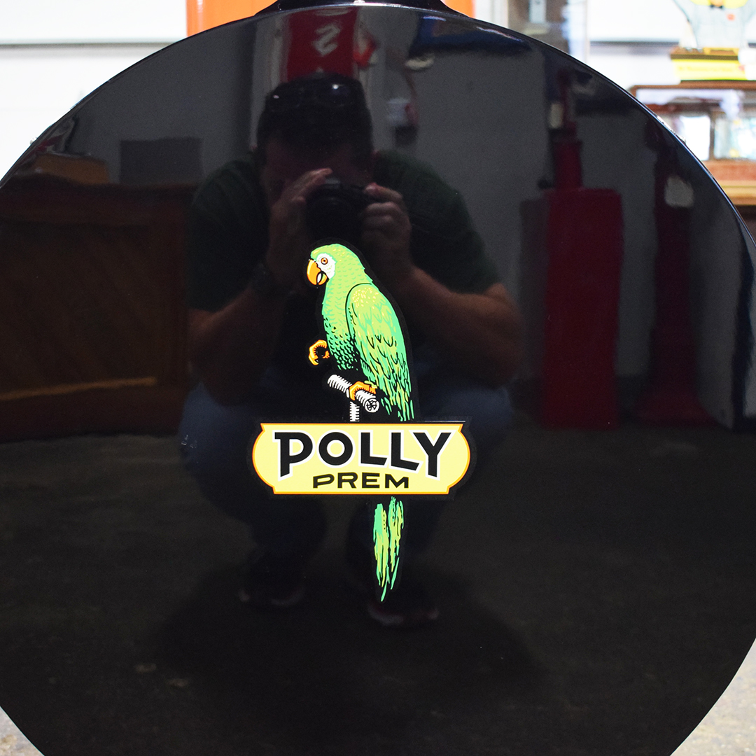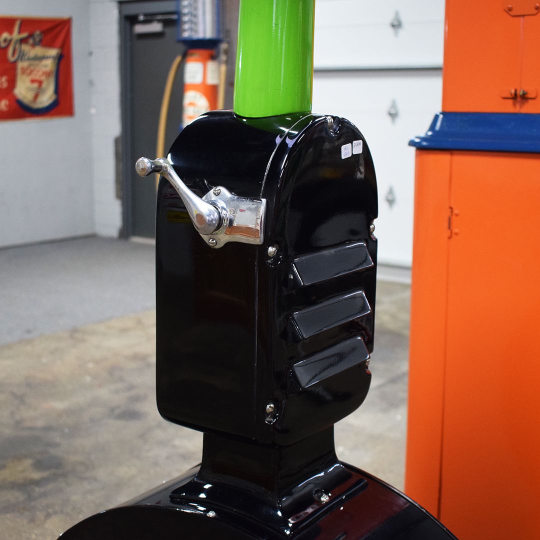 Seldom seen, this Eco Tireflater Air Meter Model 20 has been restored in Polly Gasoline colors and is ready for your garage or office. What sets this air meter apart from the run-of-the-mill air meters you see everywhere is the Drum Recoil Base, where the air hose stays coiled up inside the air meter. The cast iron base is embossed “Western Mfg. Co. – Oskawosa, Iowa” and restored in Polly Gasoline green. The metal body features gloss black paint with newer Polly Gasoline decals on each side. A polished, embossed instruction plate is attached to the rounded housing. A few minor chips with paint loss are on the metal body. A beautiful chrome crank handle connects to the dial behind the glass. The green cast iron pole rises from the body, and the rounded “AIR” globe completes the period-correct appearance. This Air Meter stands 65.5 inches tall, 25 inches deep, and 12 inches wide. This item will require a 3rd party shipper or pickup. Please get in touch with us for more information. 21229-YPPP
