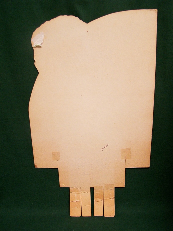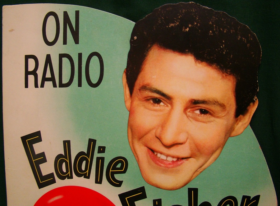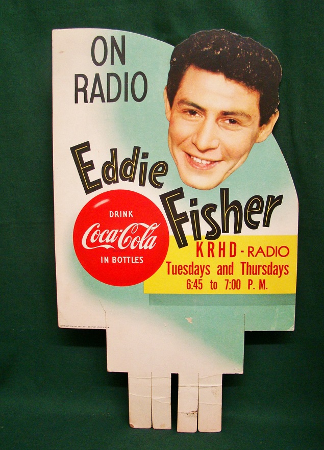 Coca Cola Carton Topper Eddie Fisher 6 Pack. This is a 1954 diecut cardboard carton display sign with an image of Eddie Fisher’s smiling face and the Coca Cola button emblem. It is inscribed “On radio, Eddie Fisher, KRHD – Radio, Tuesdays and Thursdays 6:45 to 7:00 P.M. This type of advertising was given to the grocery store owner to put on one of their 6 pack cartons to advertise the local Eddie Fisher program. It is in excellent condition a small tear at the base and a tack hole at the top. It is unusual to find in this condition, as you can see the head is die cut and really sits up above the cardboard. We have shrink wrapped it on green foamboard for protection and a great color background. 6202-89ETP