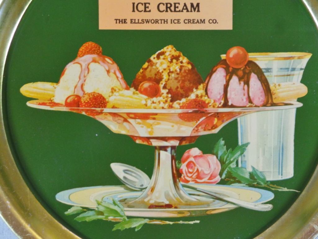 Ice cream trays were a great way of advertising during the soda fountain days. Ice cream companies distributed these trays to local soda fountains with their ice cream brand name along with a cool picture that grabbed the customer’s attention. This tray features a huge banana split just waiting for you to dig in! “Enjoy Perfection Ice Cream” and “The Ellsworth Ice Cream Co.” is above the banana split in a rectangle box. This tray is a round tray, unlike the square trays you see so often. Some minor nicks on the outer lip of the tray with a few small chips on the face of the tray. A small scratch is at the very bottom of the face of the tray. The back is in great shape with just a small dent that is hard to see on the front. Great colors and amazing graphics that will a great addition to your collection. 18450-QWT
