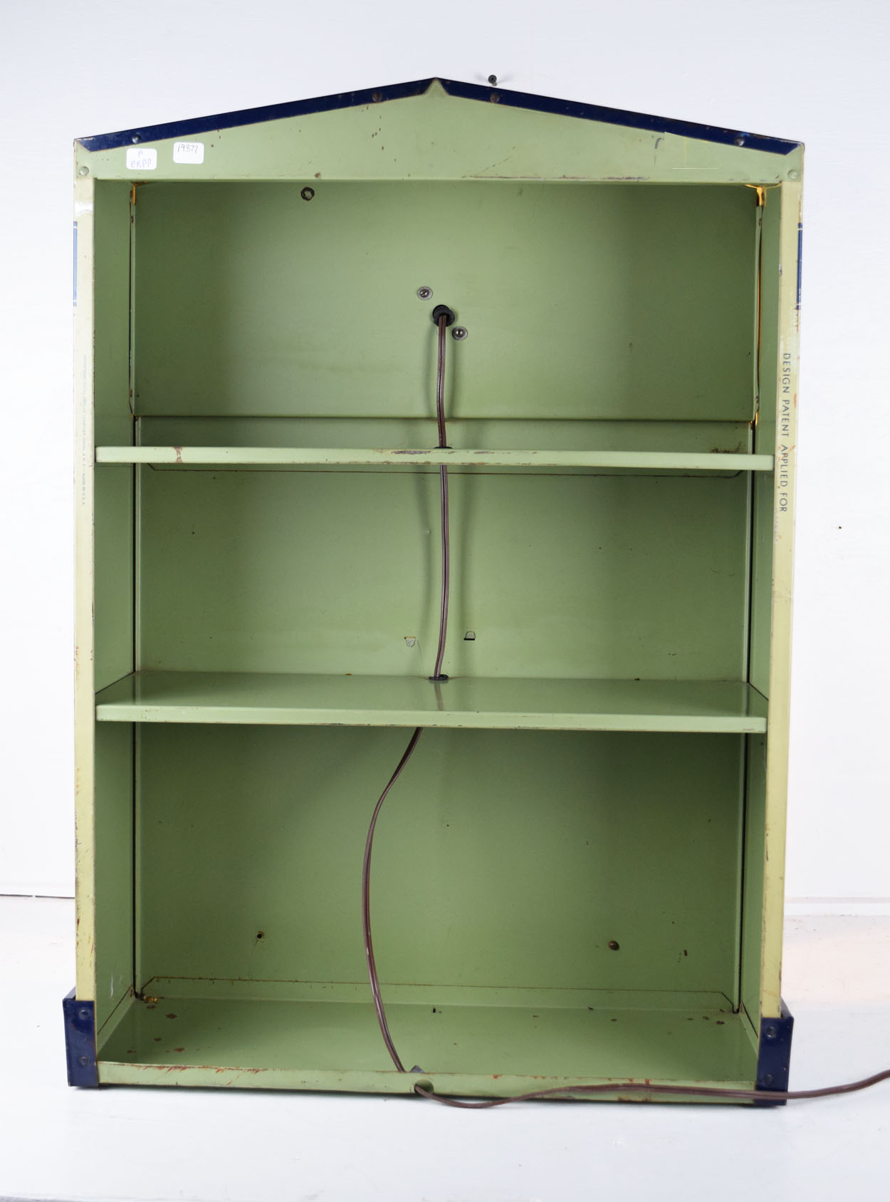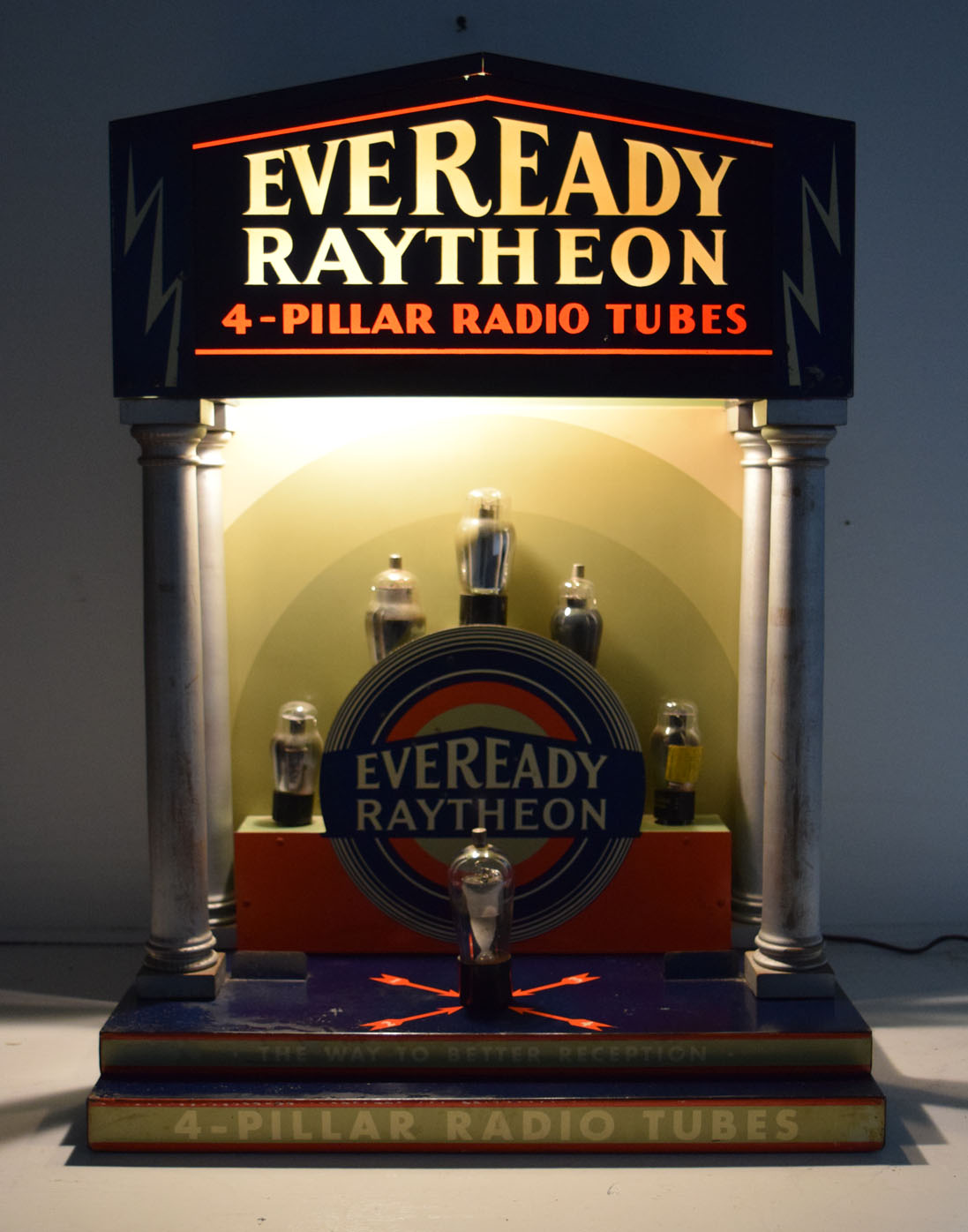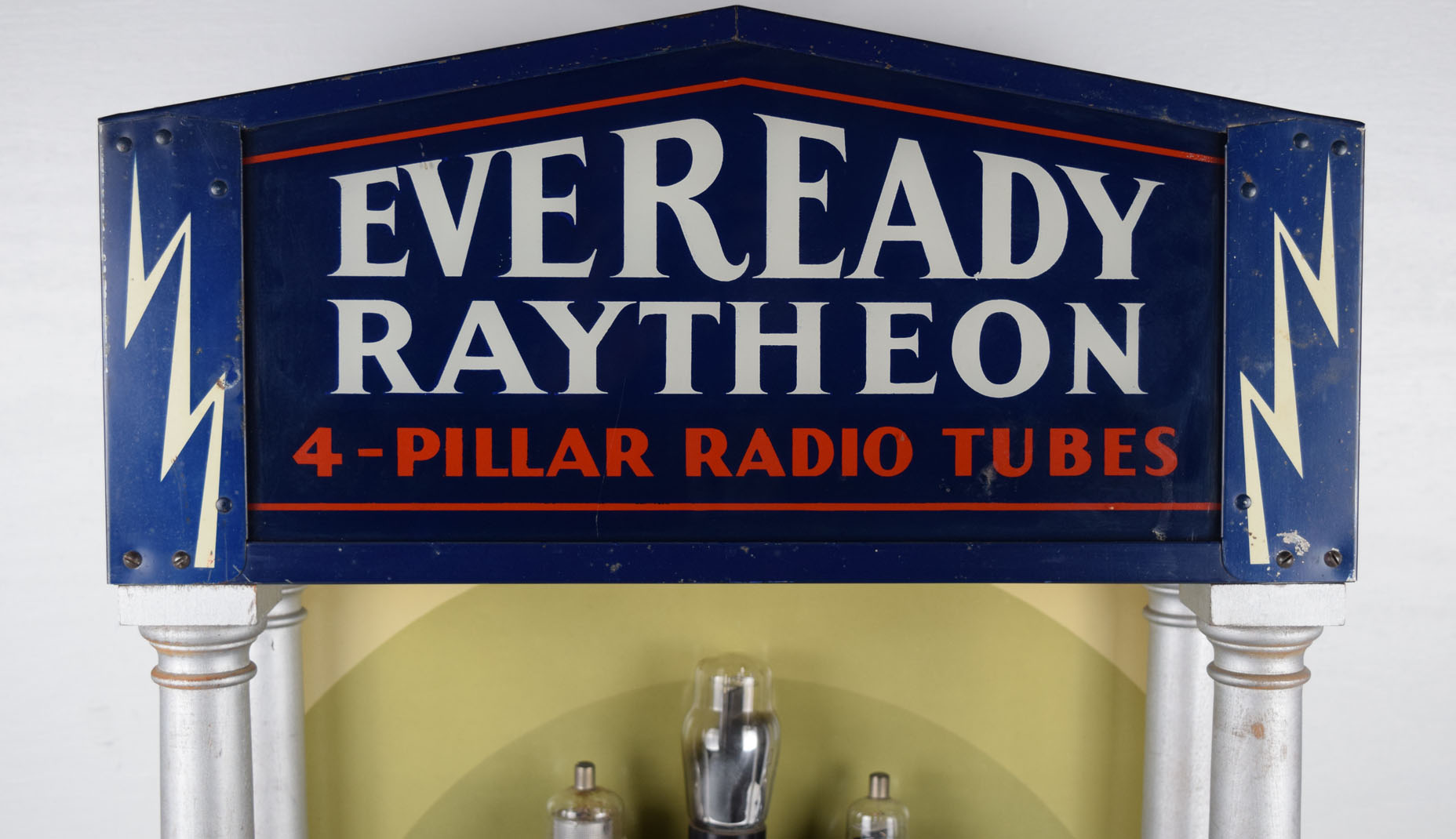 In 1929 the National Carbon Company (Eveready batteries) entered into an agreement with Raytheon to be the sole distributor of Raytheon tubes and the brand name was changed to Eveready Raytheon. This ultra rare store display is promoting Eveready’s advanced four pillar radio tubes with a light up four pillar building! When plugged in, the light up top showcases five radio tubes on a stair step display while the front bulb is surrounded by four arrows promoting the four pillars for better radio reception. The bulbs do not cost more, but are more efficient that regular bulbs. The case has metal sides with four wooden pillars and a reverse painted glass front. The back has three shelves for the storeowner to store the radio tubes with ease. Some minor scratches are in various places on the display, with some chips in the paint from years of use. It measures twenty-six inches tall by eighteen and a half inches wide by seventeen inches deep. A perfect addition to your vintage radio display! This is an oversized shippable item. Please contact us for shipping quote. 19377-ERPP