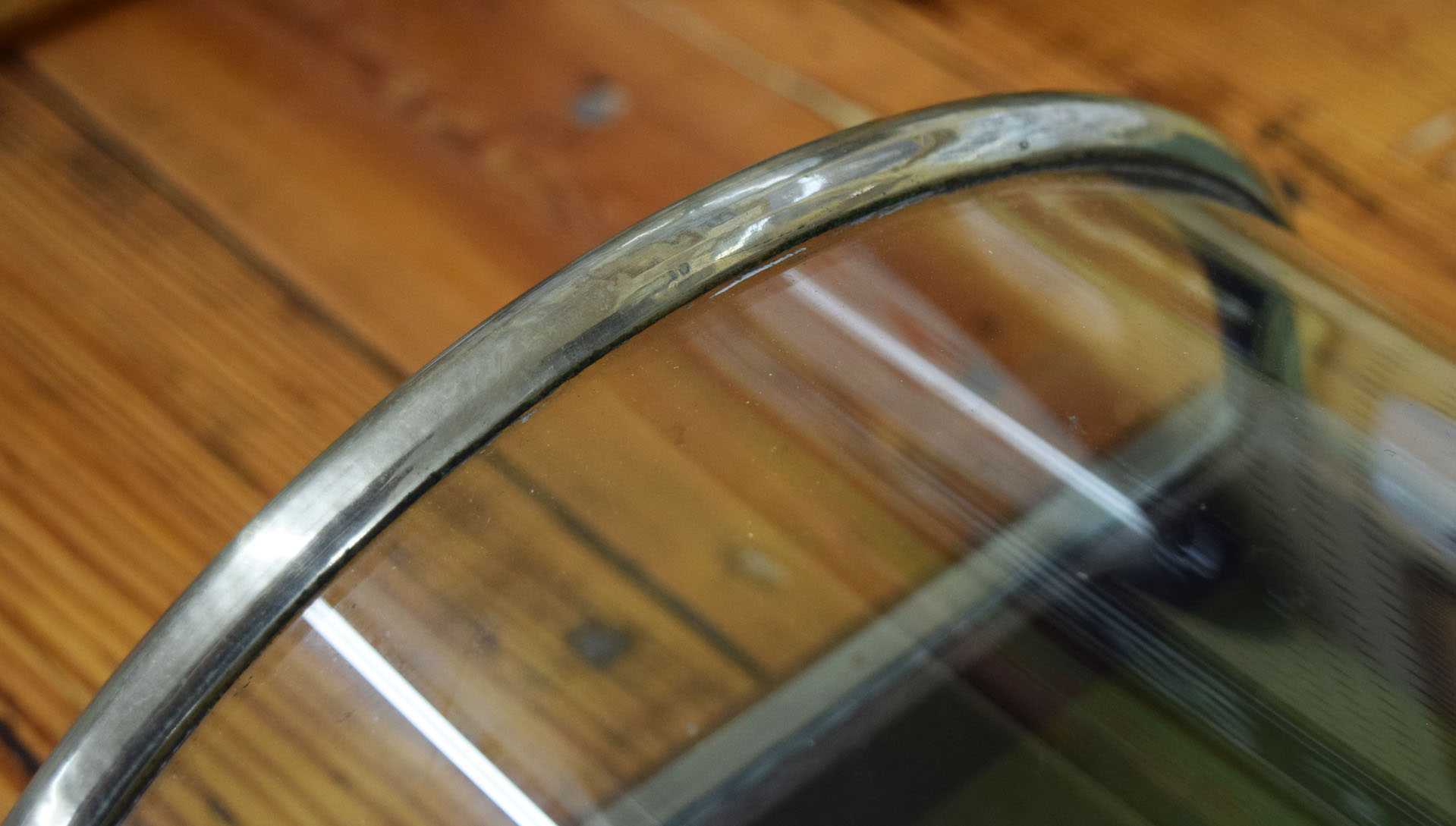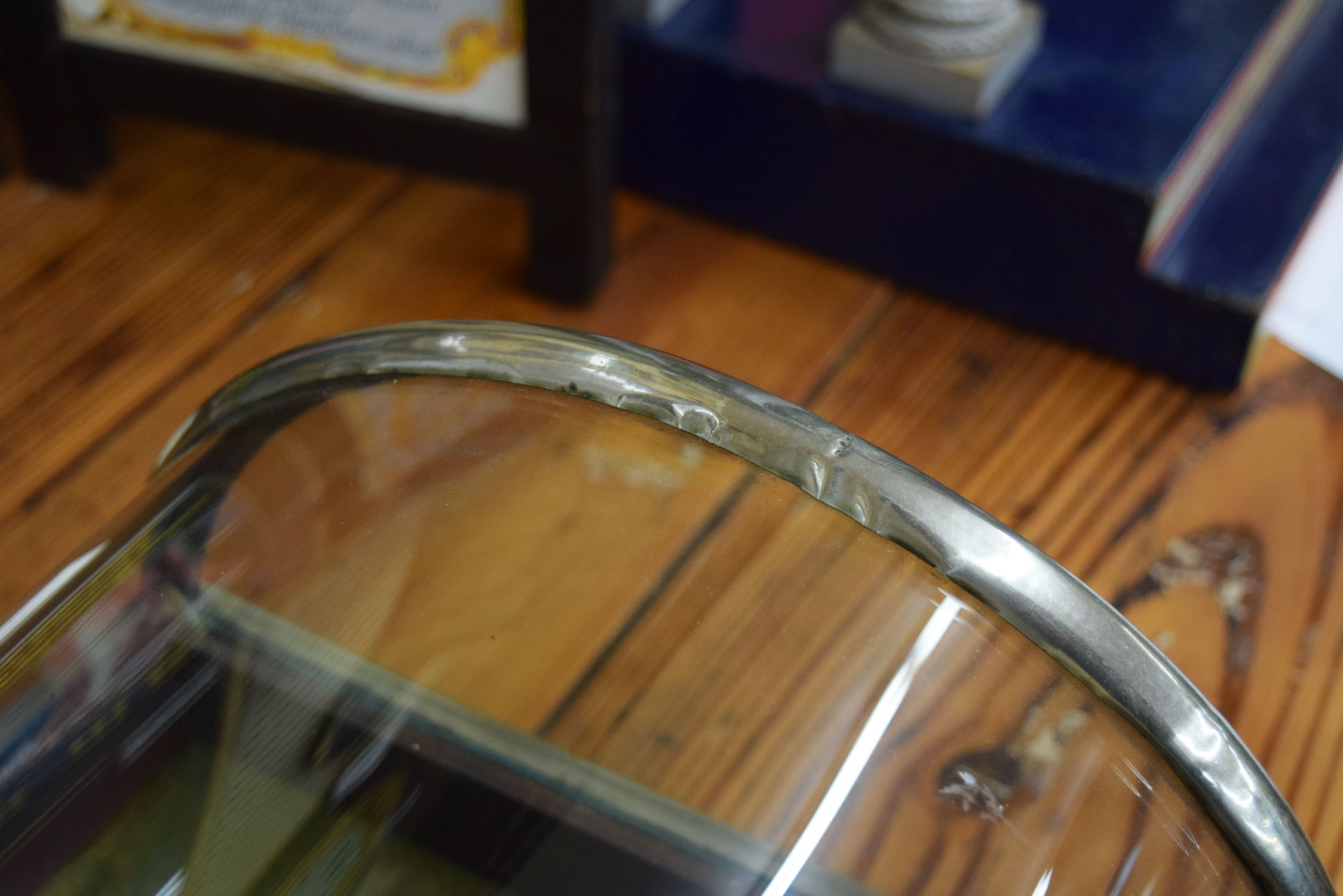 Made by Schwanbech Brothers, this eyebrow type showcase boasts an walnut base beneath it’s beautiful curved glass exterior. As was as a beautiful case, it is often known as a gum case. The eyebrow designation is based upon it’s curved shaped top, which is hinged on one side. The outer German silver finish looks amazing for it’s age, with just some smaller dents on the top of the curved left side in the bright finish. It is complete with the original felt interior and all original glass top and sides. The front is marked “Pat’d. March 11, 1879” on a small marker. This smaller showcase will give you a very nice way to display your smaller collectibles with a size of twenty-seven and a half inches long by fourteen and a half inches wide. The curved glass top sits seven and three-quarters inches tall when closed. This is an oversized shippable item. Please contact us for shipping quote. 19646-QTPP