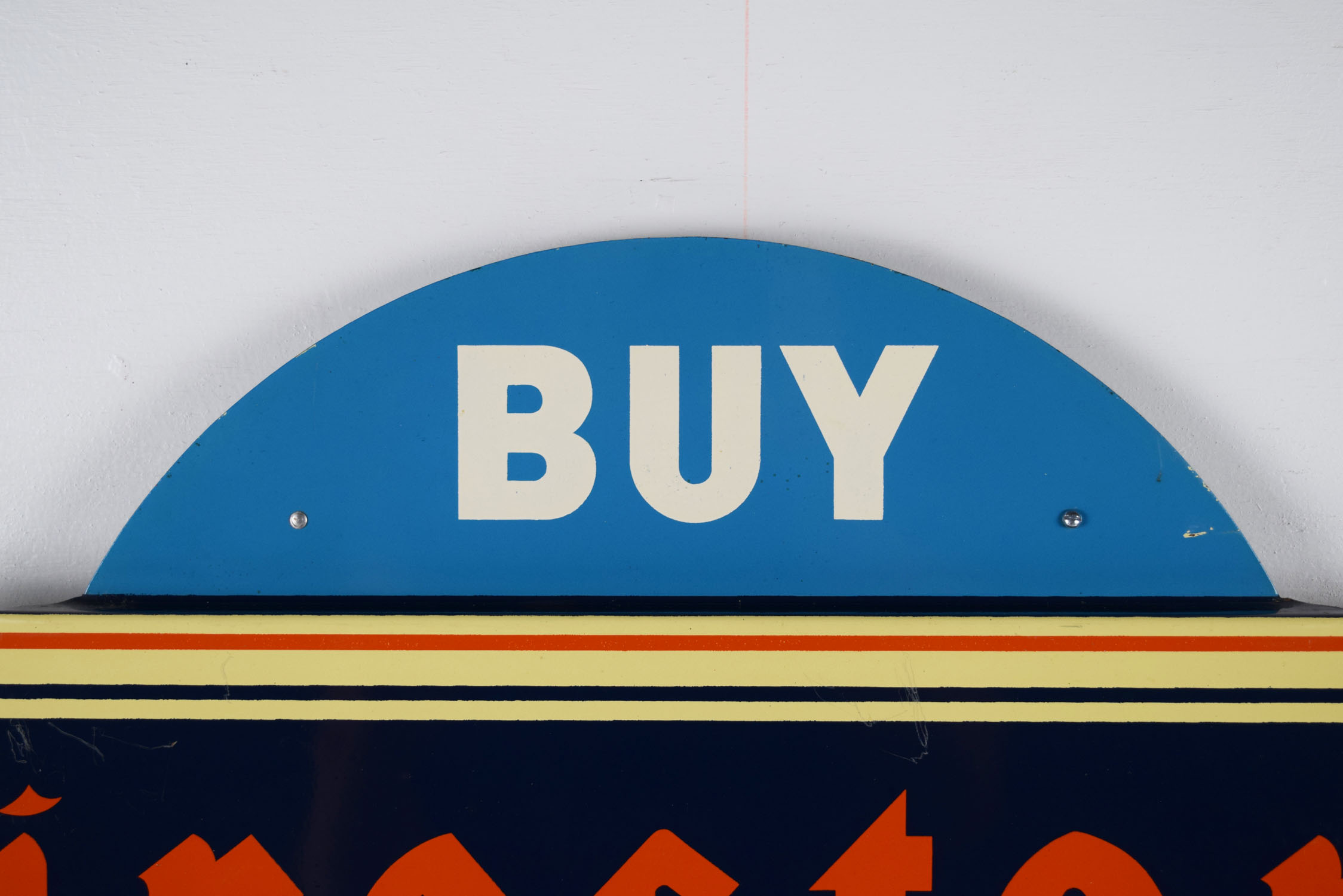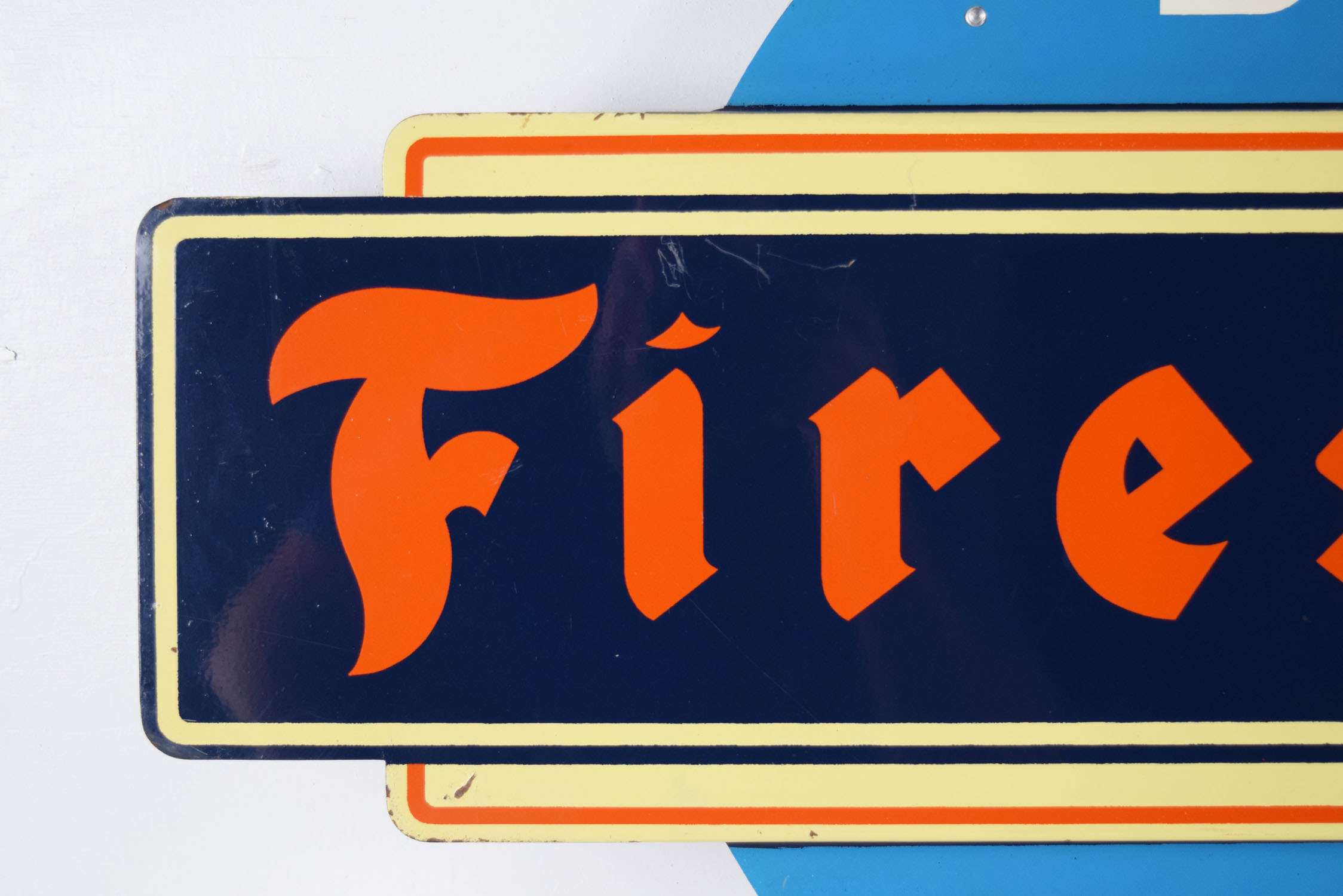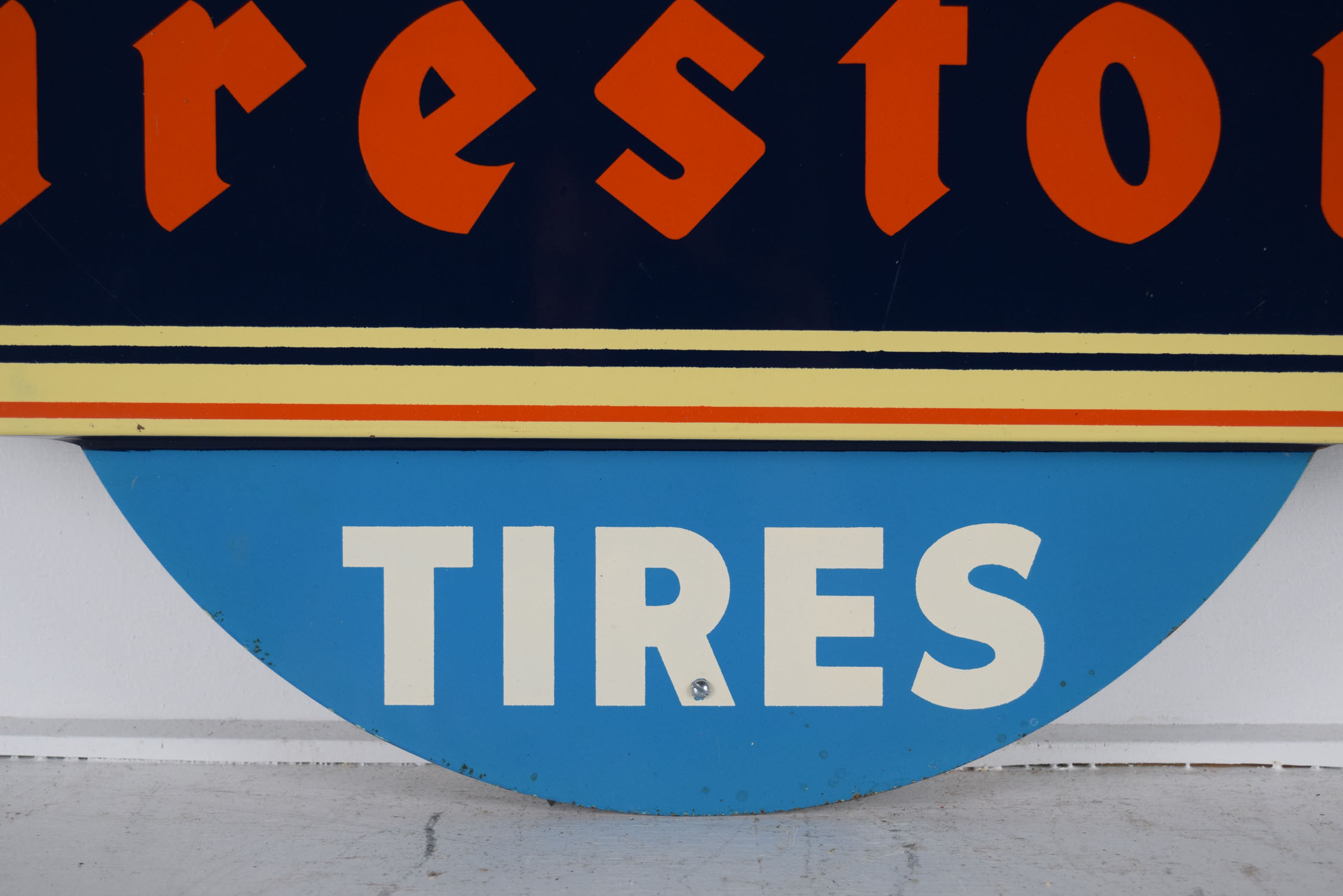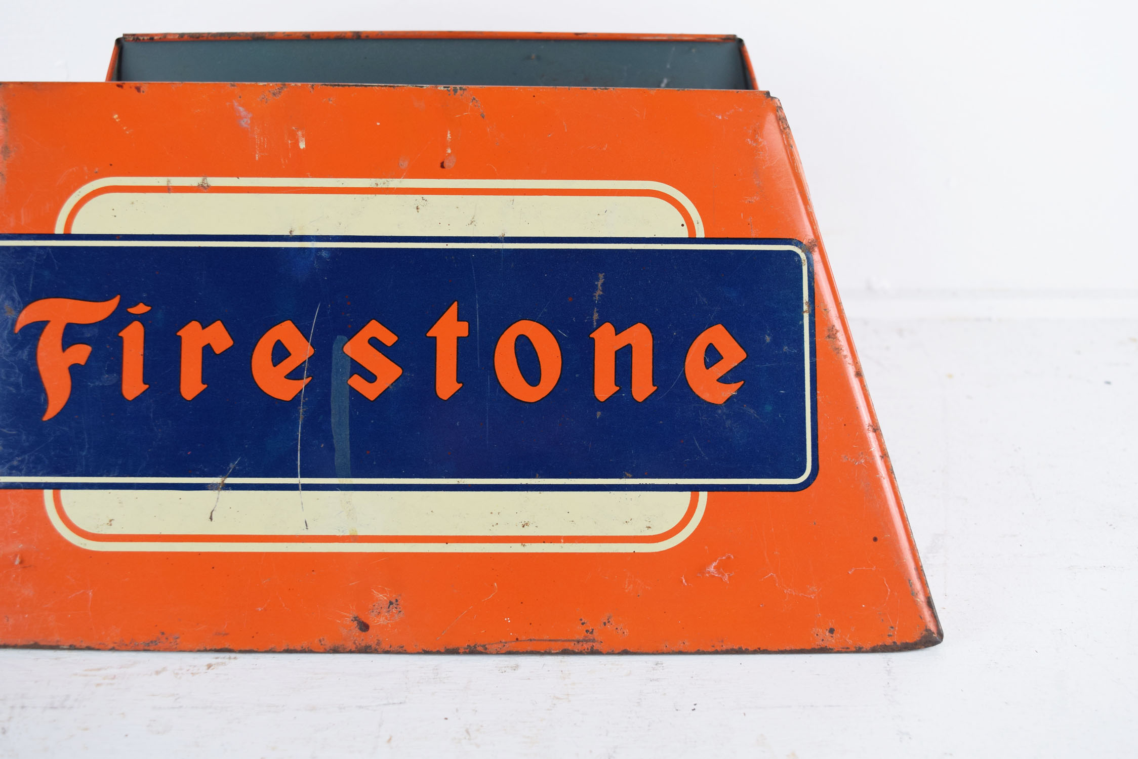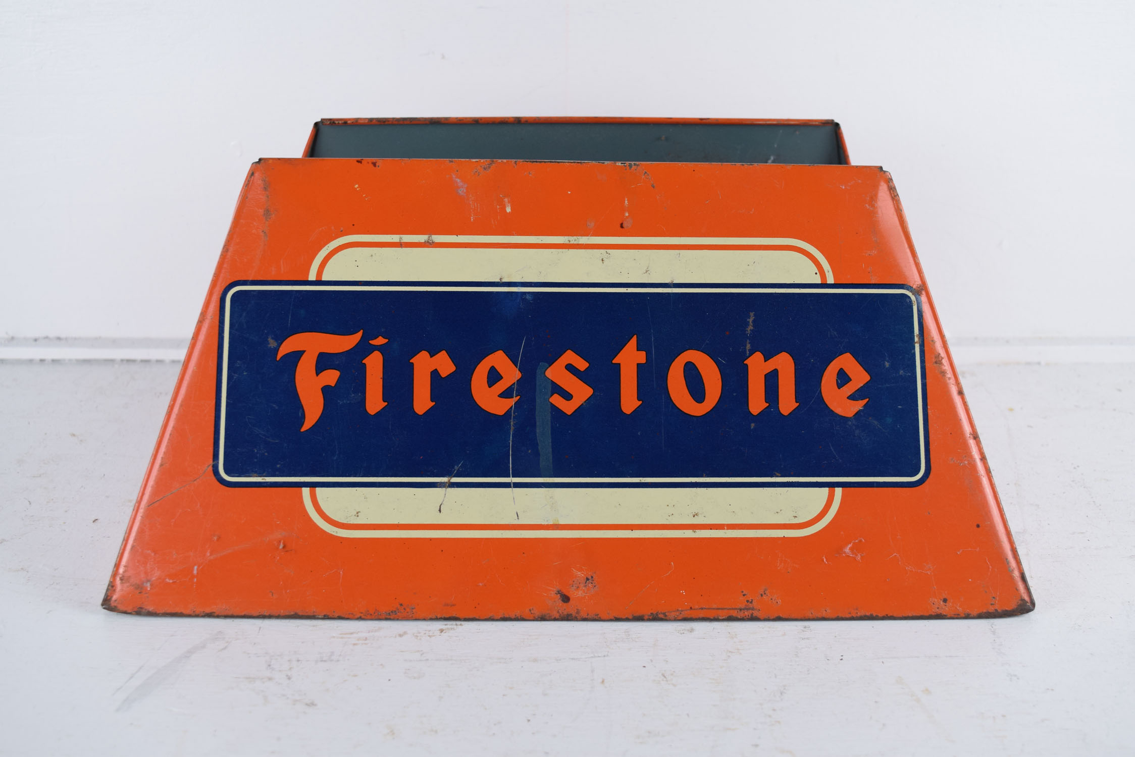 A staple in your local service station in the 1940’s, this super nice Firestone tire display is complete with the original white wall Firestone Deluxe Champion tire with tube, the period correct metal tire stand, plus the “Buy Firestone Tires” tire insert. The stand has great colors on each side, with typical scratches and light paint loss from use over the years. Some surface rust can be seen on the inside as well. It measures 15 inches long by 7 inches tall and 11.5 inches wide. The tire insert carries the same colors as the tire stand, and is held in place by three metal clips that grip the inside of the tire. A few scratches can be seen on the face of the insert with some light paint loss as well. Some surface rust is on the inside as well, and the bottom clip has been replaced. It measures 28.5 inches wide by 17.5 inches tall. Great piece for your service station display! This is an oversized shippable item. Please contact us for shipping quote. 19738-QTRP