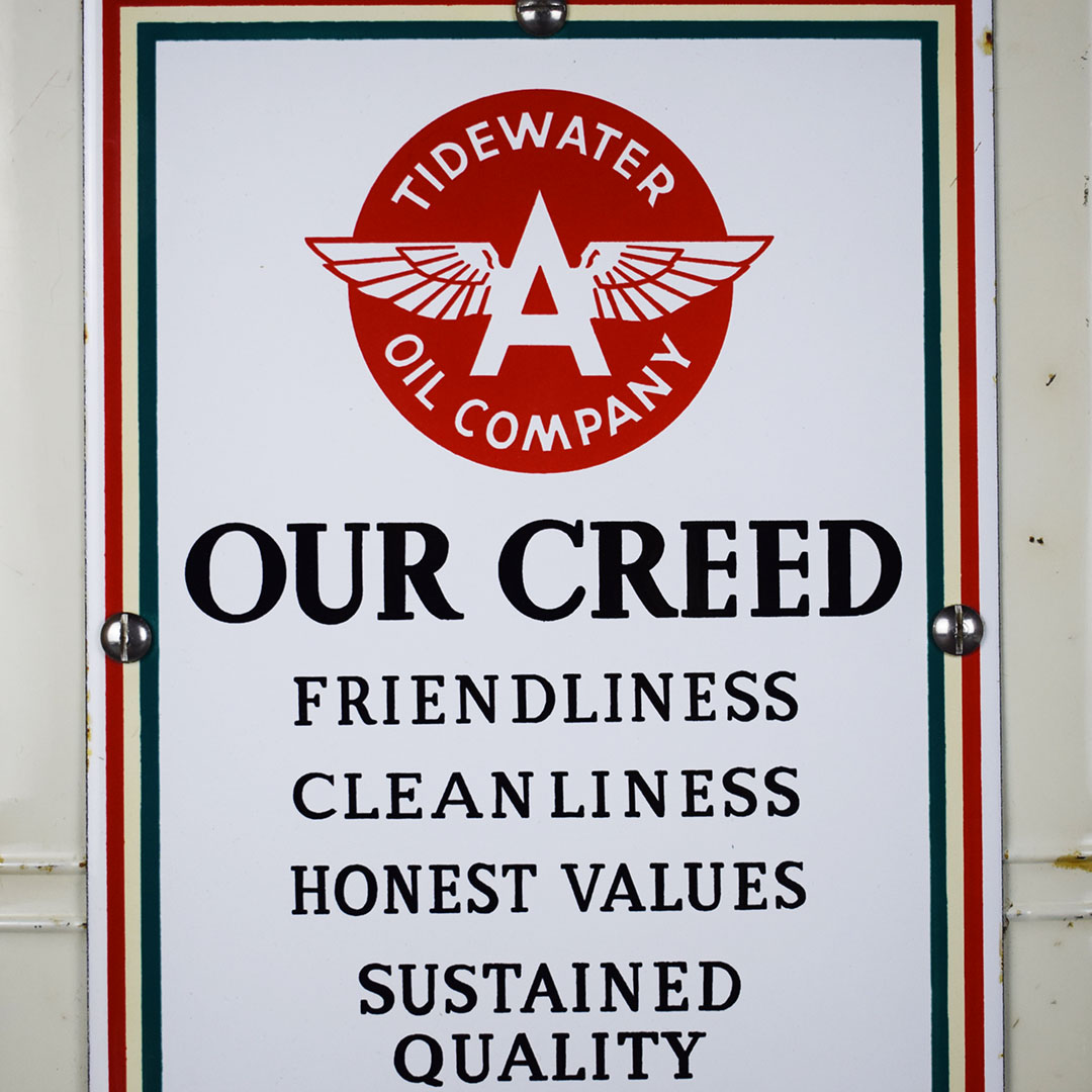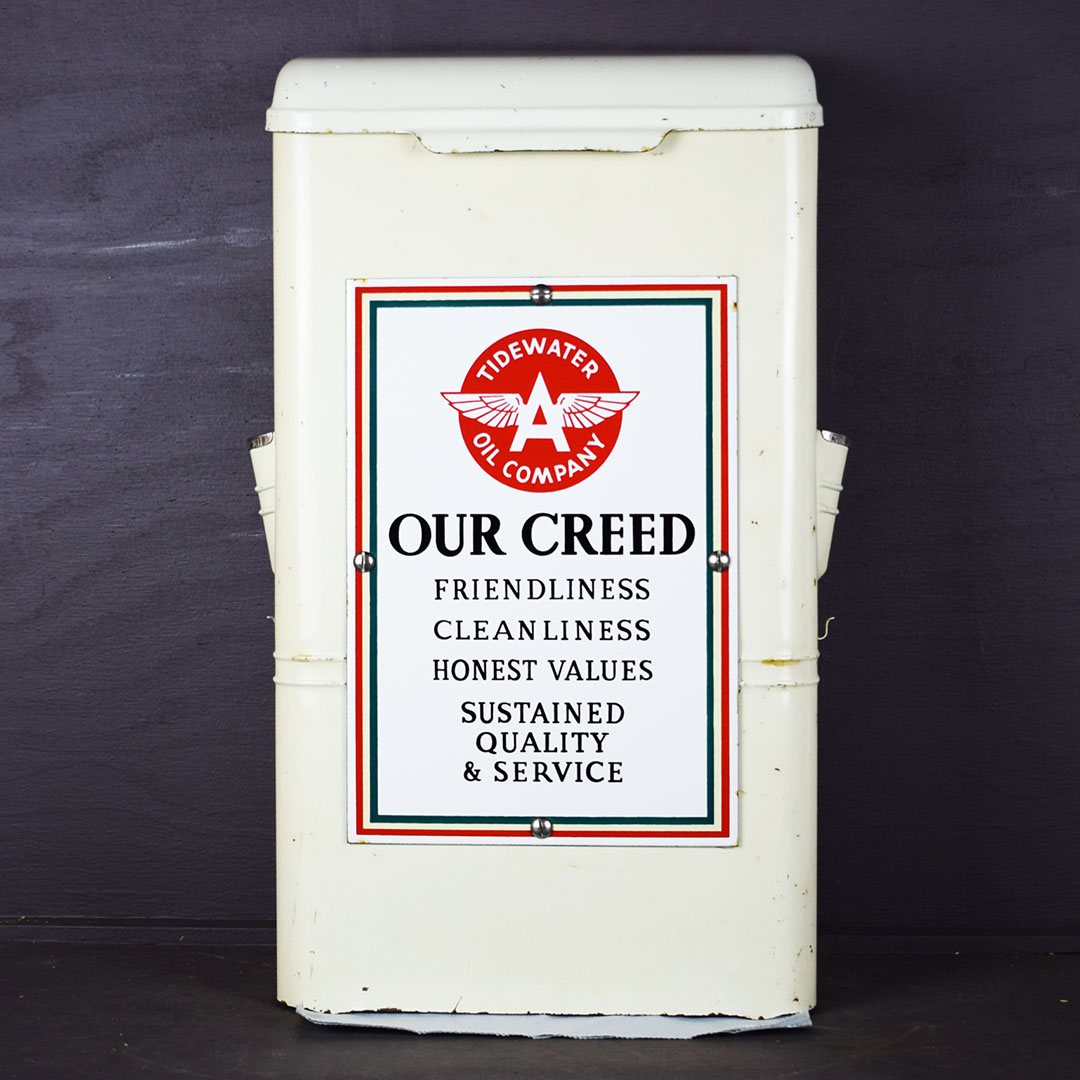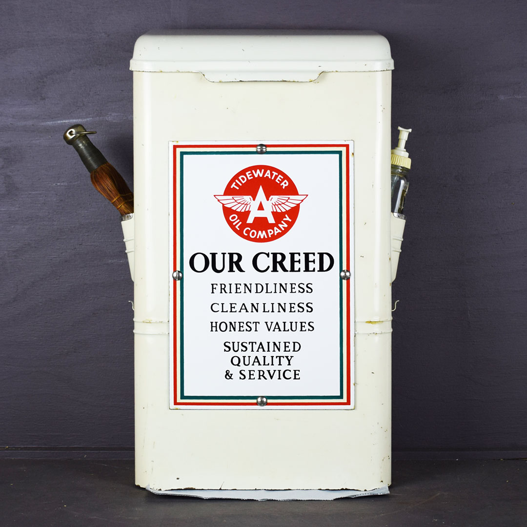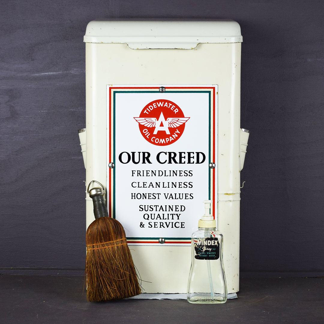 Add Windex to the glass spray jar, and you are ready to start your service station! You need a few more things, but this towel dispenser cabinet will look right at home in your gas and oil collection. The metal cabinet is ready to work with a towel dispenser at the bottom, bottle holders on each side, a small hook for a whisk broom to hang, and a flip top to store extra boxes of paper towels. The front of this cabinet features a Flying A Tidewater Oil Company porcelain sign, which displays the company’s creed. The colors and gloss of the sign are sharp, with a few chips around the outer edge. The sign rates a 9 on a ten-point scale. The metal towel case is in excellent condition with original paint and chrome trim around the bottle holders. Some chips on the finish in various places show great patina on this 20-inch tall by 12-inch wide by 6-inch deep cabinet. 21244-QTPP