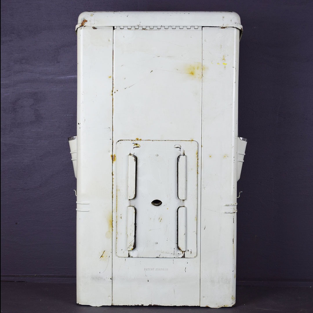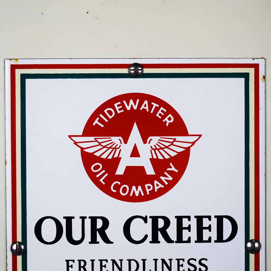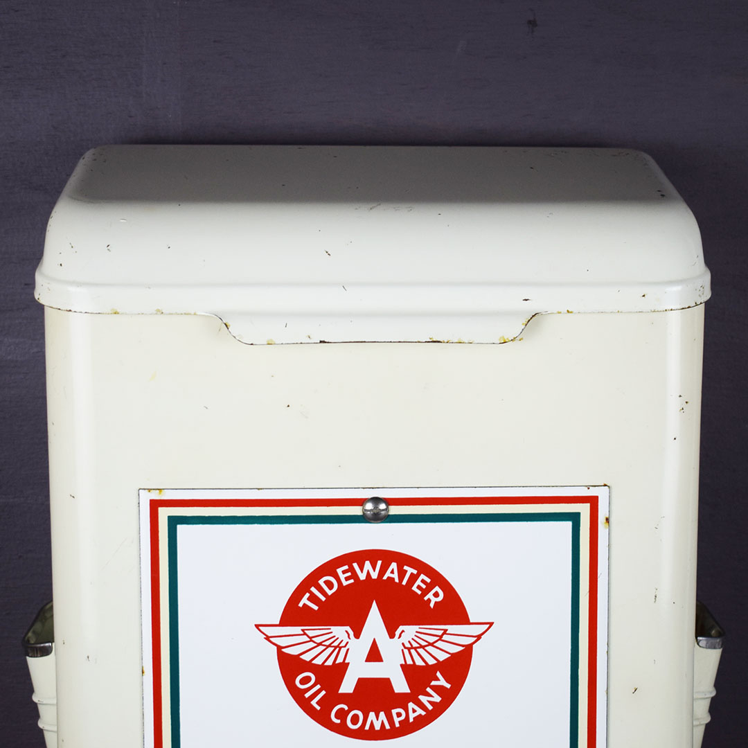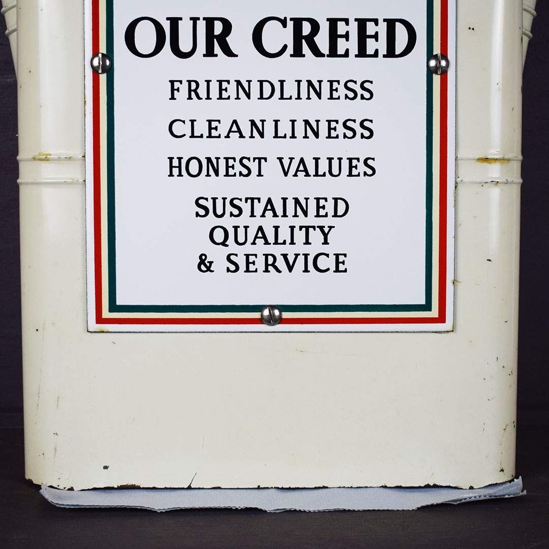 Add Windex to the glass spray jar, and you are ready to start your service station! You need a few more things, but this towel dispenser cabinet will look right at home in your gas and oil collection. The metal cabinet is ready to work with a towel dispenser at the bottom, bottle holders on each side, a small hook for a whisk broom to hang, and a flip top to store extra boxes of paper towels. The front of this cabinet features a Flying A Tidewater Oil Company porcelain sign, which displays the company’s creed. The colors and gloss of the sign are sharp, with a few chips around the outer edge. The sign rates a 9 on a ten-point scale. The metal towel case is in excellent condition with original paint and chrome trim around the bottle holders. Some chips on the finish in various places show great patina on this 20-inch tall by 12-inch wide by 6-inch deep cabinet. 21244-QTPP
