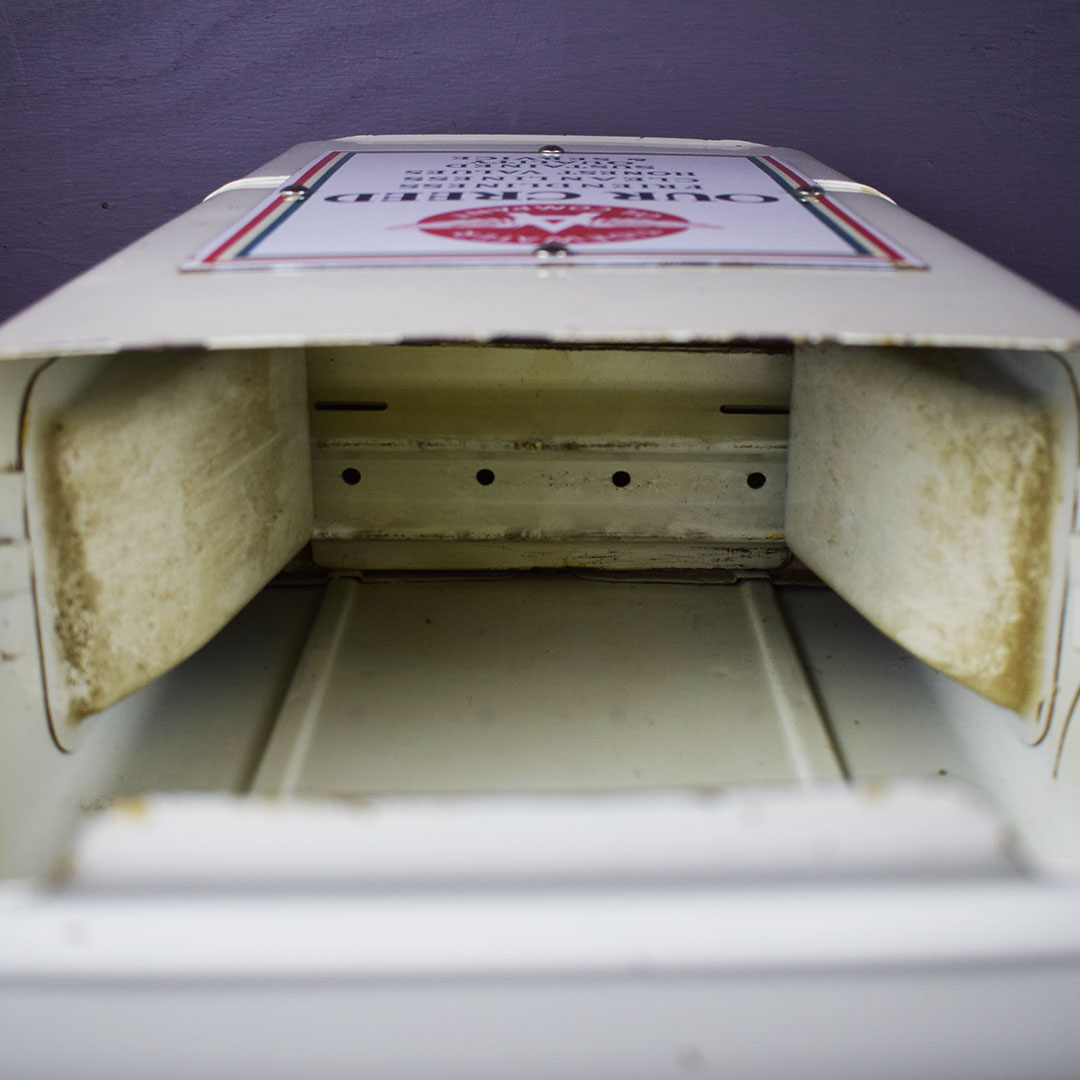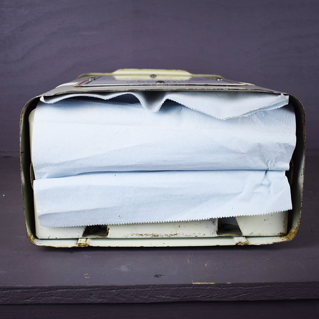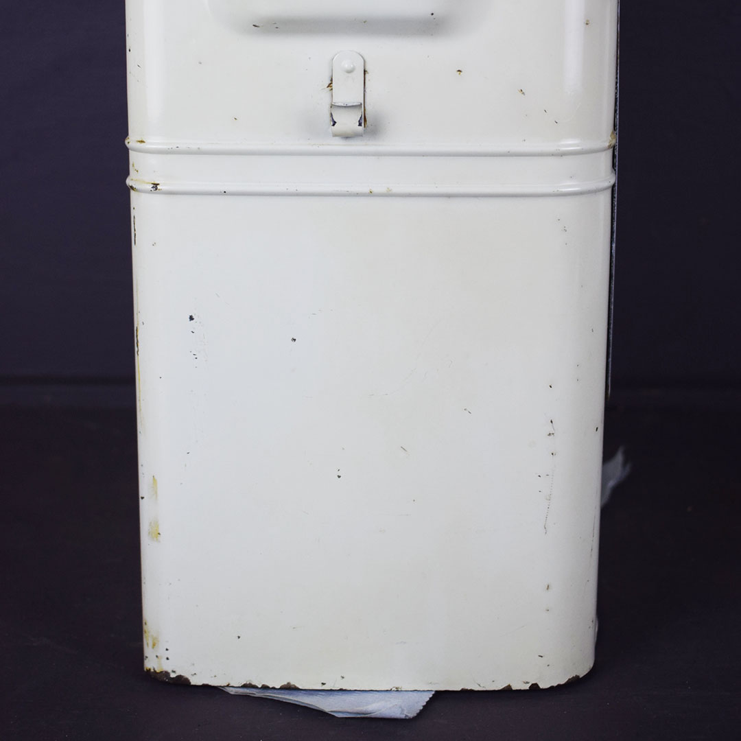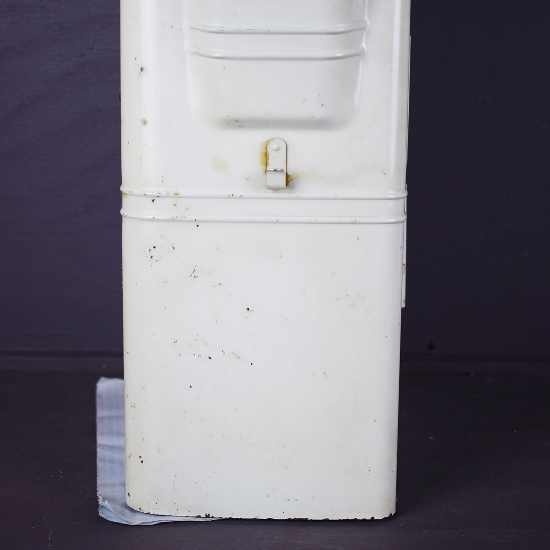Add Windex to the glass spray jar, and you are ready to start your service station! You need a few more things, but this towel dispenser cabinet will look right at home in your gas and oil collection. The metal cabinet is ready to work with a towel dispenser at the bottom, bottle holders on each side, a small hook for a whisk broom to hang, and a flip top to store extra boxes of paper towels. The front of this cabinet features a Flying A Tidewater Oil Company porcelain sign, which displays the company’s creed. The colors and gloss of the sign are sharp, with a few chips around the outer edge. The sign rates a 9 on a ten-point scale. The metal towel case is in excellent condition with original paint and chrome trim around the bottle holders. Some chips on the finish in various places show great patina on this 20-inch tall by 12-inch wide by 6-inch deep cabinet. 21244-QTPP