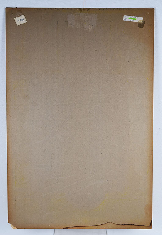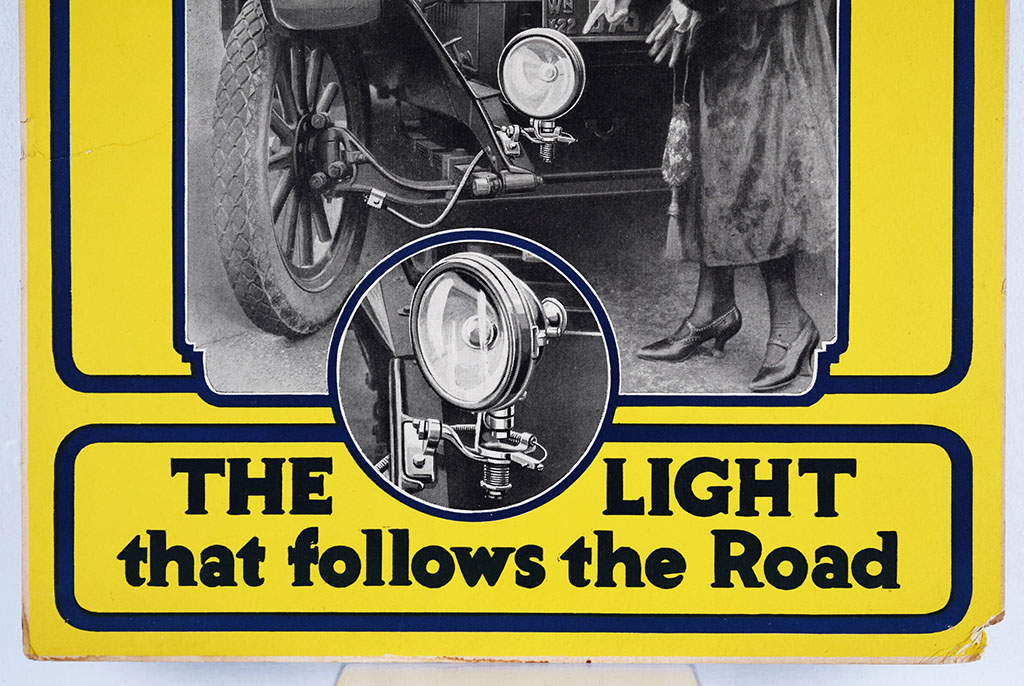 By using an additional light that actually moved when you turned the steering wheel, the automobile driver was able to see exactly where he was going and what was ahead. This framed cardboard sign shows potential customers how the light bracket works with the tag line “The Light that follows the Road” below. The colors are great on this 21.25″ x 14″ cardboard sign, with just some typical outer edge wear. The right lower corner has some minor damage, with material missing and some slight wrinkles. A small pin hole can be seen in each outer corner from display. Super nice item from the early days of automobile transportation. 20351-EYP
