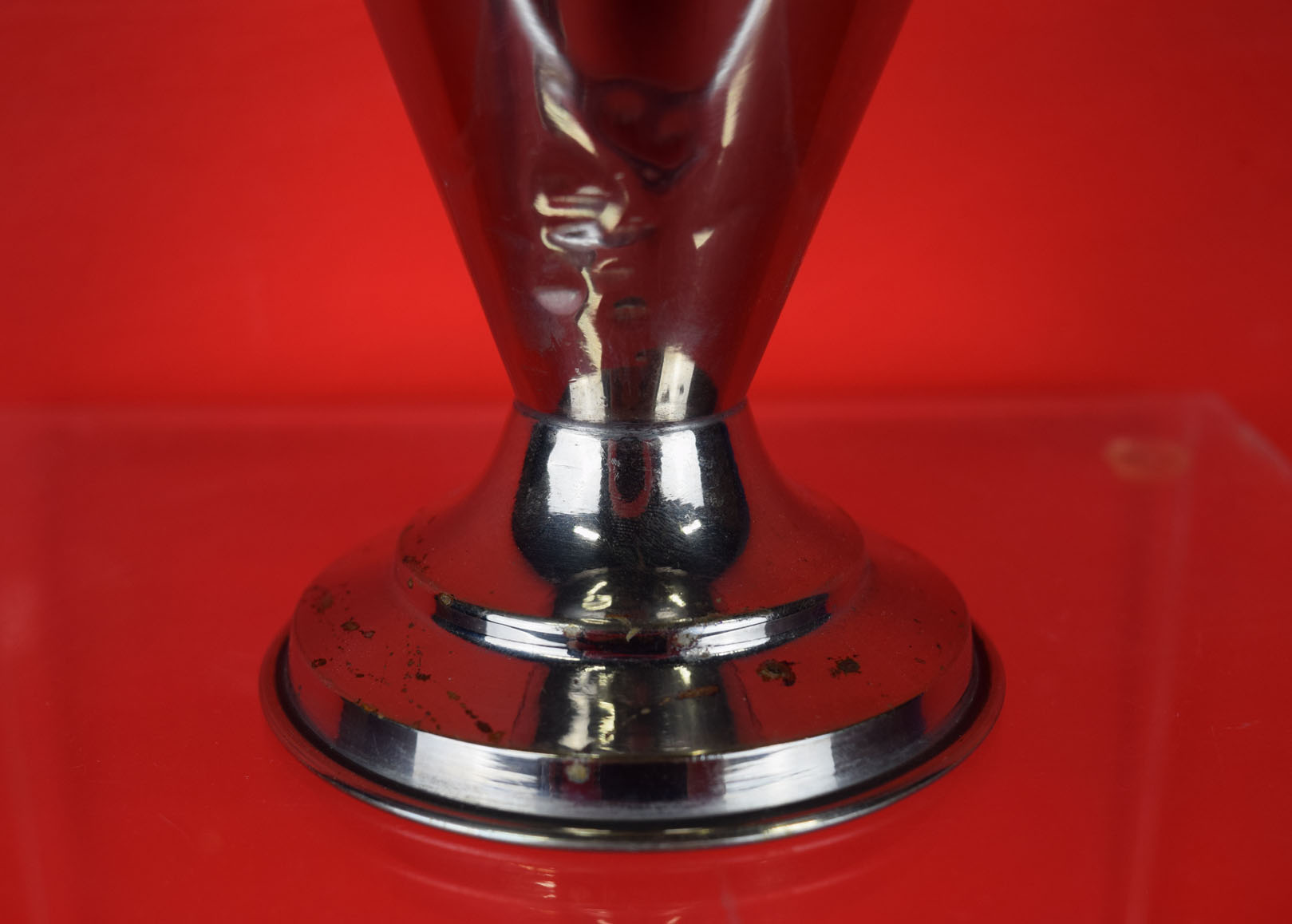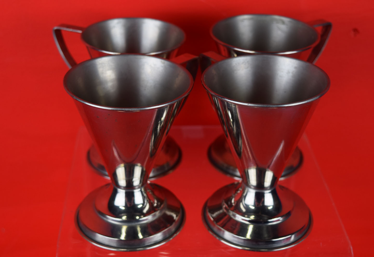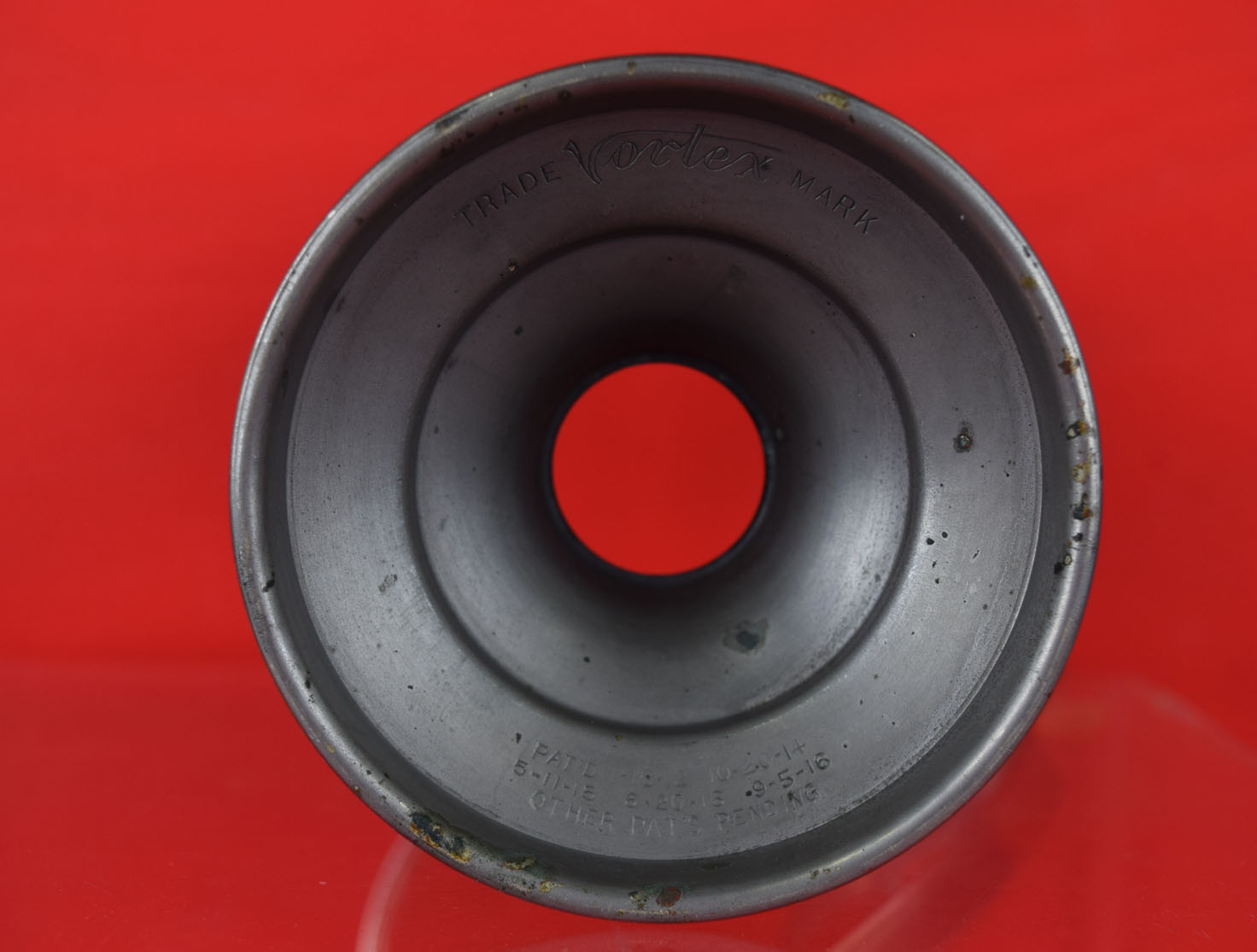 Dating from the early 1900’s, these metal holders would have been used regularly in your local ice cream parlor or soda fountain. Ice cream would have been dipped into a paper cone and then the paper cone would have been dropped into these metal holders for patrons to enjoy! The metal handle on the side kept your hands from getting cold, and when you were done, the paper cone was tossed and these cup holders were rinsed and ready for the next patron! Each one is marked “Vortex” with “Trade Mark” on each side. It has patent dates also stamped, with years ending in “12, 14, 15, 16”. All four are in great shape and could be polished if desired. 19296-QP