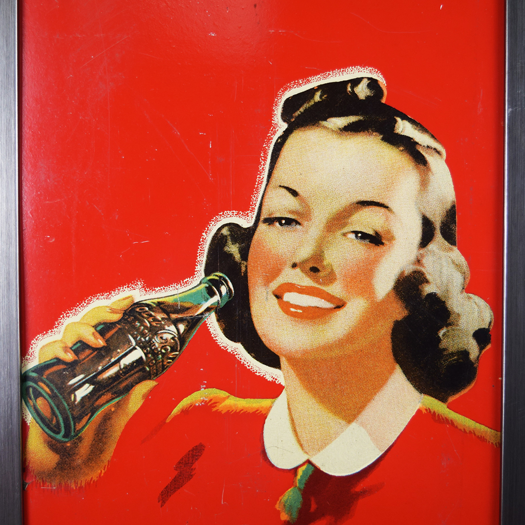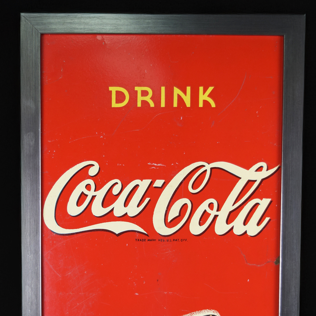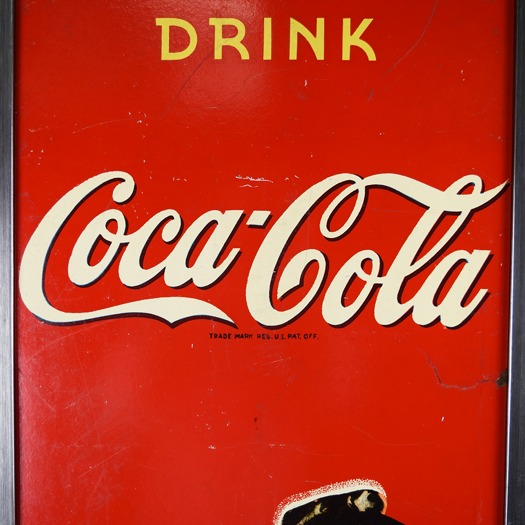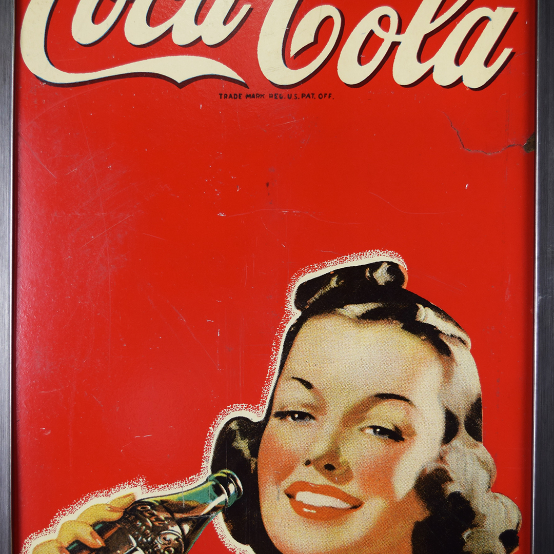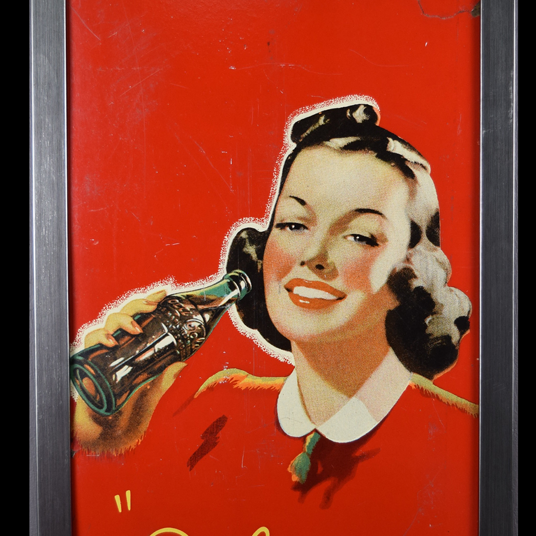 During World War II, metals were needed for military purposes, so sign makers had to adjust the materials that they used. Before the war, all signs were made of tin and other metals, so manufacturers now had to use different materials. Masonite was the choice for Allen Morrison and Coca-Cola on this vertical sign, which features a lady enjoying a bottle of Coca-Cola. The Masonite sign has had a frame added at some point, which allows you to display it nicely in your collection. Minor chips with paint loss are evident on the sign’s face in various places. A few cracks in the Masonite are seen as well. The larger one measures about 3 inches and is on the right side of the sign. A 2-inch one is along the top edge, and a small chip is seen on the left side near her wrist. We do not see any signs of touch-up work, and the gloss is sharp on this 1940s sign. The outer frame measures 52.5 inches tall by 17.75 inches wide. 21567-UEP